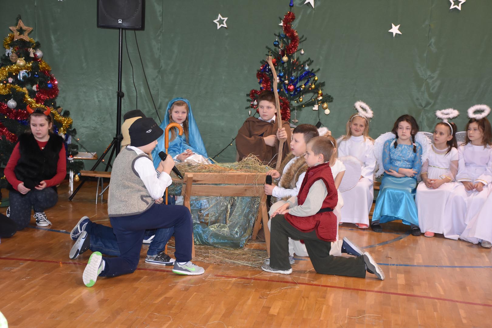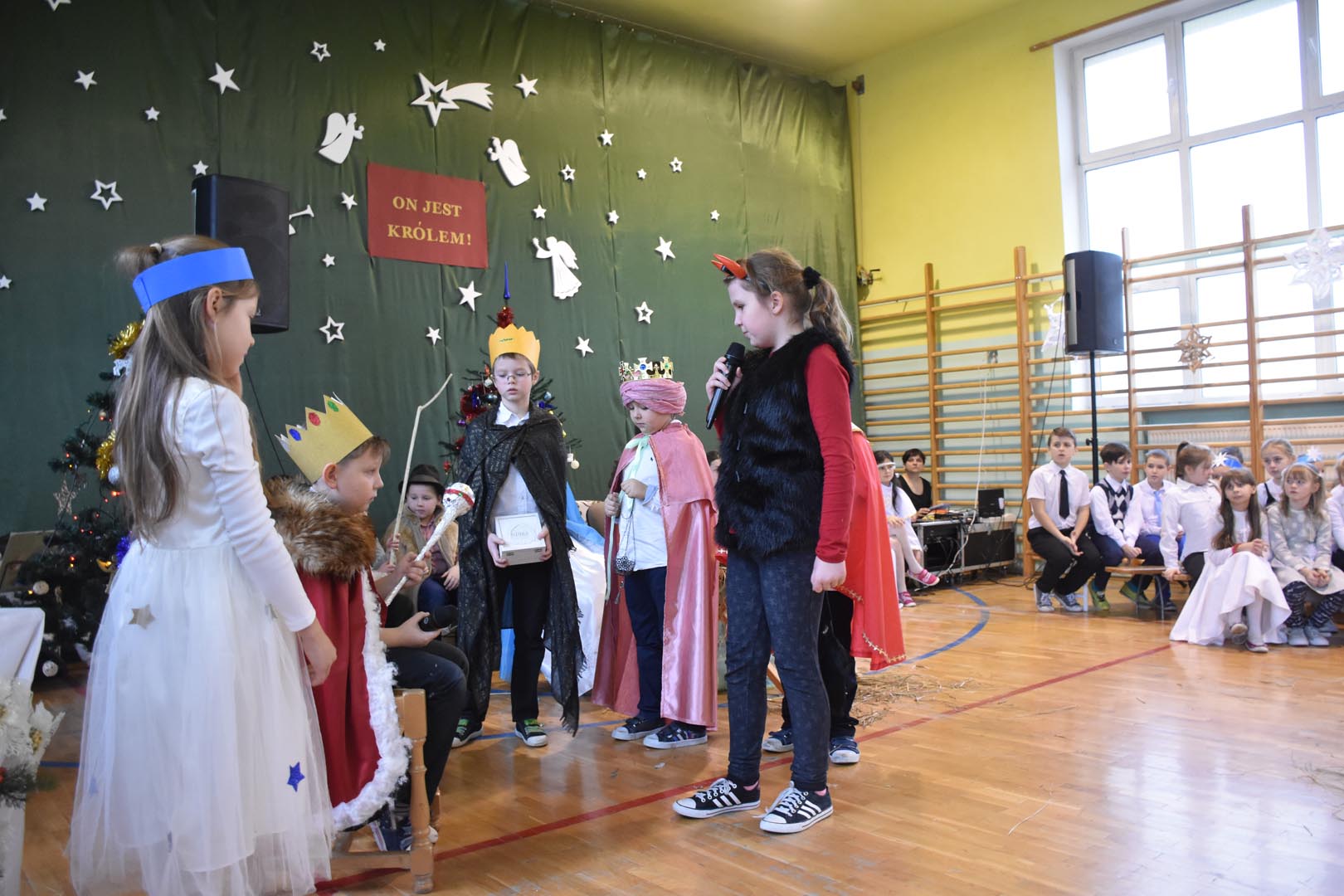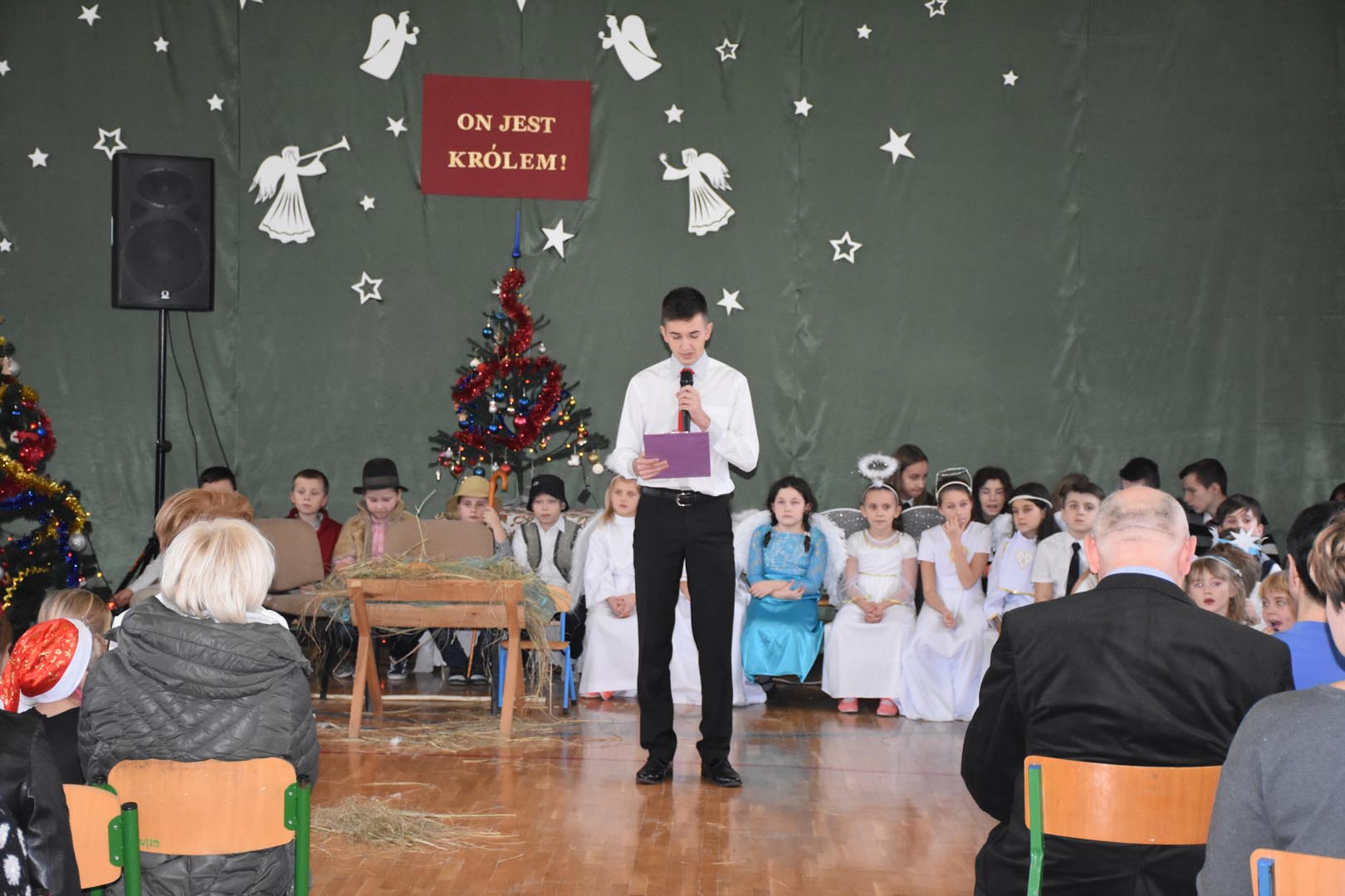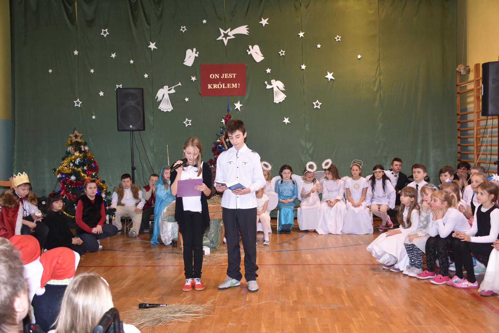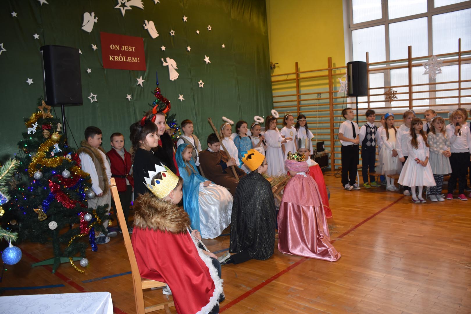 20 grudnia uczniowie, rodzice i pracownicy Zespołu Szkół oraz zaproszeni goście uczestniczyli w niezwykłym widowisku zatytułowanym „On jest Królem”. Widzowie w dużym skupieniu oglądali przedstawienie, które zaprezentowali aktorzy różnych grup wiekowych, od przedszkola po gimnazjum. Tradycyjnie na scenie pojawili się: Maryja, Józef, trzej królowie, pastuszkowie, aniołki i diabełki. Dzieci pięknie śpiewały kolędy i pastorałki. Niecodzienna sceneria, świąteczna muzyka i odświętne stroje pozwoliły zebranym poczuć magię Świąt Bożego Narodzenia.