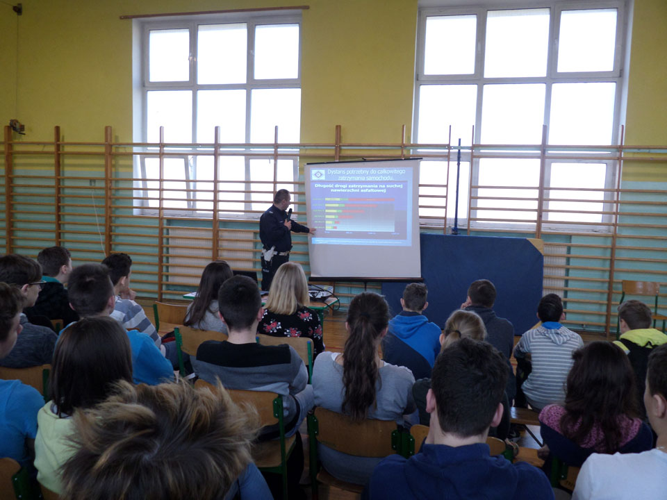 24 lutego uczniowie gimnazjum uczestniczyli w spotkaniu z policjantem, pracującym w Komendzie Powiatowej Policji w Krasnymstawie. Spotkanie dotyczyło przede wszystkim bezpieczeństwa w ruchu drogowym. Przy pomocy przygotowanej prezentacji Gość tłumaczył uczniom jak należy prawidłowo poruszać się po drogach, wskazywał główne przyczyny wypadków drogowych oraz przypomniał prawa i obowiązki uczestników ruchu drogowego.