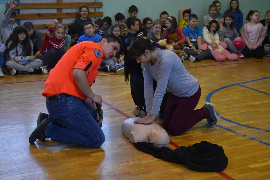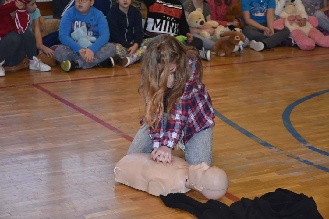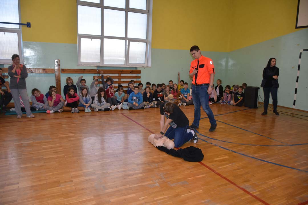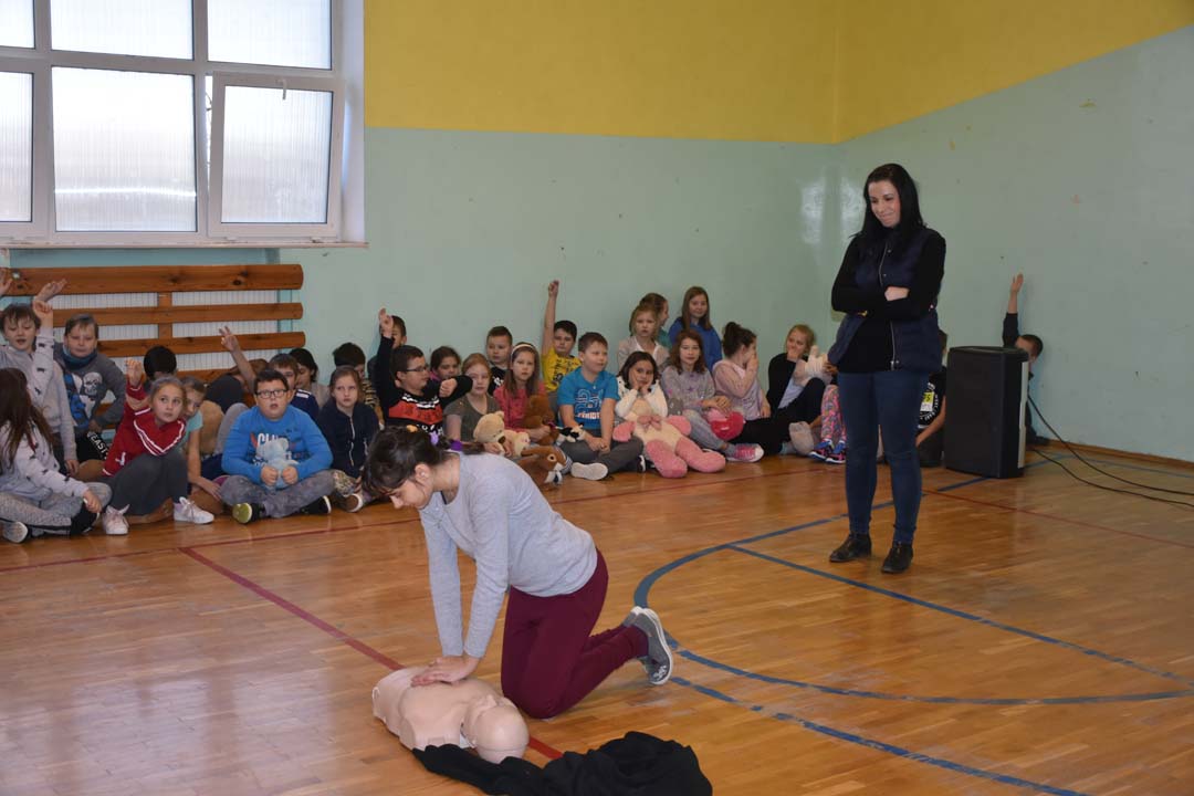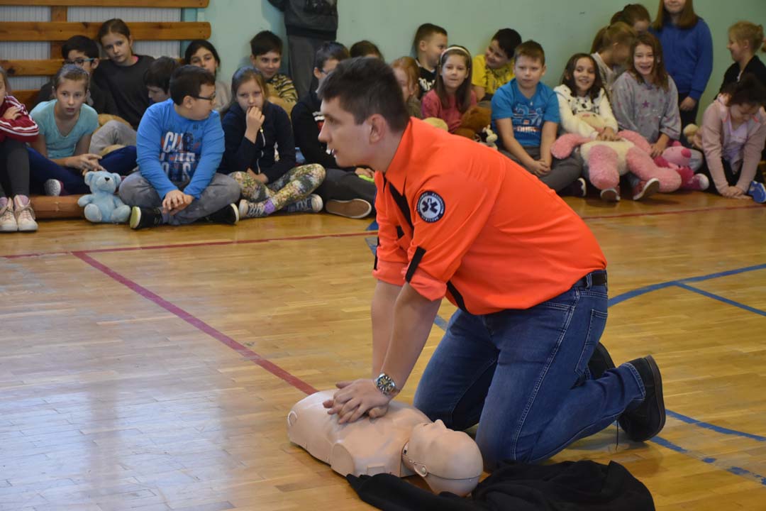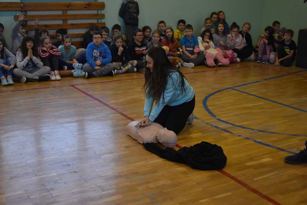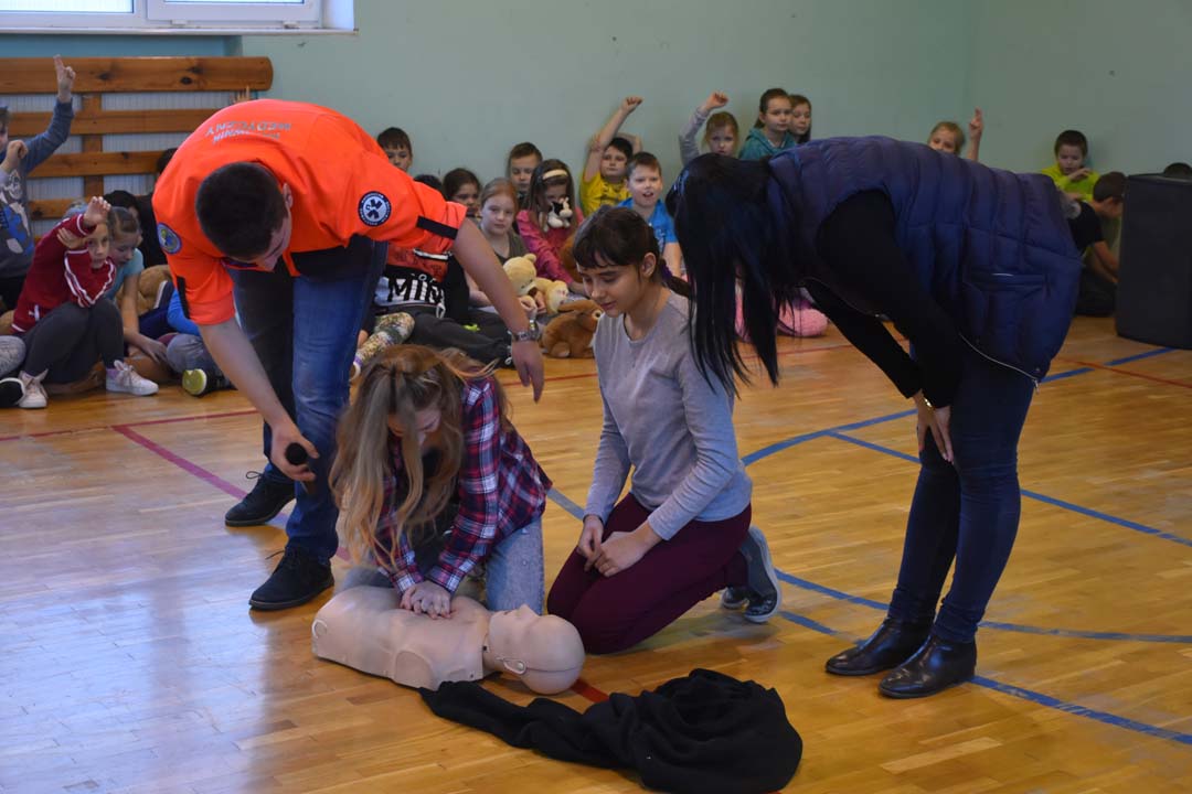 Jak ważne jest udzielenie pierwszej pomocy przed pojawieniem się ratowników, wie każdy. Jednak jak należy postępować w sytuacji zagrożenia, to wiedza, którą warto utrwalać. Dlatego 24 listopada gościł w naszej szkole ratownik medyczny ze stacji ratownictwa z Chełma. W formie warsztatowej poprowadził zajęcia, podczas których uczniowie starszych klas szkoły podstawowej i II gimnazjalnej mogli wykazać się wiedzą i umiejętnościami z zakresu udzielania pierwszej pomocy. Warsztaty łączyły wiedzę teoretyczną z praktycznymi umiejętnościami. Młodzież przećwiczyła ułożenie poszkodowanego w pozycji bezpiecznej oraz reanimację oddechowo-krążeniową. Wszyscy chętnie udzielali odpowiedzi na pytania, które pojawiały się podczas warsztatów. Zajęcia były połączeniem zabawy z przekazaniem bardzo istotnej wiedzy, która może kiedyś uratować czyjeś życie.