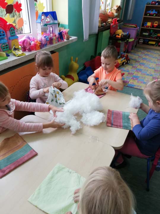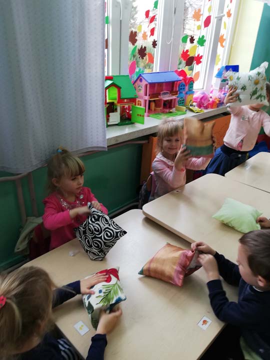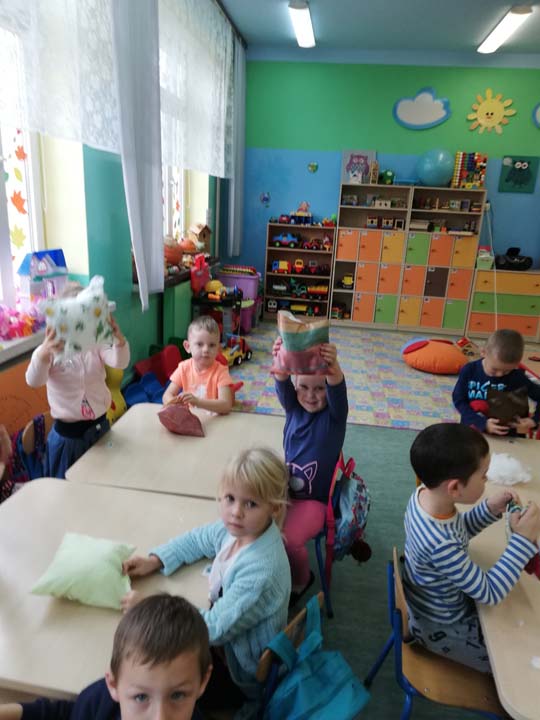 W dniu 25.10 2018r. w grupie III „Słodziaki” odbyły się warsztaty mające na celu poznanie zawodu krawcowej. Mama jednego z wychowanków gr. III pani Agnieszka Kwaśnik zaprezentowała dzieciom pracę krawcowej. Dzieci poznały kolejne etapy szycia spódniczki. Przedszkolaki uczyły się projektowania ubrań, pobierania miary, nawlekania igły i wiązania supełka na nici. Dzieci z zaciekawieniem słuchały i oglądały prezentacje maszyny do szycia. Same w asyście Pani Kwaśnik próbowały szycia ściegiem do przodu i do tyłu. Kolejnym etapem było napełnienie przez dzieci wsadem z gąbki kolorowych poszewek na poduszeczki, które dzieci otrzymały w prezencie. Napełnione poszewki dzieci ozdobiły i zszyły kolorowymi elementami.