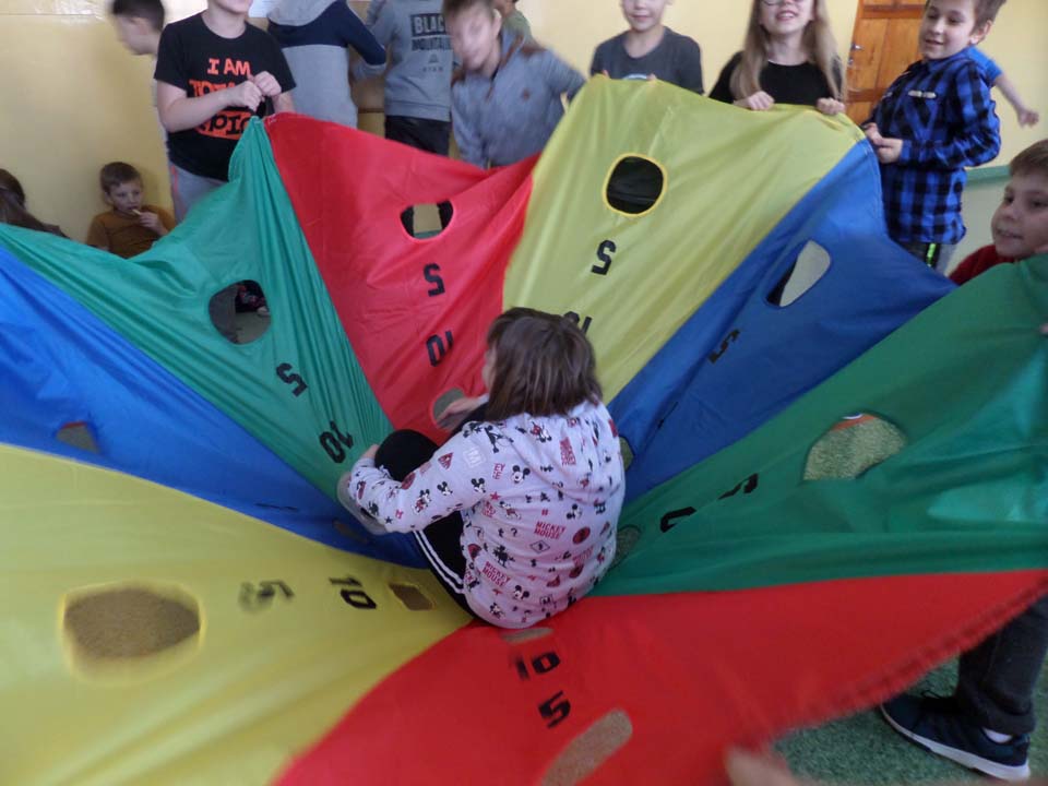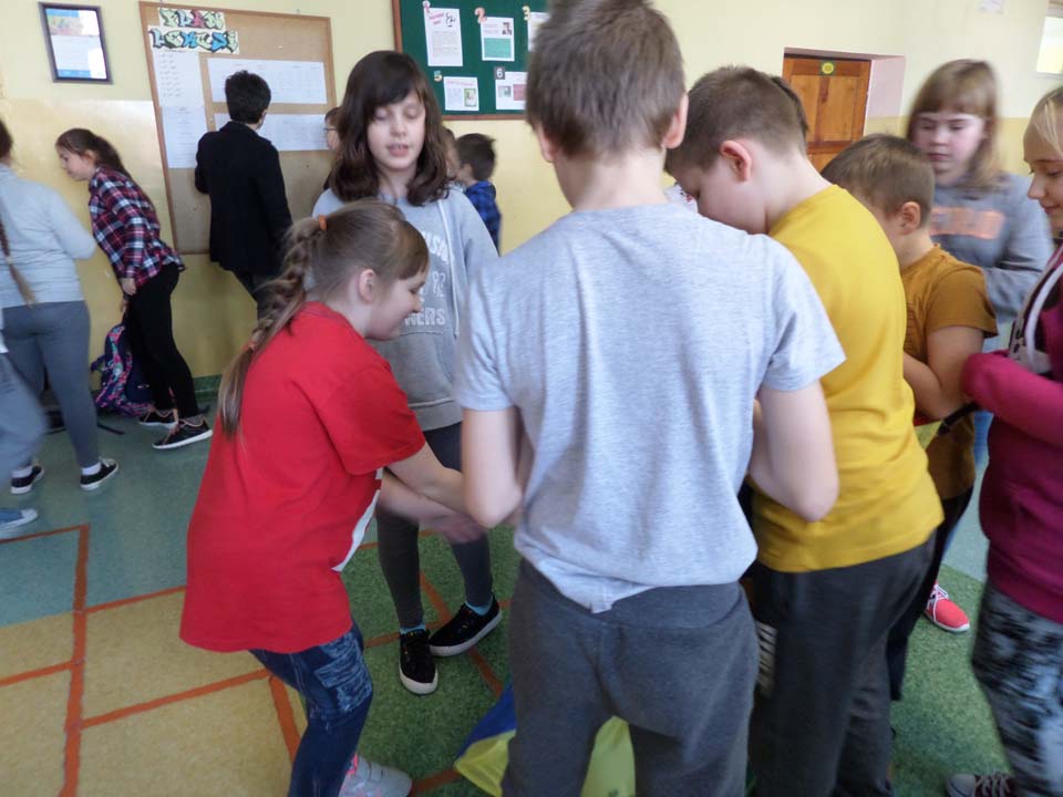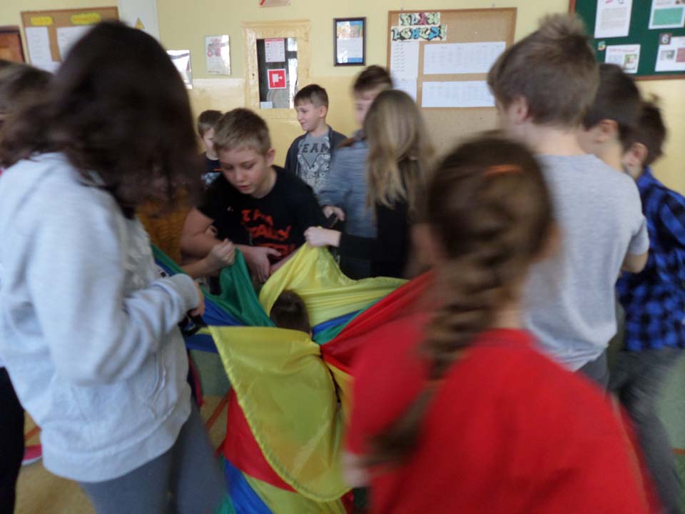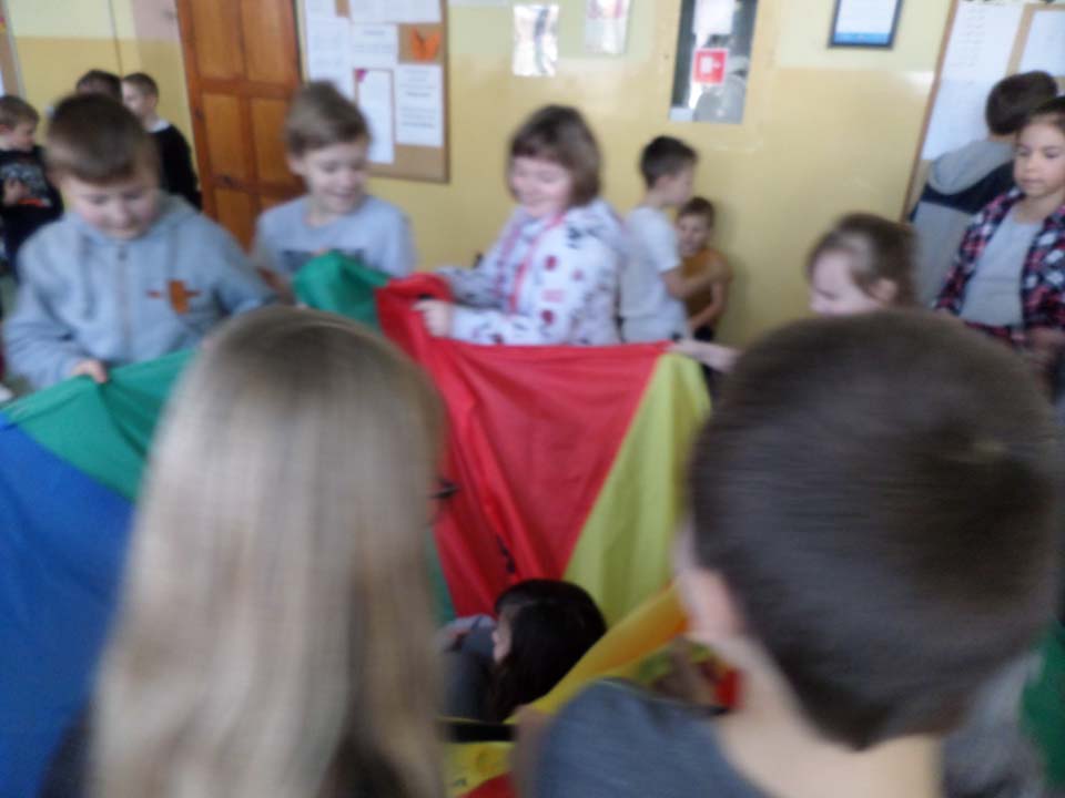 Od lutego podczas aktywnych przerw uczniowie kl. IV – V spędzają czas, wykorzystując do zabaw chustę animacyjną. Zabawy z chustą mają na celu ogólne usprawnianie dziecka, rozwijanie wrażeń wzrokowych i dotykowych oraz świadomości własnego ciała, a także kształtowanie współpracy z rówieśnikami i umiejętności integrowania się. Każdego dnia uczniowie, współpracując z wolontariuszami, poznają ciekawe zabawy i zdobywają nowe umiejętności.