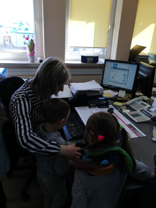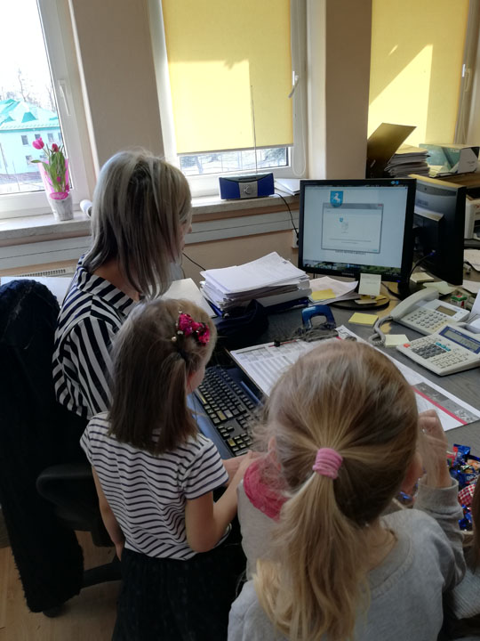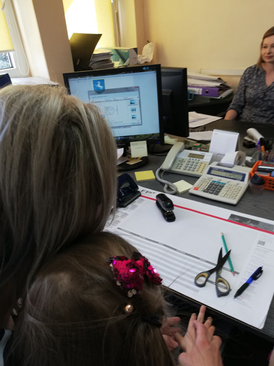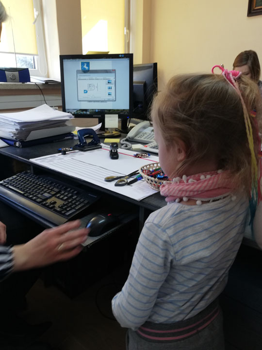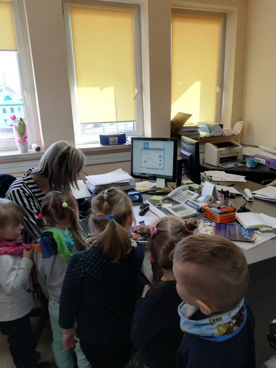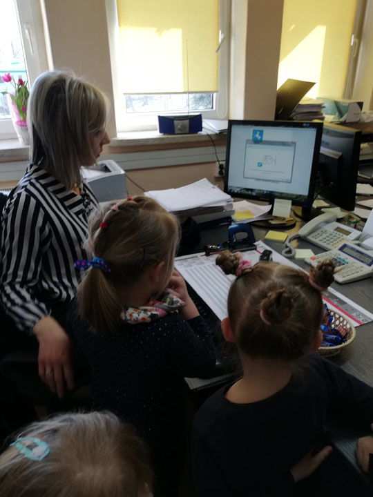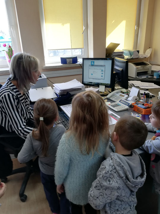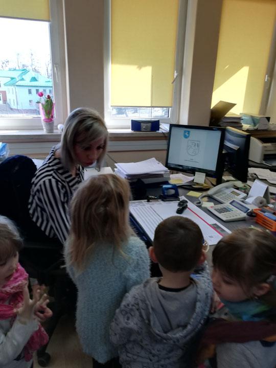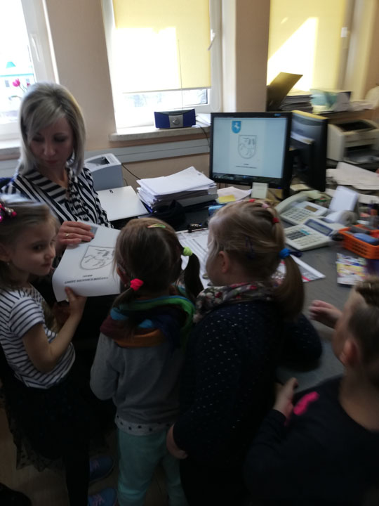 Dnia 05.04 2019r. dzieci z grupy „Słodziaki” odwiedziły Urząd Gminy w Siennicy Różanej, którego pracownikiem jest Pani Anna Mańkowska mama Agatki, która uczęszcza do naszej grupy. Wyjście to odbyło się w ramach realizacji projektu „Poznajemy zawody naszych rodziców”. Podczas wizyty w Urzędzie Gminy dzieci poznały na czym polega praca biurowa, jak jest ważna dla wszystkich mieszkańców gminy. Przedszkolaki poznały urządzenia wykorzystywane przez pracowników biurowych. Dzieci mogły same użyć niszczarki do papieru, kserokopiarki, drukarki czy gilotyny do papieru. W ramach wizyty dzieci poznały cały budynek urzędu gminy, główne pomieszczenia oraz pracujące w nich osoby. Dużą frajdę sprawiło dzieciom zwiedzani sali reprezentacyjnej, sali obrad, oraz oglądanie starych ksiąg ewidencyjnych. Na koniec wizyty dzieci samodzielnie mogły wydrukować herb gminy i pokolorować go w przedszkolu.