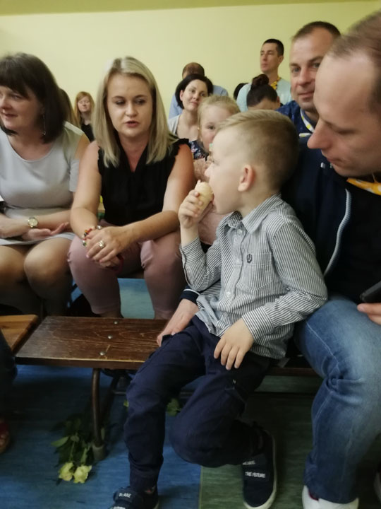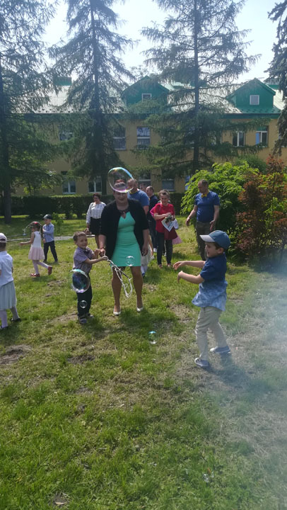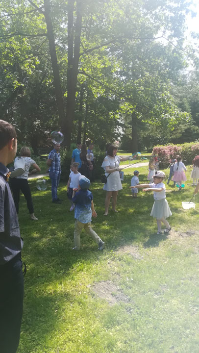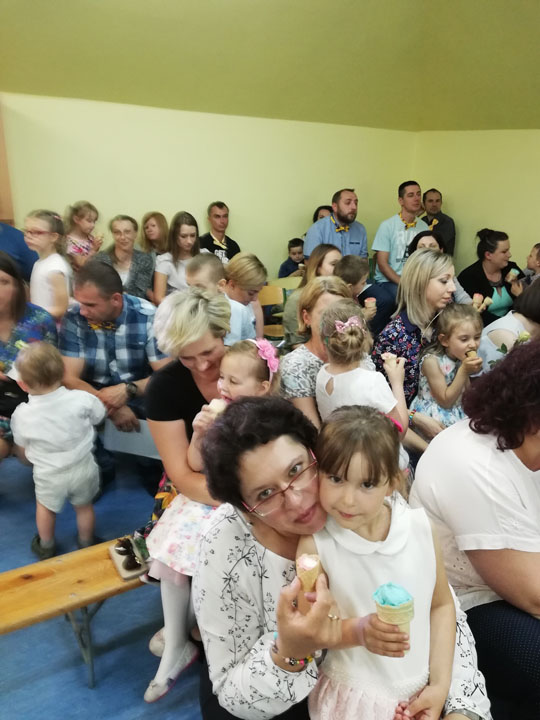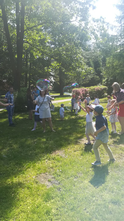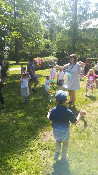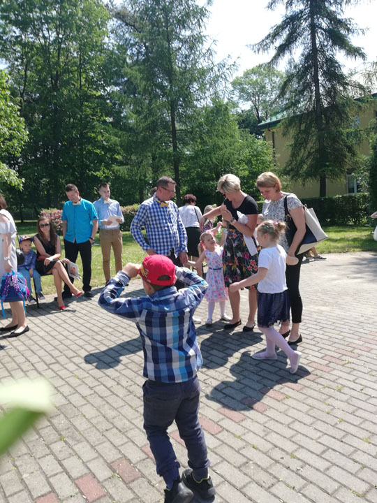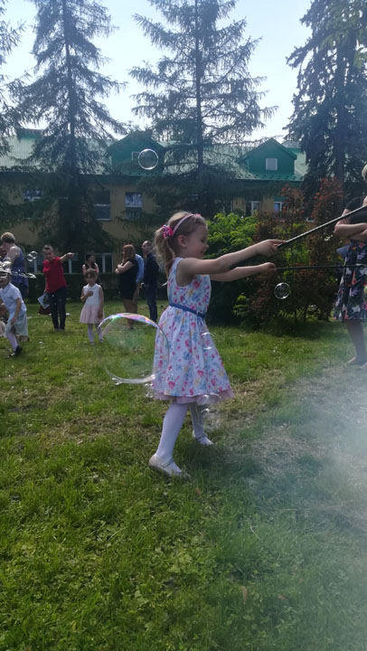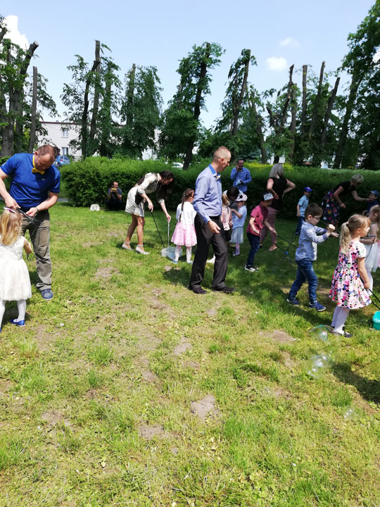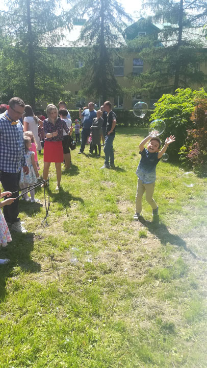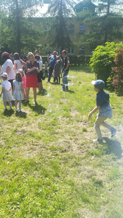 Dnia 27 maja 2019 r. dzieci i rodzice z grupy „Słodziaki” uroczyście świętowali „Dzień Mamy i Taty”. Uroczystość poprzedzona była długimi przygotowaniami, podczas których dzieci samodzielnie wykonywały upominki dla mam i tatusiów. Ćwiczyły piosenki, recytacje wierszyków oraz taniec. Dzieci włączyły się także w dekoracje sali na tę uroczystość. Ich występy wywołały mnóstwo wzruszeń wśród rodziców. Po części artystycznej dzieci serwowały swoim gościom lody i wspólnie z rodzicami miło spędzały czas. Po oficjalnej części wszyscy goście wraz z dziećmi udali się do przyszkolnego parku, gdzie wspólnie bawili się, puszczając bańki mydlane i uczestnicząc w sesji zdjęciowej. Dzień upłynął w miłej, pełnej wzruszeń, rodzinnej atmosferze.