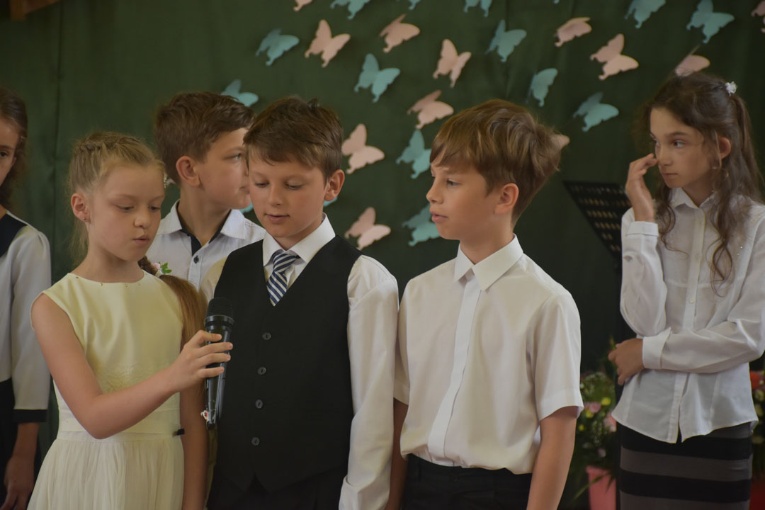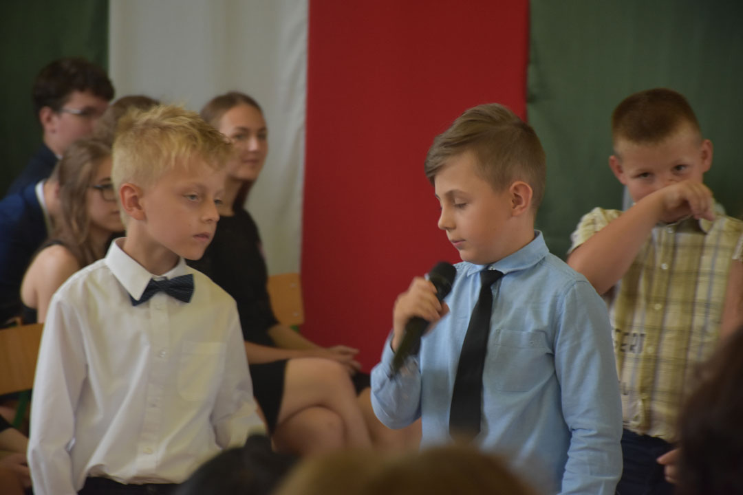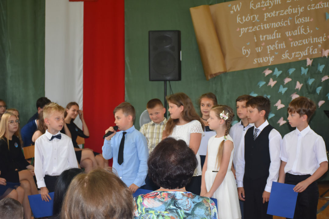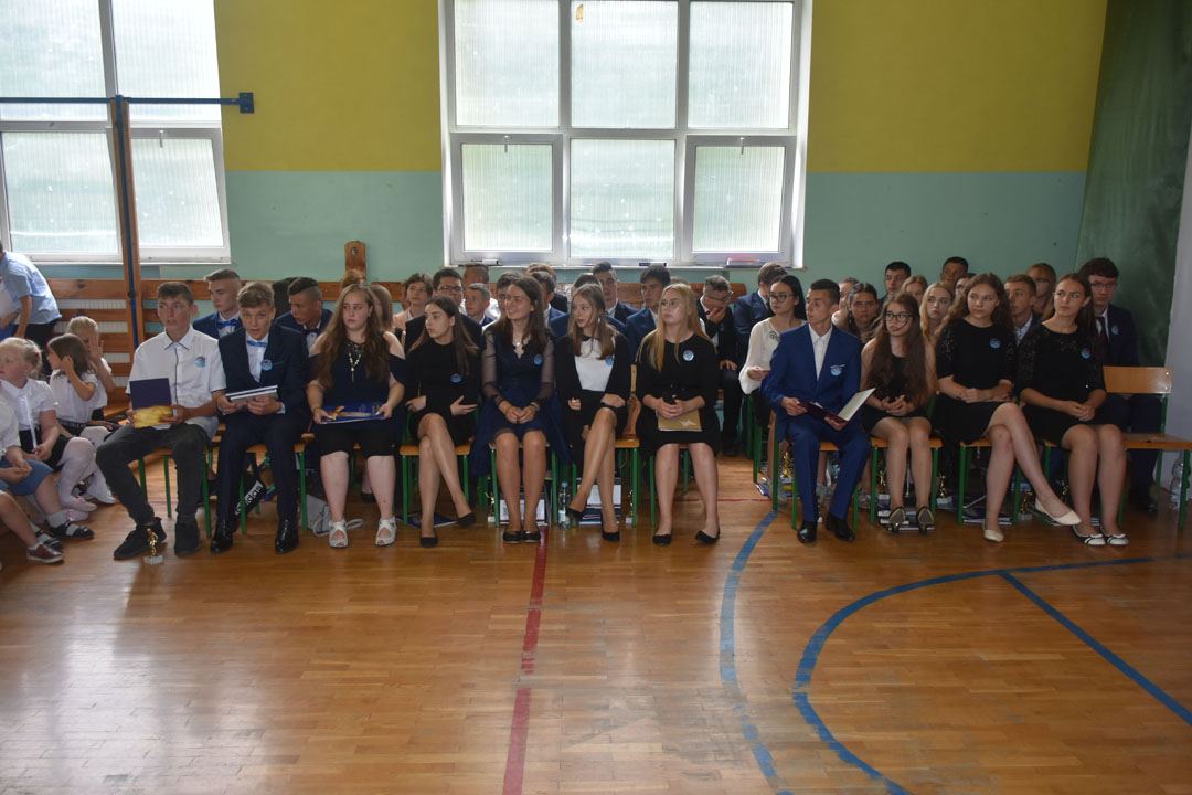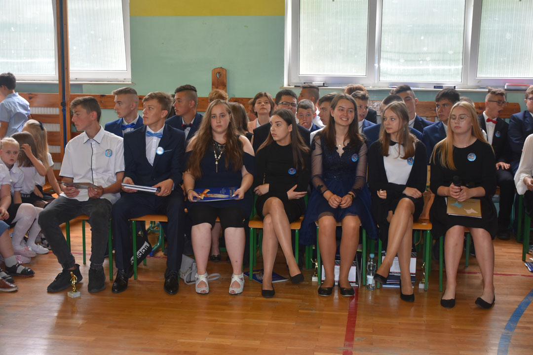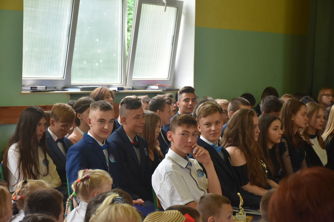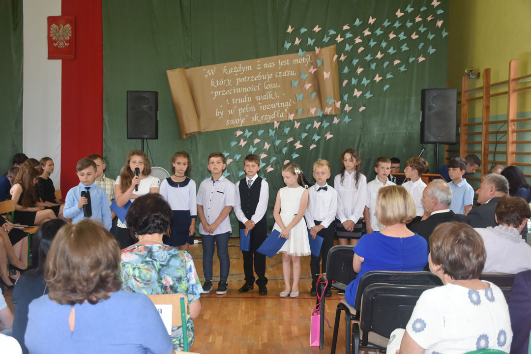 Uroczystość zakończenia roku szkolnego 2018/19 była szczególna. Pożegnaliśmy bowiem aż dwa roczniki absolwentów. Po raz ostatni naszą szkołę kończyli gimnazjaliści, a po raz pierwszy od wielu lat ósmoklasiści. To oni byli gospodarzami i głównymi bohaterami całej uroczystości. Wręczone zostały nagrody za bardzo dobre wyniki w nauce, osiągnięcia w konkursach i zawodach sportowych oraz działalność społeczną. Nad przygotowaniem i przebiegiem części artystycznej czuwali wychowawcy: pani Anna Proskura i pan Przemysław Kucharski. Widzowie mogli wysłuchać recytacji pięknych wierszy oraz znakomicie wykonanych piosenek. Były podziękowania i kwiaty dla nauczycieli oraz listy gratulacyjne dla rodziców, którzy przez wiele lat wspierali wychowawców. Zaprezentowali się także uczniowie, którzy kończą etap edukacji wczesnoszkolnej. Do występu przygotowała ich pani Marzena Grabczak.
