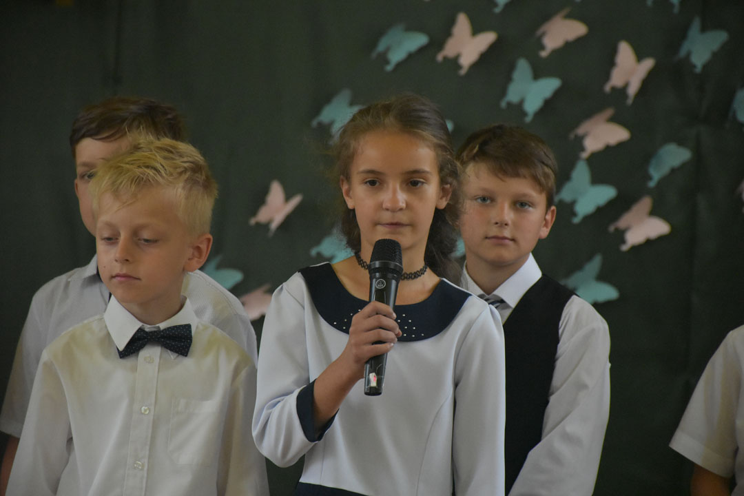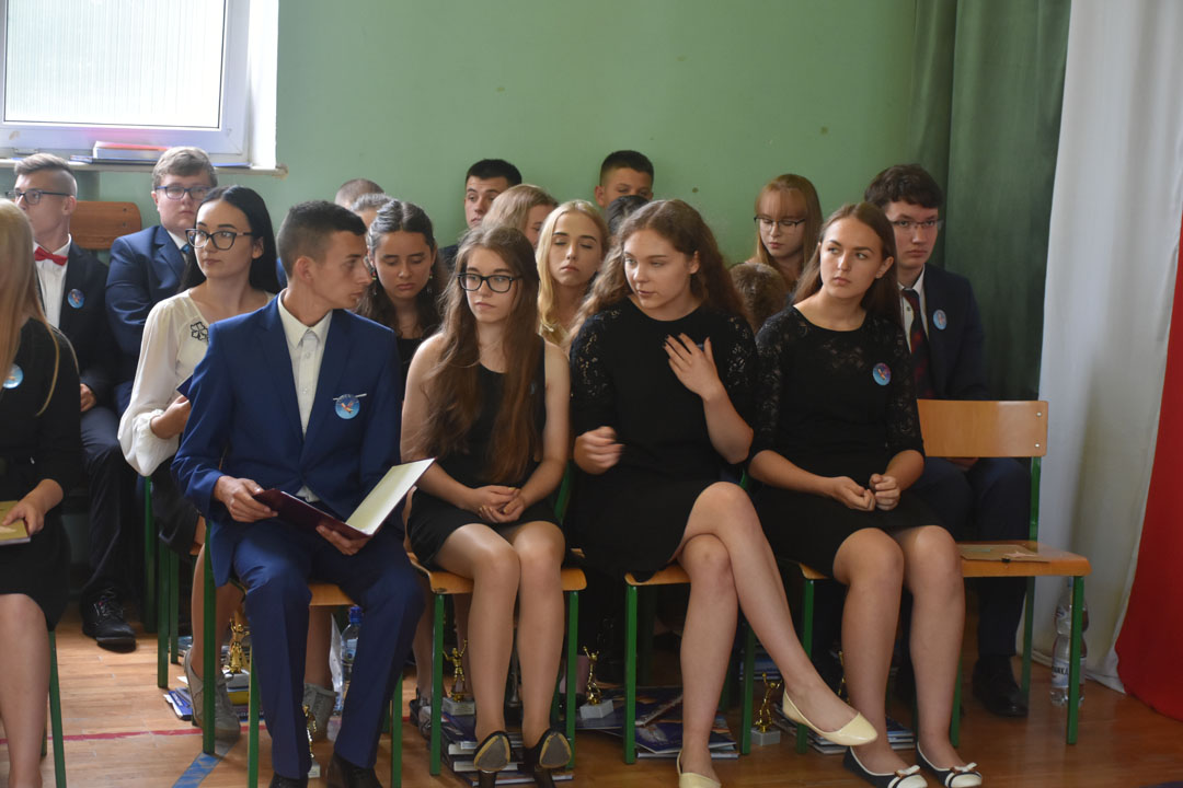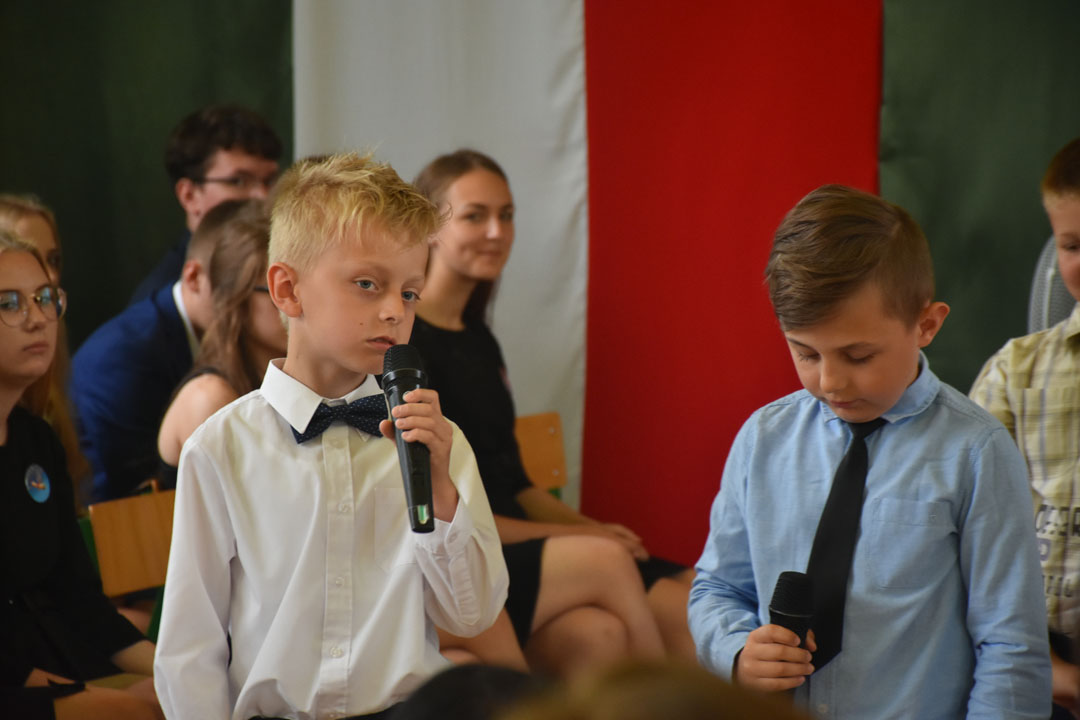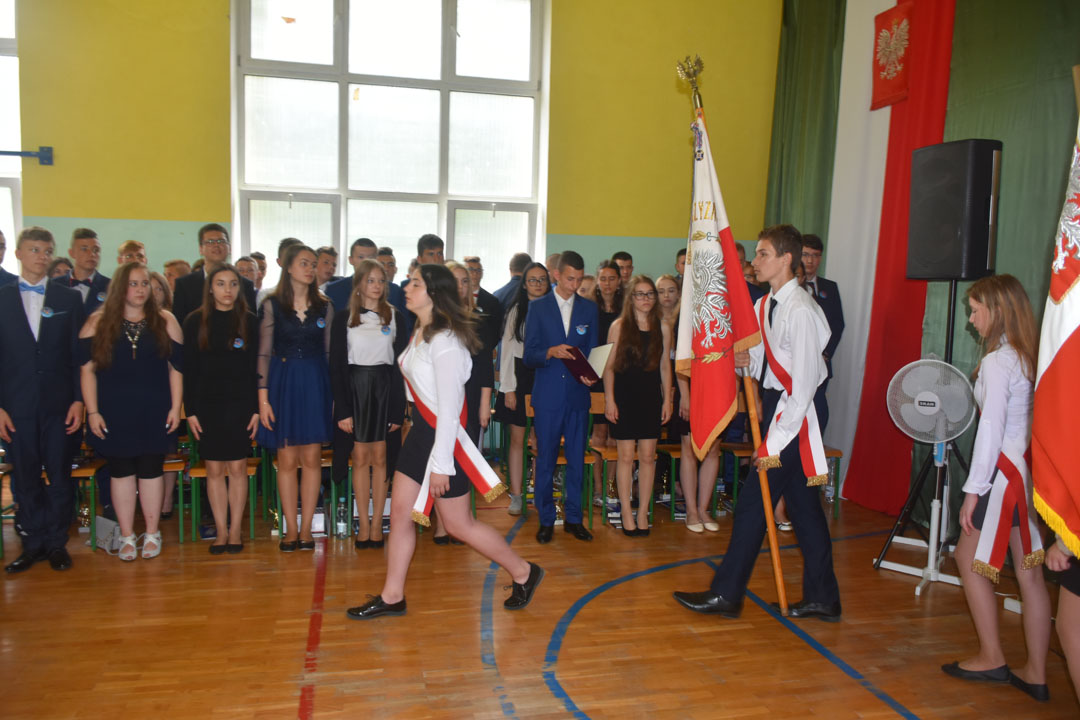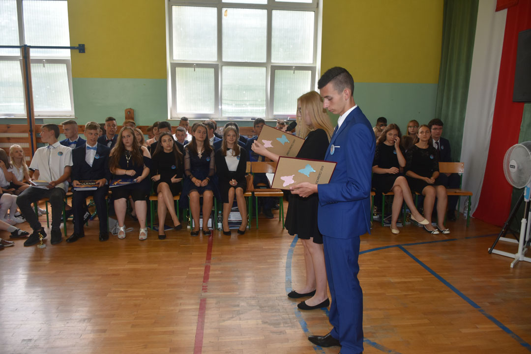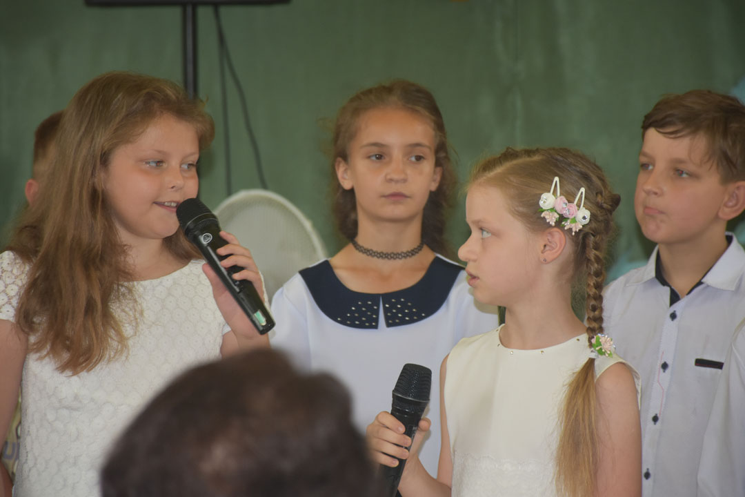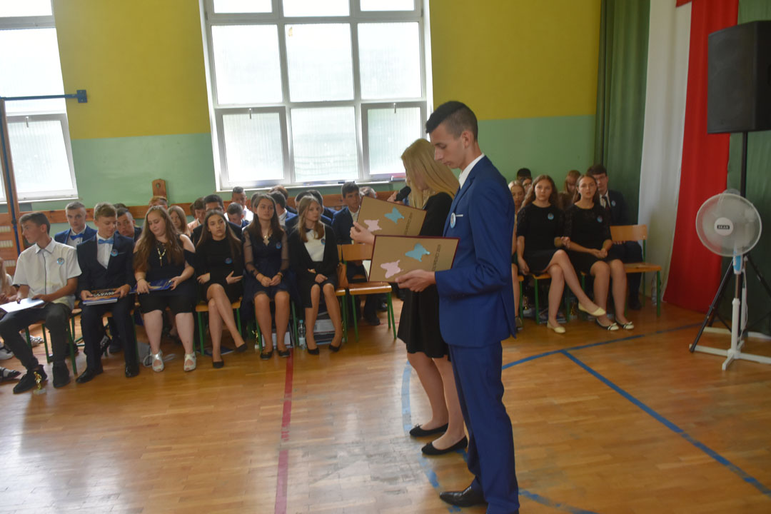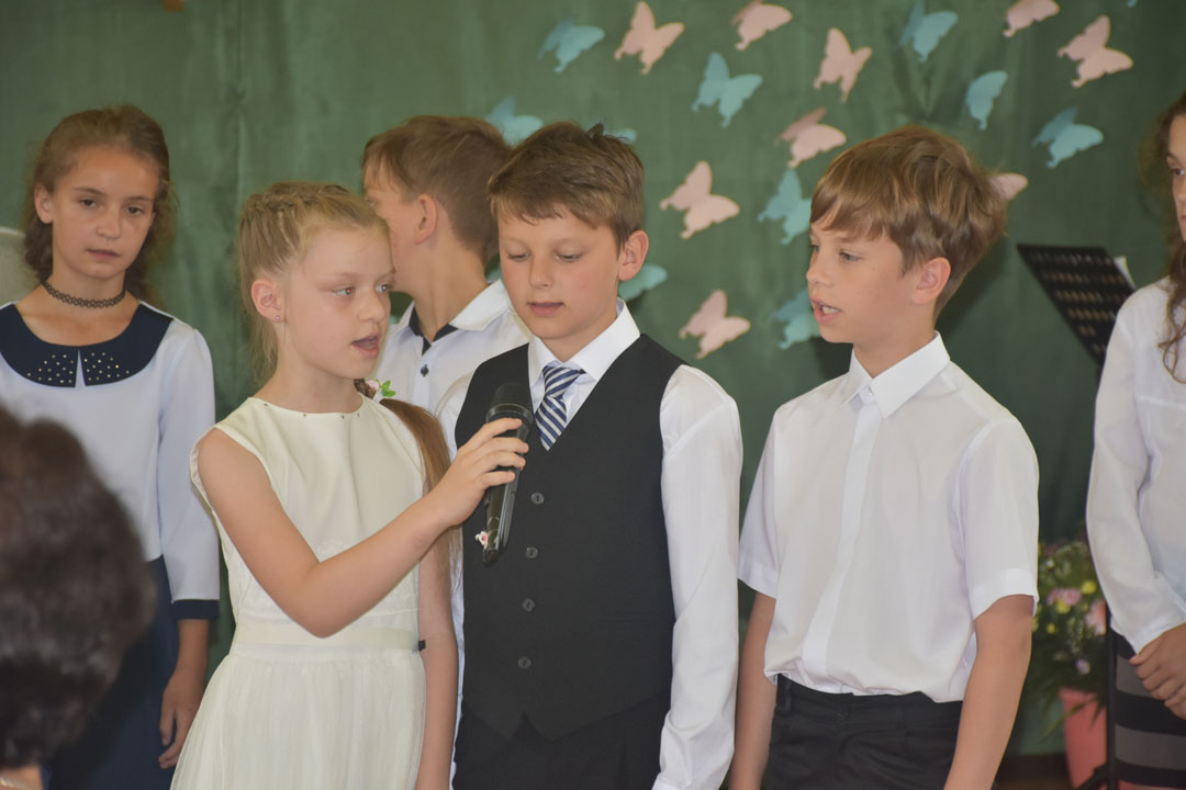 Uroczystość zakończenia roku szkolnego 2018/19 była szczególna. Pożegnaliśmy bowiem aż dwa roczniki absolwentów. Po raz ostatni naszą szkołę kończyli gimnazjaliści, a po raz pierwszy od wielu lat ósmoklasiści. To oni byli gospodarzami i głównymi bohaterami całej uroczystości. Wręczone zostały nagrody za bardzo dobre wyniki w nauce, osiągnięcia w konkursach i zawodach sportowych oraz działalność społeczną. Nad przygotowaniem i przebiegiem części artystycznej czuwali wychowawcy: pani Anna Proskura i pan Przemysław Kucharski. Widzowie mogli wysłuchać recytacji pięknych wierszy oraz znakomicie wykonanych piosenek. Były podziękowania i kwiaty dla nauczycieli oraz listy gratulacyjne dla rodziców, którzy przez wiele lat wspierali wychowawców. Zaprezentowali się także uczniowie, którzy kończą etap edukacji wczesnoszkolnej. Do występu przygotowała ich pani Marzena Grabczak.