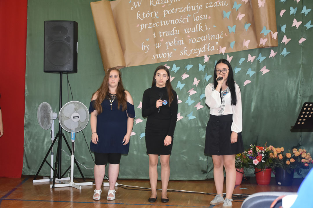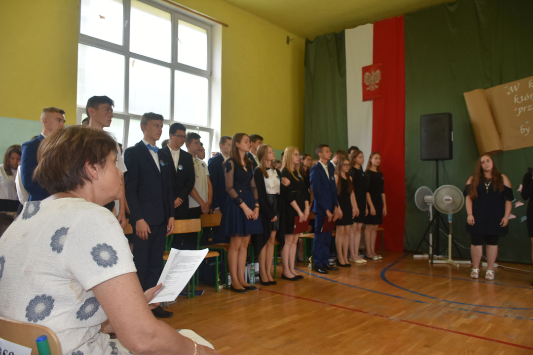 Uroczystość zakończenia roku szkolnego 2018/19 była szczególna. Pożegnaliśmy bowiem aż dwa roczniki absolwentów. Po raz ostatni naszą szkołę kończyli gimnazjaliści, a po raz pierwszy od wielu lat ósmoklasiści. To oni byli gospodarzami i głównymi bohaterami całej uroczystości. Wręczone zostały nagrody za bardzo dobre wyniki w nauce, osiągnięcia w konkursach i zawodach sportowych oraz działalność społeczną. Nad przygotowaniem i przebiegiem części artystycznej czuwali wychowawcy: pani Anna Proskura i pan Przemysław Kucharski. Widzowie mogli wysłuchać recytacji pięknych wierszy oraz znakomicie wykonanych piosenek. Były podziękowania i kwiaty dla nauczycieli oraz listy gratulacyjne dla rodziców, którzy przez wiele lat wspierali wychowawców. Zaprezentowali się także uczniowie, którzy kończą etap edukacji wczesnoszkolnej. Do występu przygotowała ich pani Marzena Grabczak.
