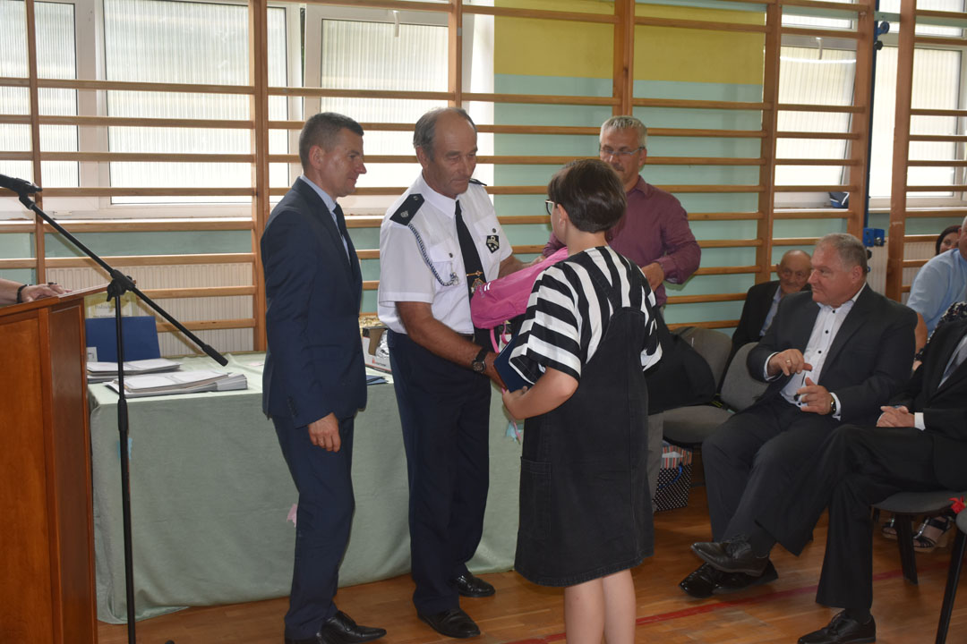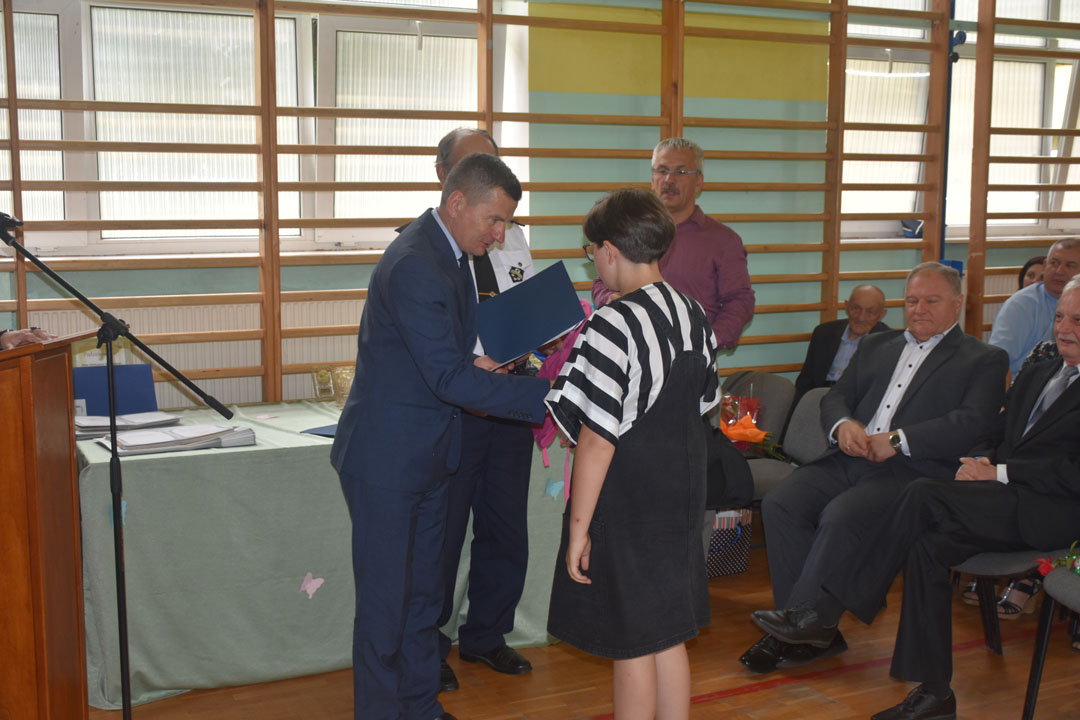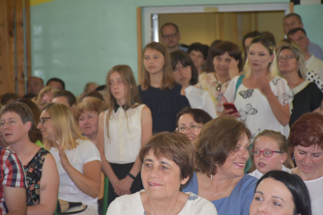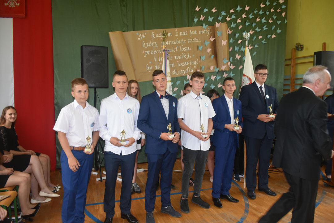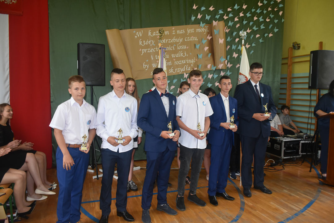 Uroczystość zakończenia roku szkolnego 2018/19 była szczególna. Pożegnaliśmy bowiem aż dwa roczniki absolwentów. Po raz ostatni naszą szkołę kończyli gimnazjaliści, a po raz pierwszy od wielu lat ósmoklasiści. To oni byli gospodarzami i głównymi bohaterami całej uroczystości. Wręczone zostały nagrody za bardzo dobre wyniki w nauce, osiągnięcia w konkursach i zawodach sportowych oraz działalność społeczną. Nad przygotowaniem i przebiegiem części artystycznej czuwali wychowawcy: pani Anna Proskura i pan Przemysław Kucharski. Widzowie mogli wysłuchać recytacji pięknych wierszy oraz znakomicie wykonanych piosenek. Były podziękowania i kwiaty dla nauczycieli oraz listy gratulacyjne dla rodziców, którzy przez wiele lat wspierali wychowawców. Zaprezentowali się także uczniowie, którzy kończą etap edukacji wczesnoszkolnej. Do występu przygotowała ich pani Marzena Grabczak.