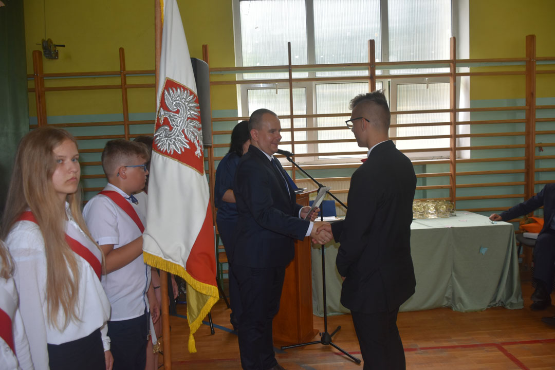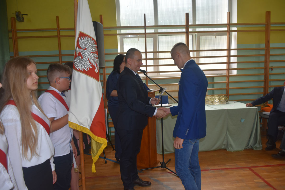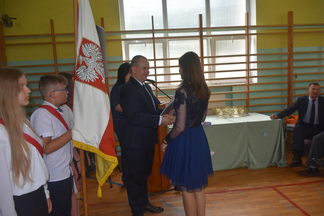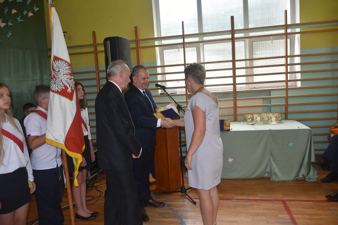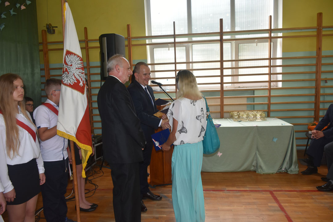 Uroczystość zakończenia roku szkolnego 2018/19 była szczególna. Pożegnaliśmy bowiem aż dwa roczniki absolwentów. Po raz ostatni naszą szkołę kończyli gimnazjaliści, a po raz pierwszy od wielu lat ósmoklasiści. To oni byli gospodarzami i głównymi bohaterami całej uroczystości. Wręczone zostały nagrody za bardzo dobre wyniki w nauce, osiągnięcia w konkursach i zawodach sportowych oraz działalność społeczną. Nad przygotowaniem i przebiegiem części artystycznej czuwali wychowawcy: pani Anna Proskura i pan Przemysław Kucharski. Widzowie mogli wysłuchać recytacji pięknych wierszy oraz znakomicie wykonanych piosenek. Były podziękowania i kwiaty dla nauczycieli oraz listy gratulacyjne dla rodziców, którzy przez wiele lat wspierali wychowawców. Zaprezentowali się także uczniowie, którzy kończą etap edukacji wczesnoszkolnej. Do występu przygotowała ich pani Marzena Grabczak.