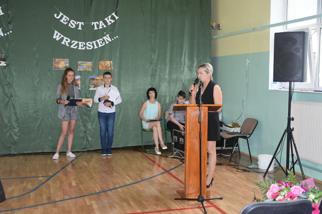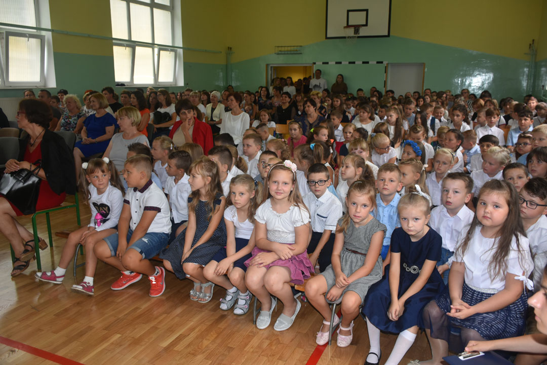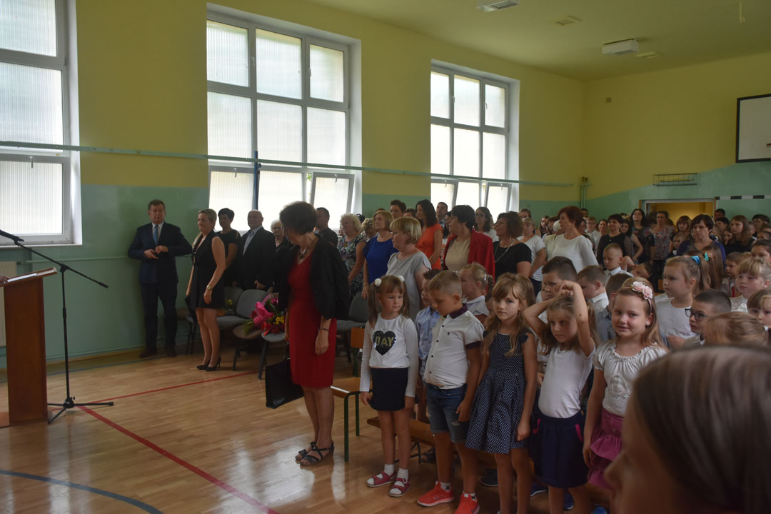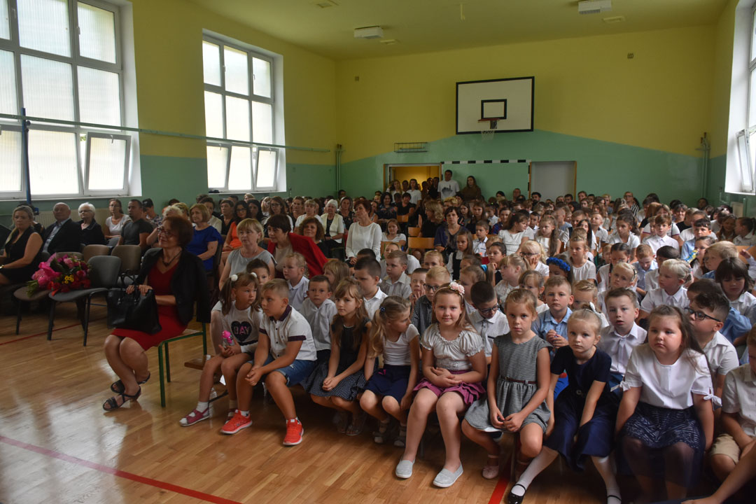 W poniedziałek 2 września wprowadzeniem pocztów sztandarowych i odśpiewaniem hymnu państwowego rozpoczęliśmy rok szkolny 2019/2020. Społeczność szkolna, zaproszeni goście, rodzice, nauczyciele i pracownicy szkoły zebrali się w sali gimnastycznej, aby uroczyście powitać nowy rok szkolny. Jest to wyjątkowy rok z kilku powodów. Po dwudziestu ośmiu latach pracy opuścił naszą placówkę dyrektor pan Dariusz Michalak, odchodząc na zasłużoną emeryturę. Jego miejsce zajęła pani Katarzyna Czajka. Została serdecznie i ciepło przyjęta przez społeczność rodziców, pracowników i uczniów szkoły, a także przez pana wójta Leszka Proskurę reprezentującego organ prowadzący szkołę.