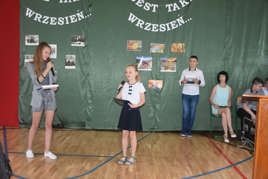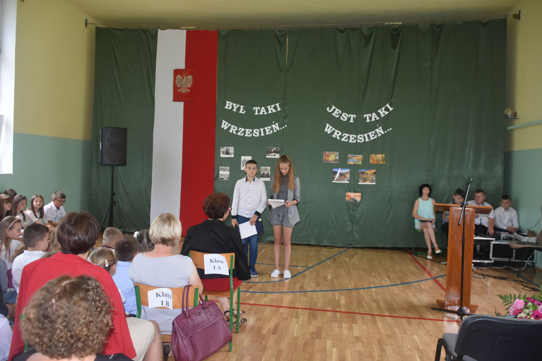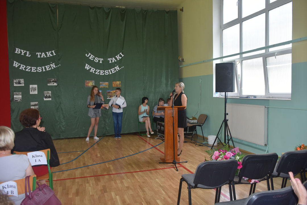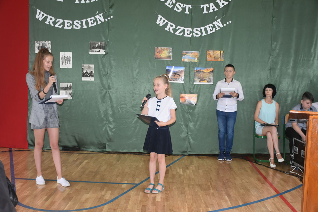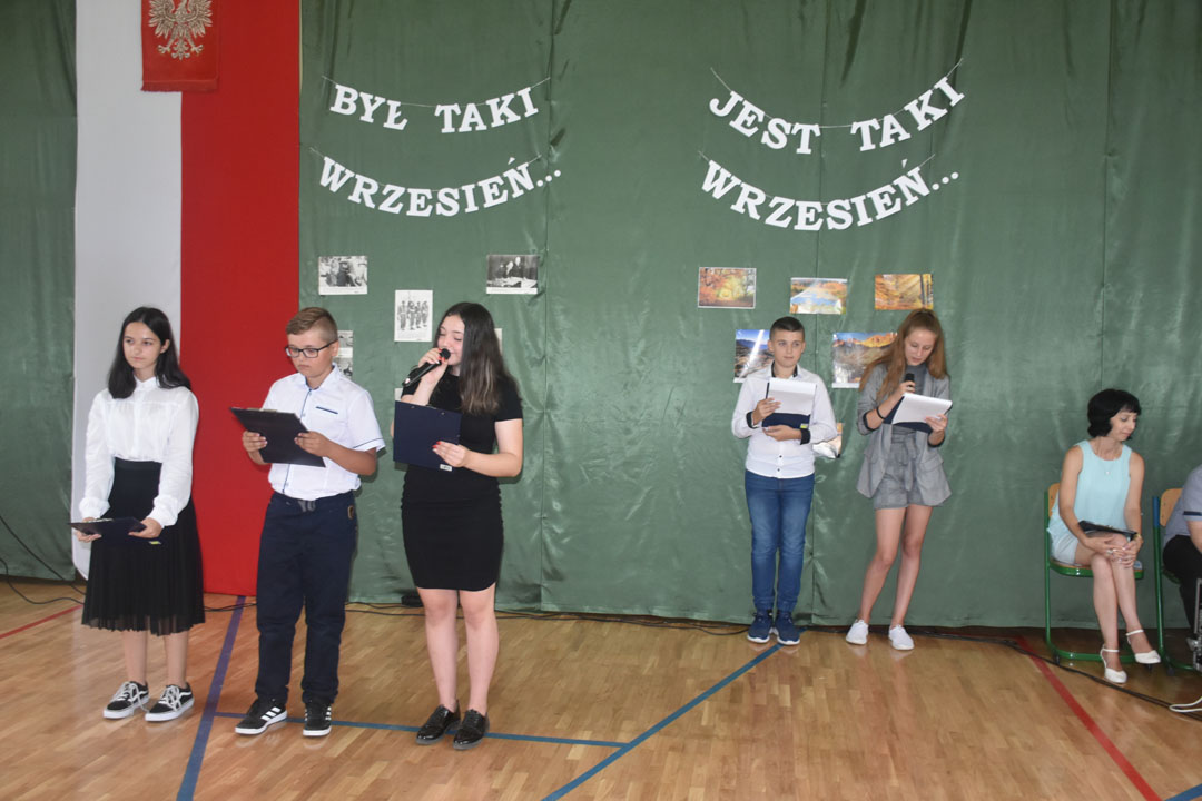 Uczniowie pod czujnym okiem nauczycieli przygotowali część artystyczną. Było poważnie z odrobiną humoru. Uczcili 80 rocznicę wybuchu II wojny światowej. Delegacja złożyła wieniec i zapaliła znicze pod pomnikiem żołnierzy, który znajduje się na terenie naszej placówki. Uczniowie przygotowali dla zebranych również coś na wesoło, aby choć trochę umilić im bolesny powrót z wakacyjnej rzeczywistości. Przywitali szczególnie serdecznie uczniów klas pierwszych, którzy dopiero rozpoczynają szkolną przygodę oraz uczniów klasy ósmej, przed którymi duże wyzwanie – egzamin ósmoklasisty. Wszyscy odczuwali uroczystą atmosferę tego wyjątkowego dnia. Życzymy uczniom i pracownikom sukcesów w nowym roku szkolnym.