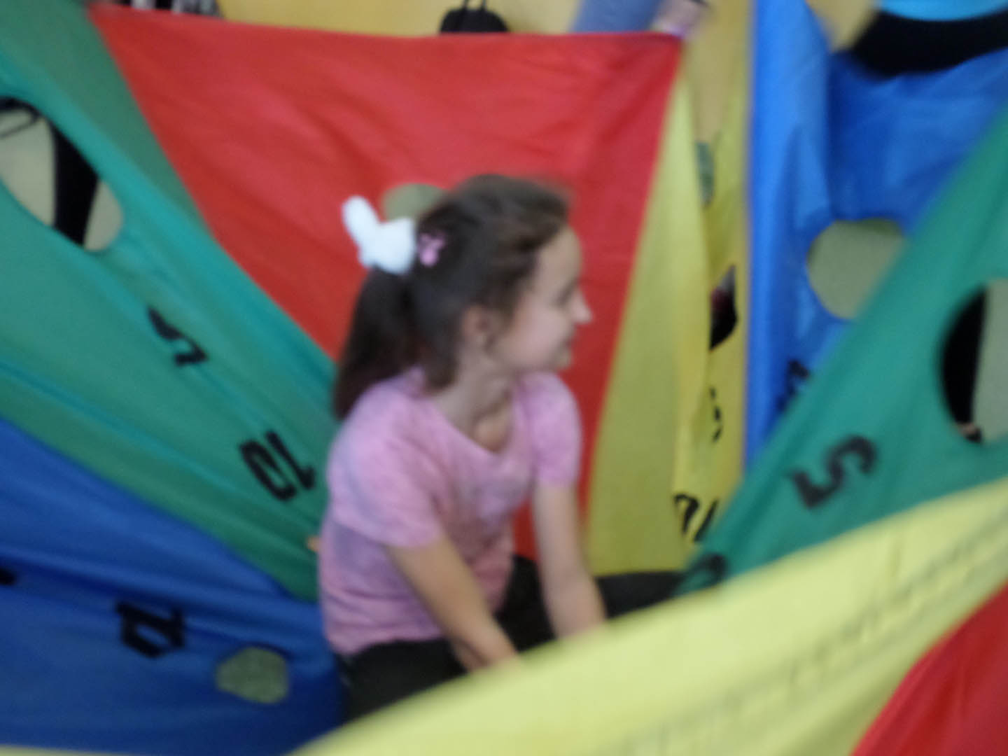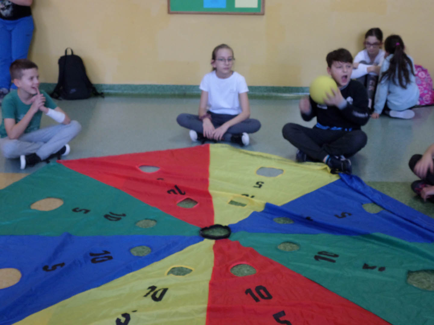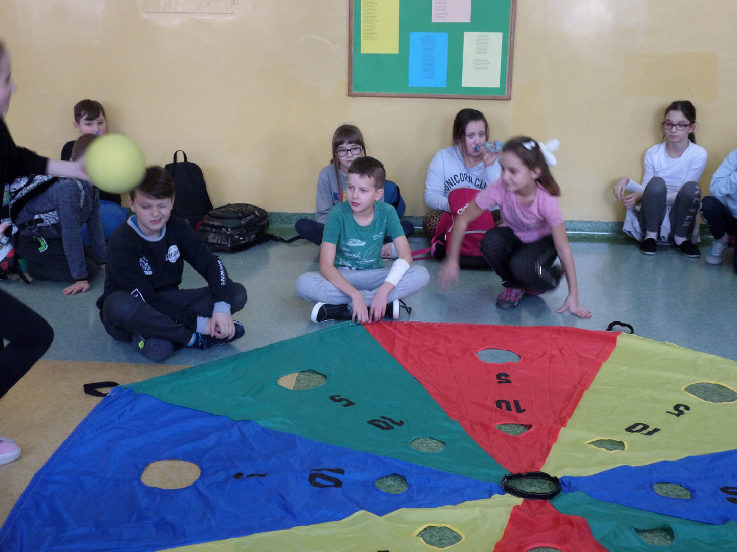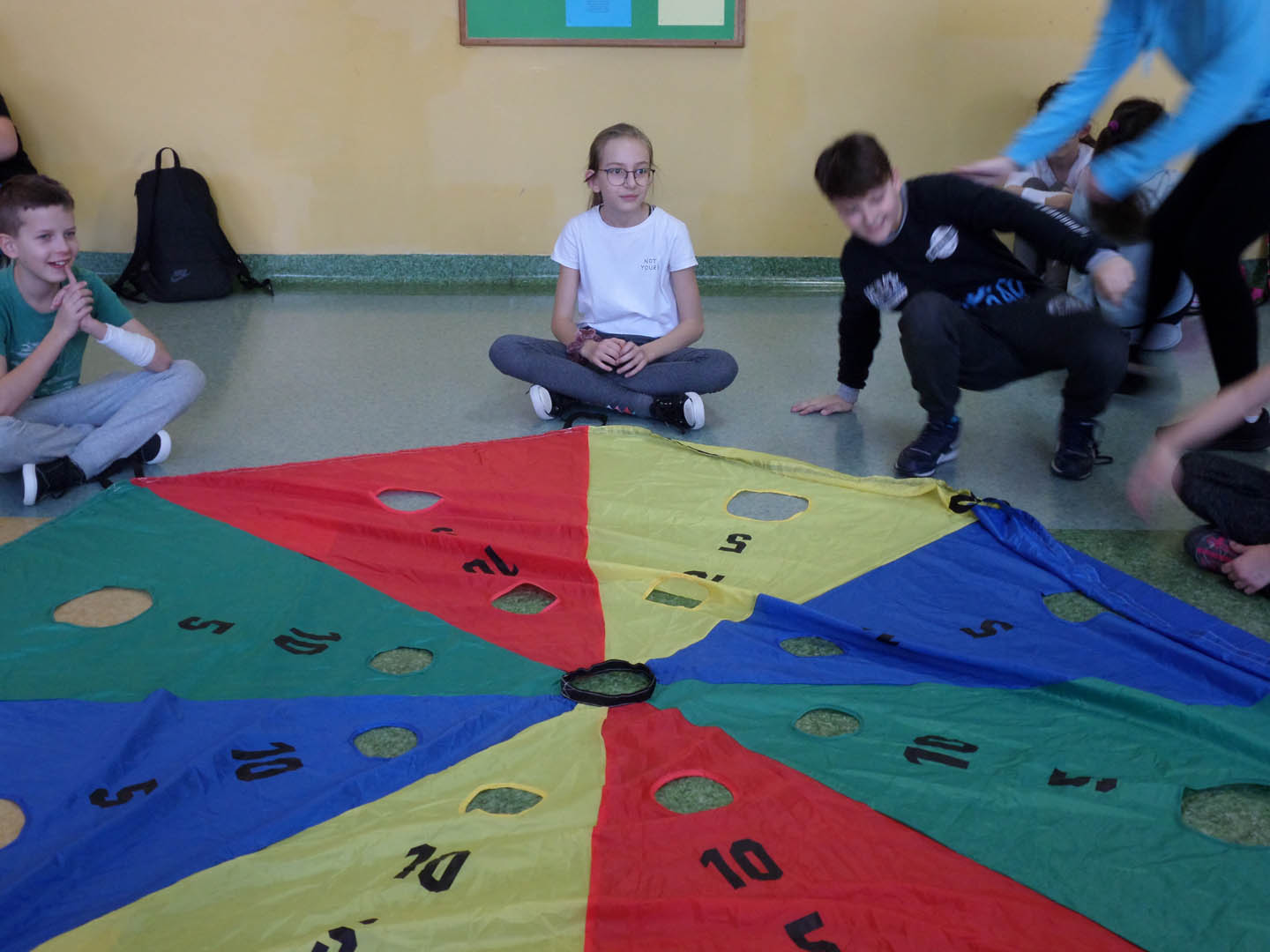 Podczas bezpiecznych i ciekawych przerw uczniowie kl. IV – V spędzają czas, wykorzystując do zabaw chustę animacyjną. Zabawy z chustą mają na celu ogólne usprawnianie dziecka, rozwijanie wrażeń wzrokowych i dotykowych oraz świadomości własnego ciała, a także kształtowanie współpracy z rówieśnikami i umiejętności integrowania się. Uczniowie, współpracując z wolontariuszami, poznają ciekawe zabawy i zdobywają nowe umiejętności.