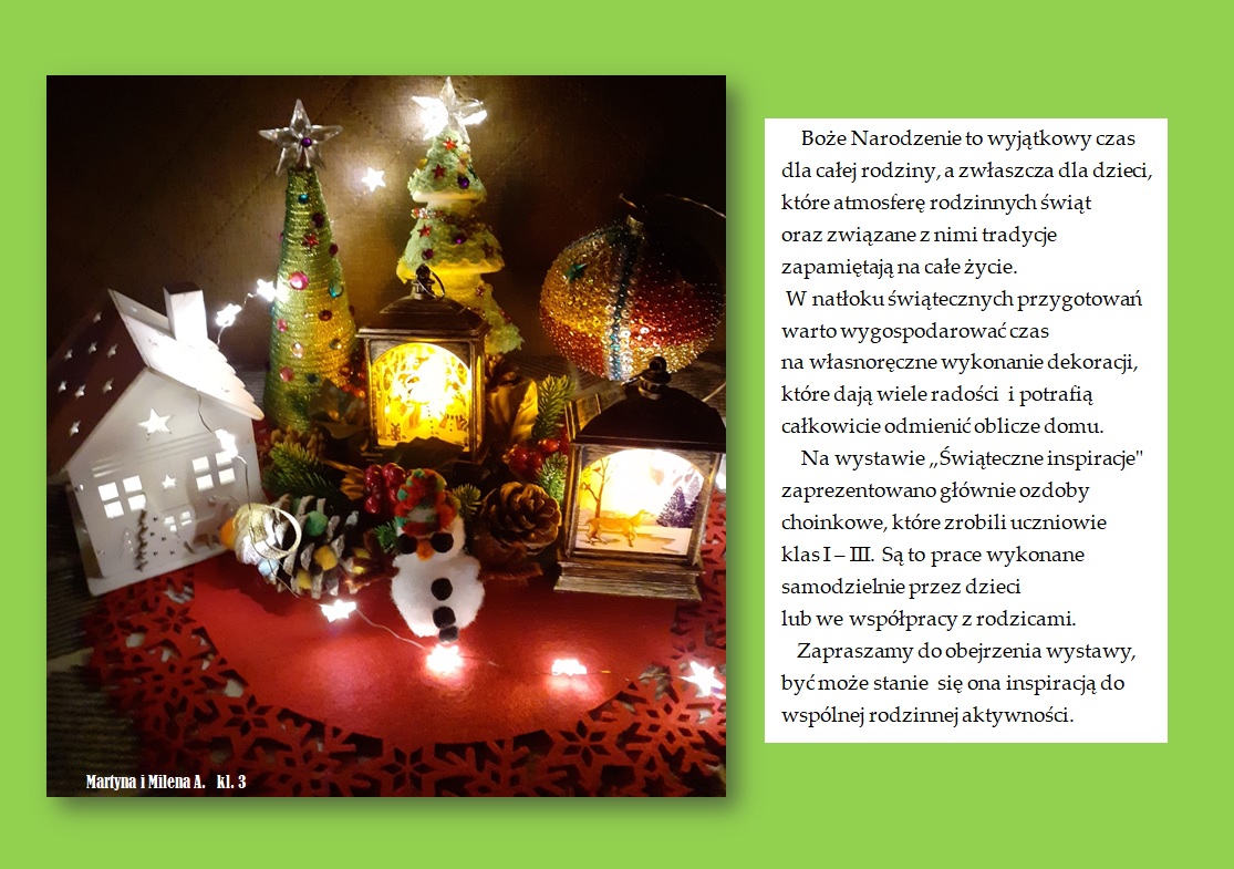18 grudzień Szkoła Podstawowa Możliwość komentowania została wyłączona Świąteczne inspiracje – wystawa ozdób choinkowych klas I – III str01 ◄ Wstecz Następny ► Obraz 2 z 17