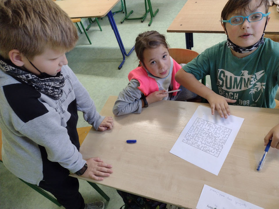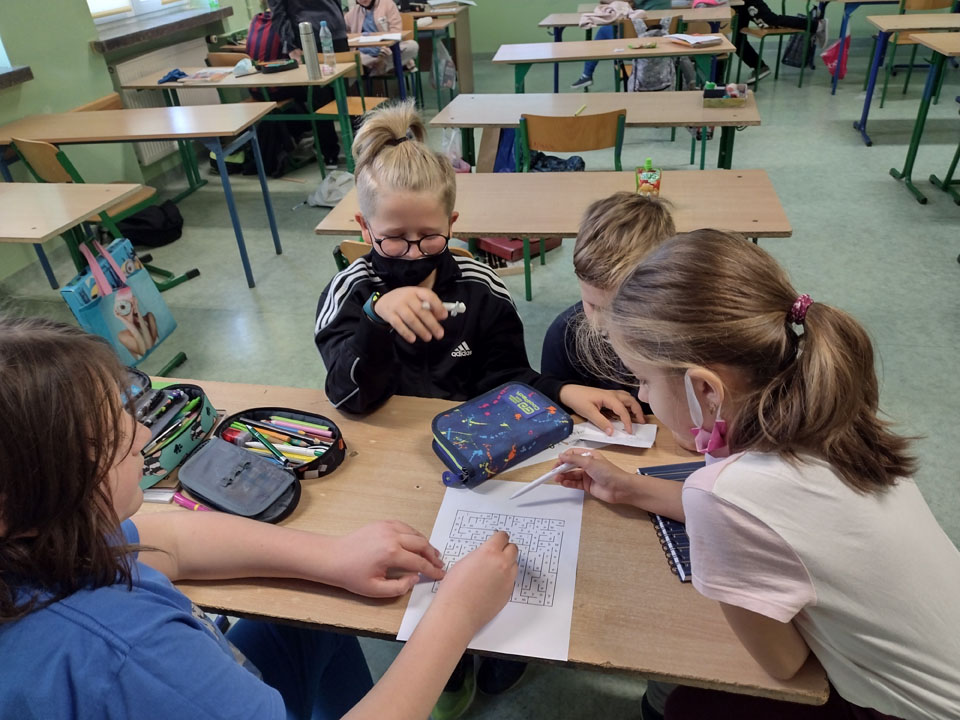 na sektory tematyczne, w których umieszczono zadania do wykonania uwzględniające poznane słownictwo i struktury językowo-gramatyczne, np.: zaszyfrowana wiadomość, rebus obrazkowy, sudoku, krzyżówka, gry logiczne itp. Poza tym niektóre klasy zamieniły się