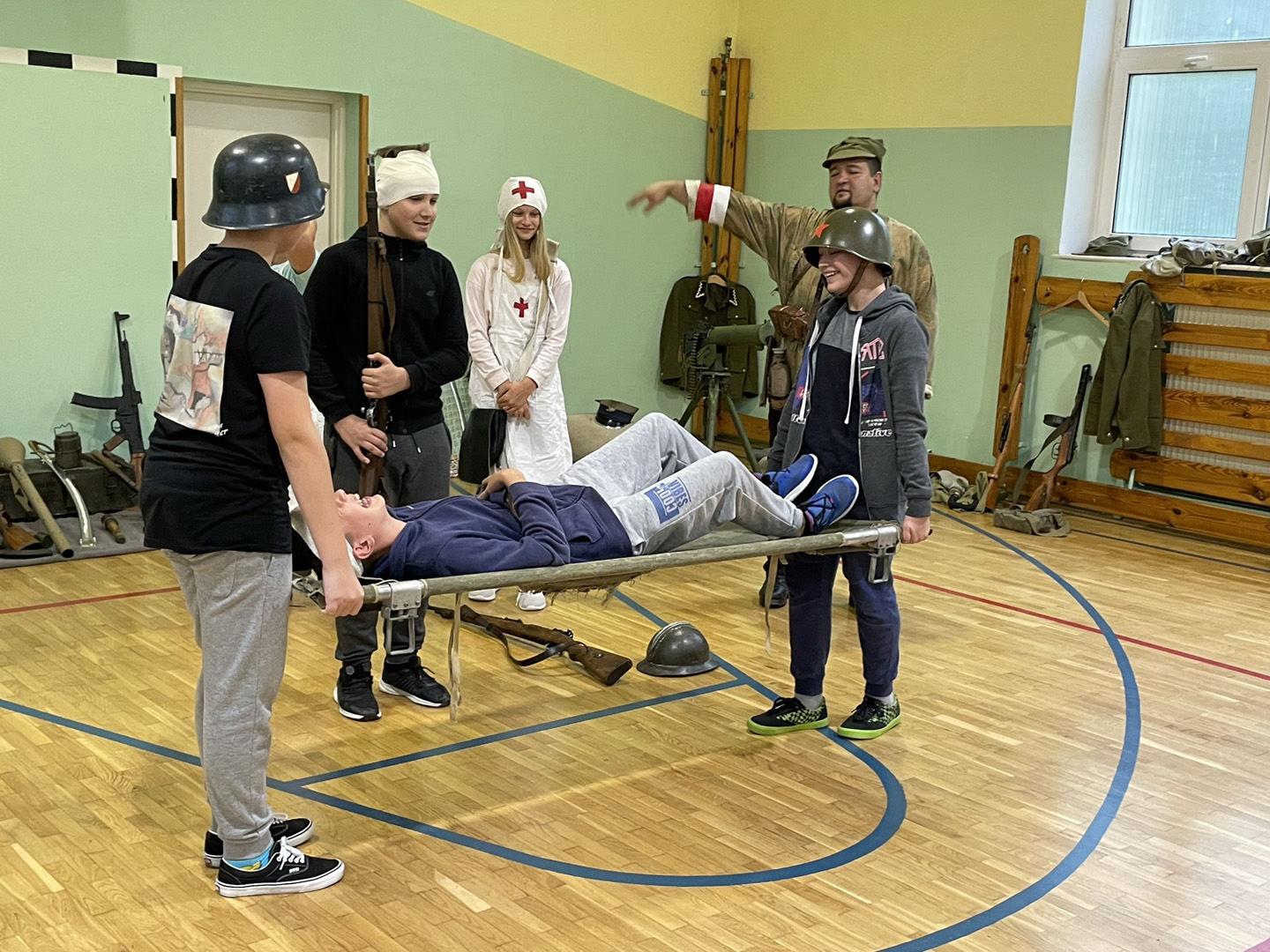 Podczas spotkania uczniowie klas IV – VIII mogli dowiedzieć się, jak wyglądało wyposażenie polskiego żołnierza w momencie wybuchu II wojny światowej, a nawet przymierzyć żołnierski hełm, wziąć do ręki replikę broni czy założyć maskę przeciwgazową. Spotkanie wzbudziło wielkie zainteresowanie uczniów, którzy w ten sposób mieli okazję poznać historię w myśl zasady „nauka poprzez zabawę”.