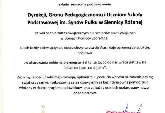 Uczniowie Szkoły Podstawowej im. Synów Pułku w Siennicy Różanej w miesiącu grudniu wykonali i przekazali kartki świąteczne dla seniorów przebywających w Domu Pomocy Społecznej.