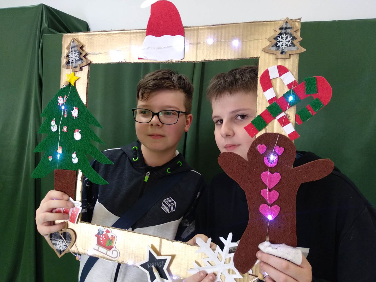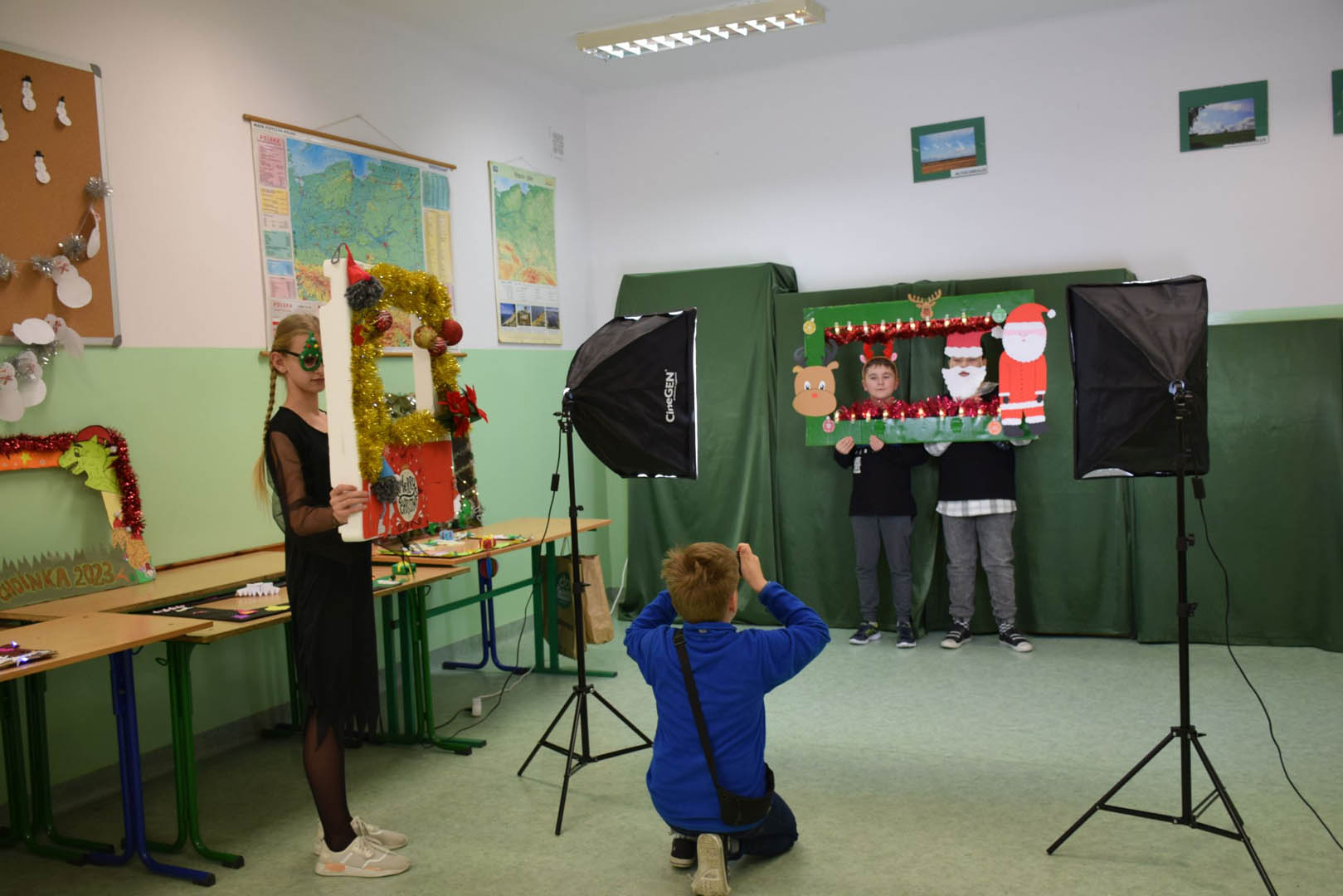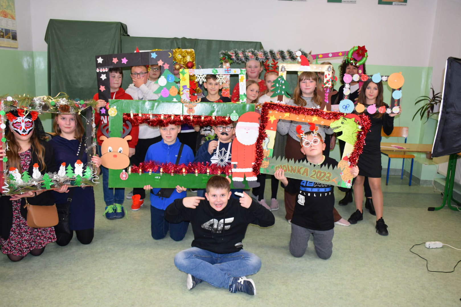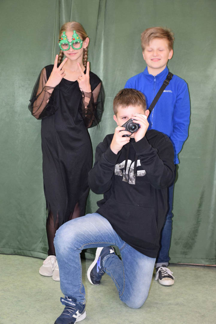 Podczas szkolnej zabawy choinkowej klasa V zorganizowała fotobudkę, chociaż śmiało można byłoby ją nazwać profesjonalnym studiem fotograficznym. Każdy uczestnik zabawy mógł uwiecznić chwile beztroskiej radości, robiąc sobie oryginalne zdjęcia. Młodzi adepci sztuki fotograficznej zadbali o tło, oświetlenie a nawet zabawne rekwizyty. Uczniowie sami wykonali nawiązujące do karnawału ramki. Modele mogli więc wybrać sobie obramowanie ozdobione: bombkami, łańcuchami, prezentami, rogami reniferów, a nawet świecące. Do charakteryzacji wykorzystywali kokardy, rogi reniferów, okulary i wąsy. Uczniowie, bawiąc się, zgłębiali jednocześnie tajniki fotografii. Wykorzystywali przy tym sprzęt zakupiony w ramach rządowego programu Laboratoria przyszłości: zestaw oświetleniowy softbox oraz aparat fotograficzny Sony ZV-1.