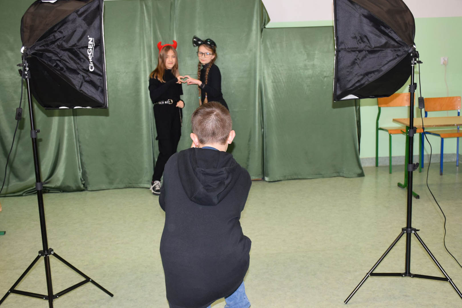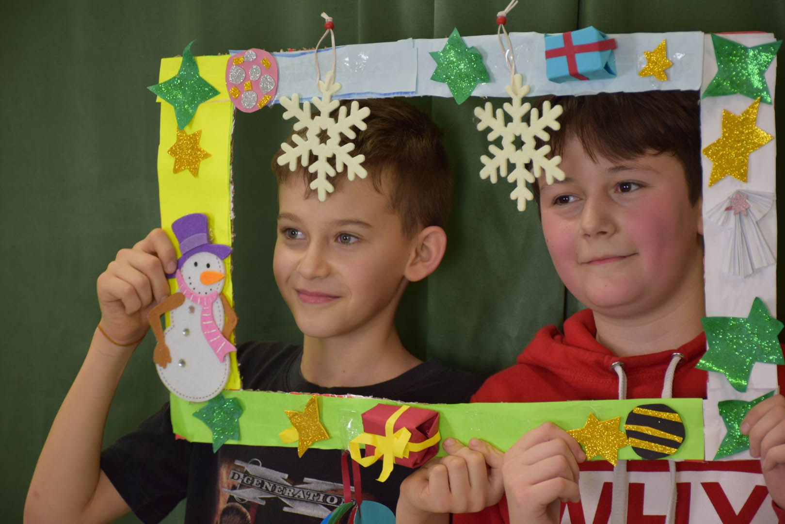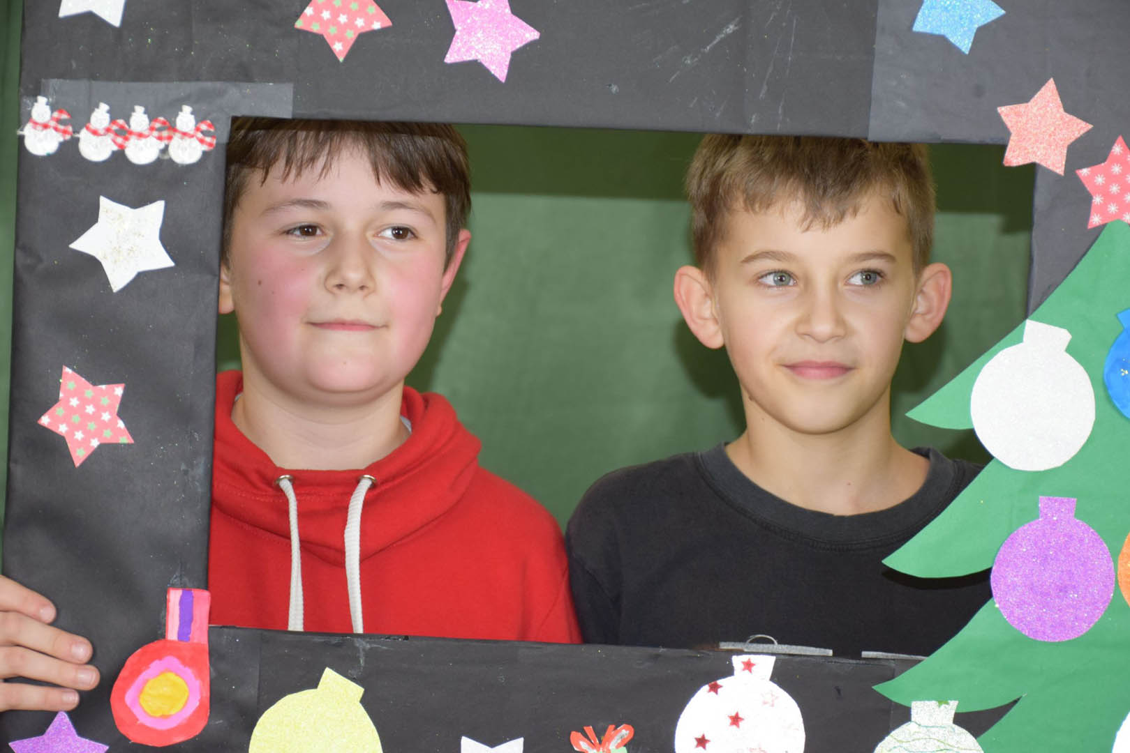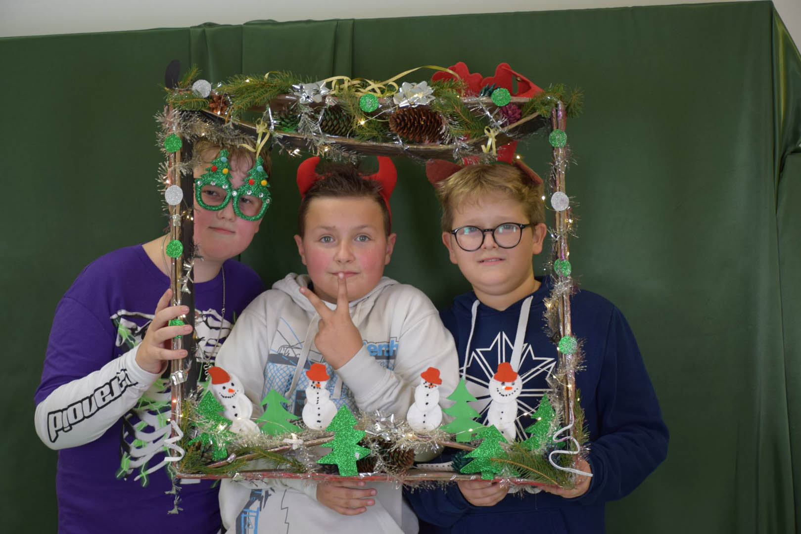 Podczas szkolnej zabawy choinkowej klasa V zorganizowała fotobudkę, chociaż śmiało można byłoby ją nazwać profesjonalnym studiem fotograficznym. Każdy uczestnik zabawy mógł uwiecznić chwile beztroskiej radości, robiąc sobie oryginalne zdjęcia. Młodzi adepci sztuki fotograficznej zadbali o tło, oświetlenie a nawet zabawne rekwizyty. Uczniowie sami wykonali nawiązujące do karnawału ramki. Modele mogli więc wybrać sobie obramowanie ozdobione: bombkami, łańcuchami, prezentami, rogami reniferów, a nawet świecące. Do charakteryzacji wykorzystywali kokardy, rogi reniferów, okulary i wąsy. Uczniowie, bawiąc się, zgłębiali jednocześnie tajniki fotografii. Wykorzystywali przy tym sprzęt zakupiony w ramach rządowego programu Laboratoria przyszłości: zestaw oświetleniowy softbox oraz aparat fotograficzny Sony ZV-1.