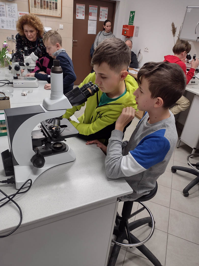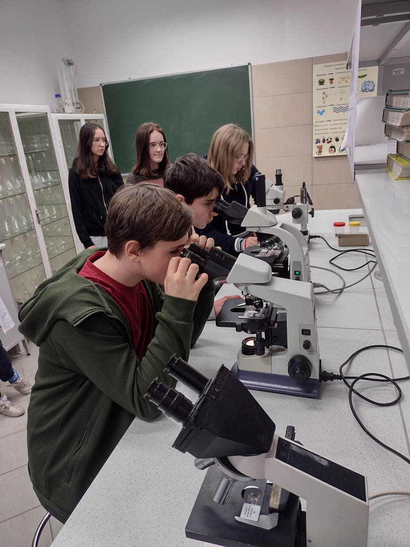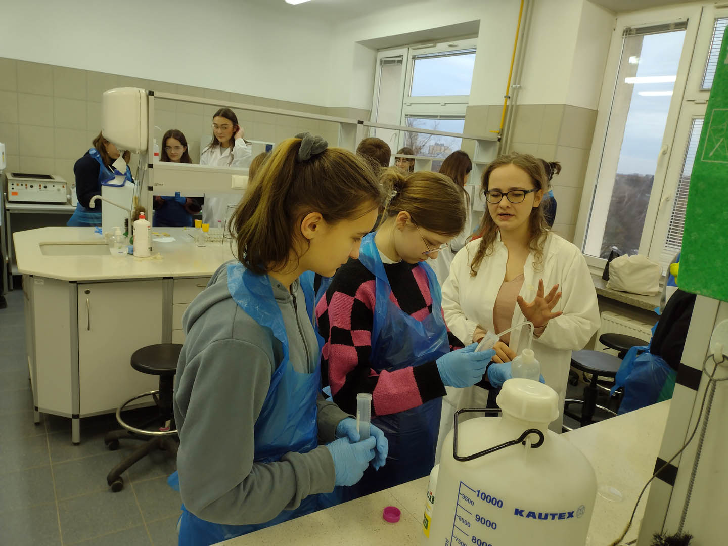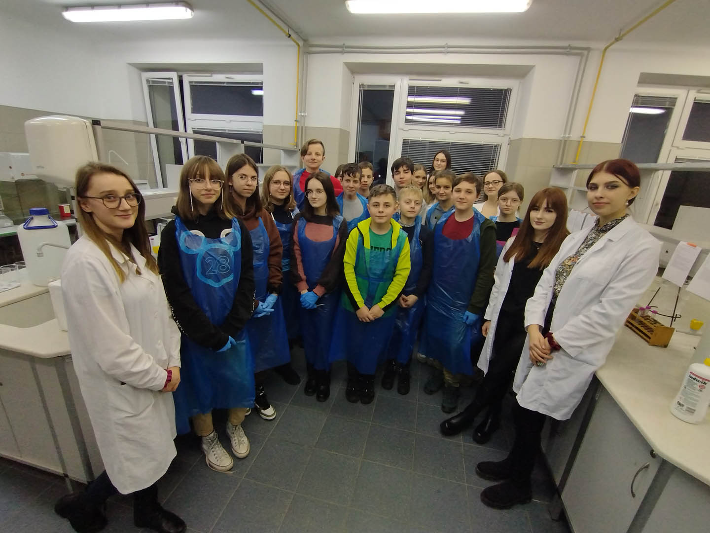 Dnia 13 stycznia 2023 r. uczniowie naszej szkoły wzięli kolejny już raz udział w ogólnopolskiej akcji „Noc Biologów”. W tym dniu „noc” dla uczniów rozpoczęła się już krótko po godzinie 15, bo na tę godzinę były zaplanowane pierwsze zajęcia na Wydziale Biologii i Biotechnologii UMCS w Lublinie. Młodzież uczestniczyła w warsztatach, pokazach, a także zajęciach laboratoryjnych. Uczestnicy warsztatów „Wiem, co jem” wykrywali skrobię w produktach spożywczych, dokonywali izolacji kwasów nukleinowych z owoców, rozdzielali i badali skład barwników obecnych w dostępnych słodyczach. Na zajęciach laboratoryjnych „Pyłek roślinny i zapylanie” oraz „Kwiaty, pszczoły i owoce. Współdziałanie dla bioróżnorodności” poznawali budowę kwiatów, ziaren pyłku i pszczoły miodnej, a także zostali zapoznani z procesem zapylenia. W trakcie zajęć korzystali z mikroskopów, obserwując pyłek roślin zbierany przez pszczoły, a także sami sporządzali preparaty mikroskopowe. Mogli sobie uświadomić znaczenie pyłku oraz procesów zapylania w przyrodzie i działalności człowieka. Na pokazach pt. „Opowieści z krypty” odbyła się prezentacja wybranych narządów anatomicznych oraz ciekawostek dotyczących ich budowy i funkcjonowania. Ostatnim punktem imprezy były warsztaty „Bezkręgowce na wyciągnięcie ręki”, gdzie każdy uczestnik mógł samodzielnie wykonać preparat mikroskopowy z żywym organizmem, a także poobserwować i „pogłaskać” żywe owady tropikalne. Czy młodzi adepci nauki dobrze się bawili? Zobaczcie sami…