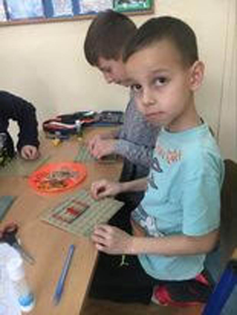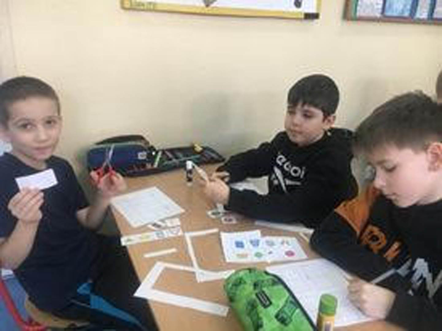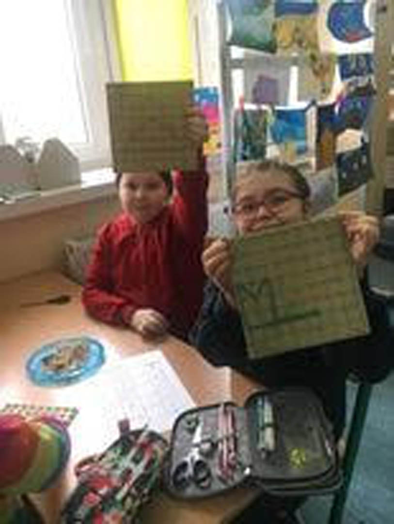 Podczas piętnastominutowej przerwy uczniowie klas pierwszej, drugiej oraz dwóch trzecich spędzali czas na matematycznych zabawach. Z dużym zaangażowaniem uczniowie porządkowali figury geometryczne płaskie: wycinali je, przyporządkowywali do odpowiedniej kategorii i wklejali wybrane obrazki. Była to doskonała zabawa utrwalająca znajomość figur płaskich, a przy okazji pokazująca, że geometria nie musi być nudna.