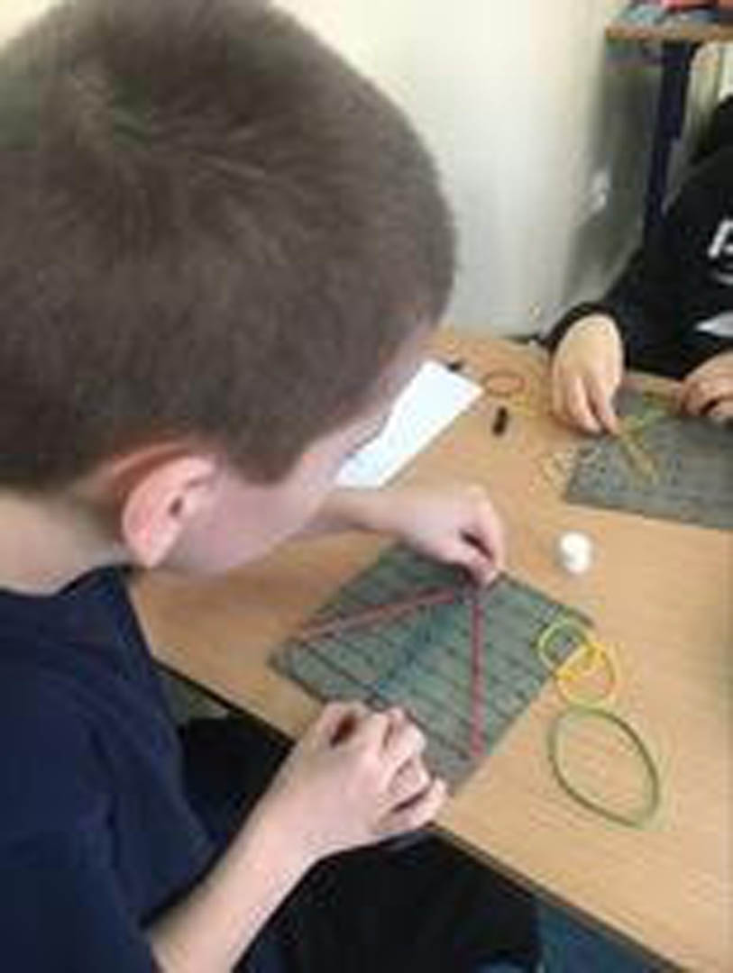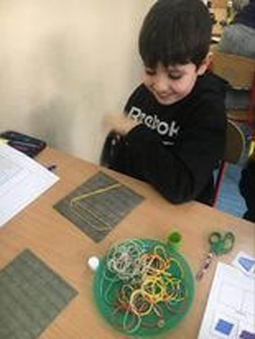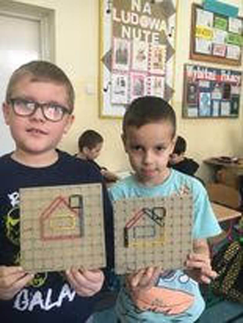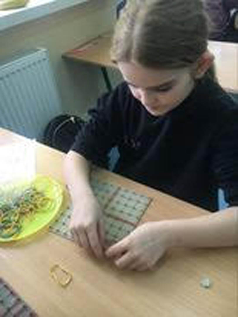 Kontynuując zabawę z geometrią uczniowie podczas przerwy rozwijali swoje umiejętności manualne i intelektualne, ćwiczyli koordynację wzrokowo-ruchową a przy tym uczyli się skupienia i koncentracji, bawiąc się geoplanami. Niczym Leonardo da Vinci wykazywali związki matematyki ze sztuką, tworząc kształty i obrazy z kolorowych gumek.