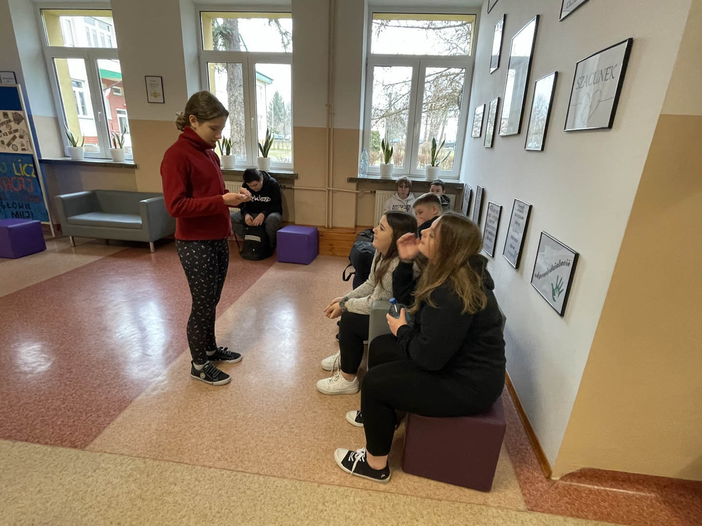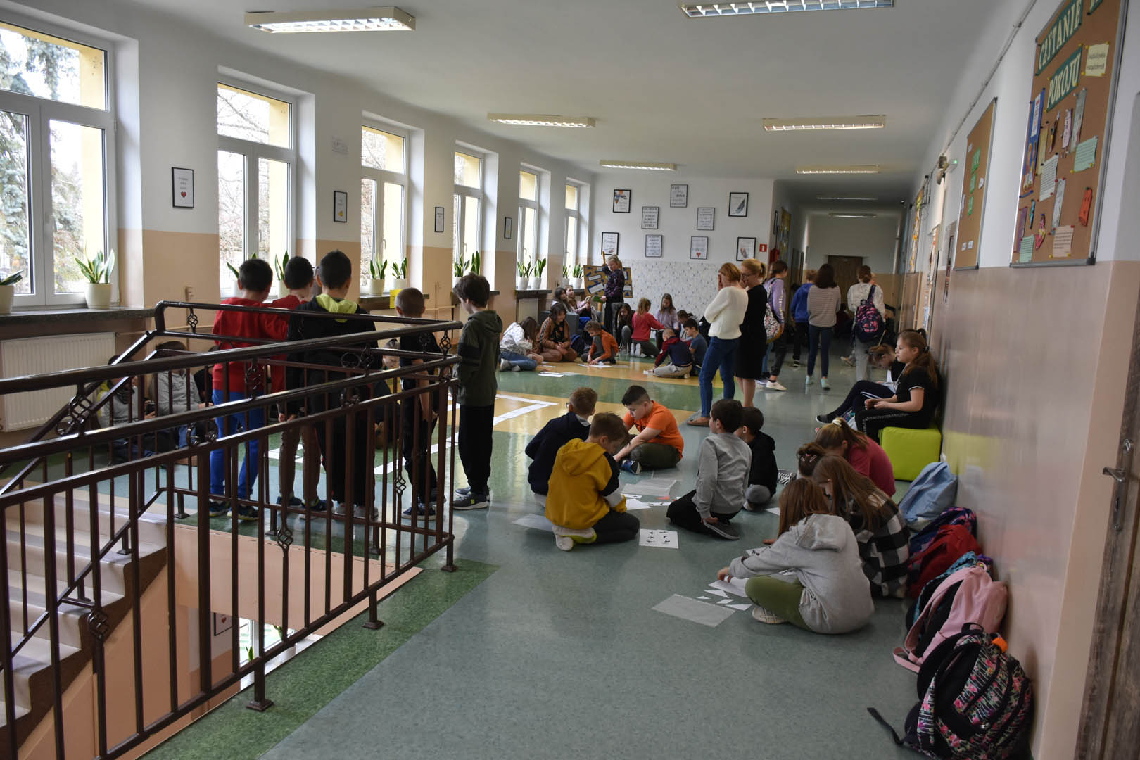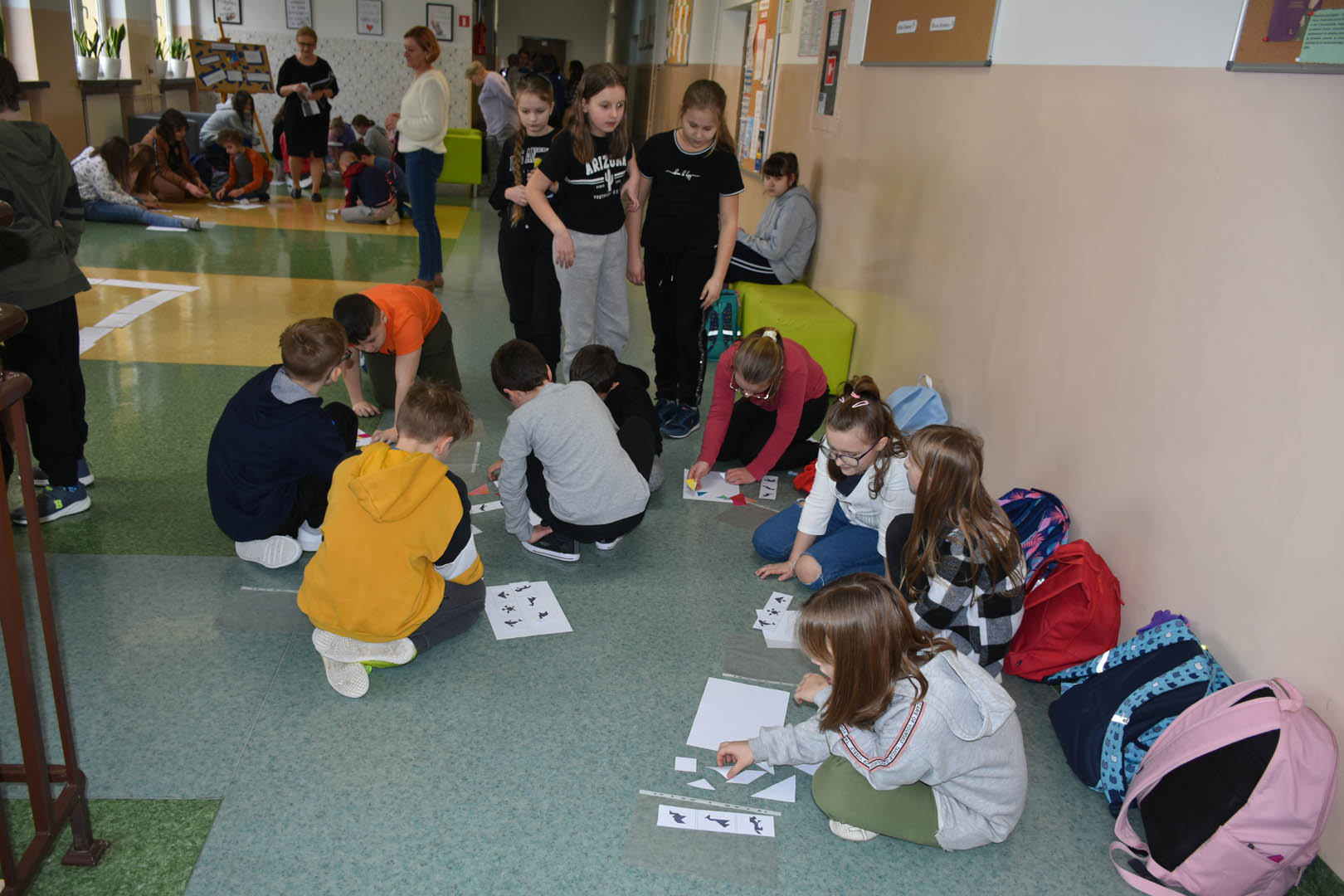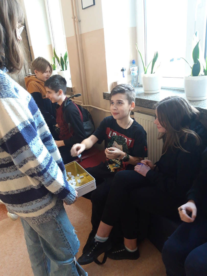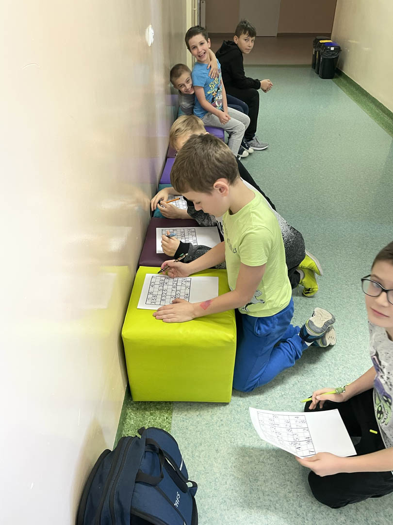 Także między lekcjami uczniowie bawiąc się, doskonalili umiejętność myślenia. Na przykład mierzyli się z tangramami, sudoku i dominami matematycznymi. Wykonywali proste działania matematyczne przygotowane przez dziewczęta z klasy VIII b w ramach happeningu pod hasłem: ,,Bądź zawsze na plusie” i „Matematyka jest piękna” oraz układali puzzle z zamianą jednostek pola, a także przeprowadzili na korytarzu quiz “prawda czy fałsz” z własnościami figur przestrzennych przygotowane przez uczniów klas VII i VIII a.