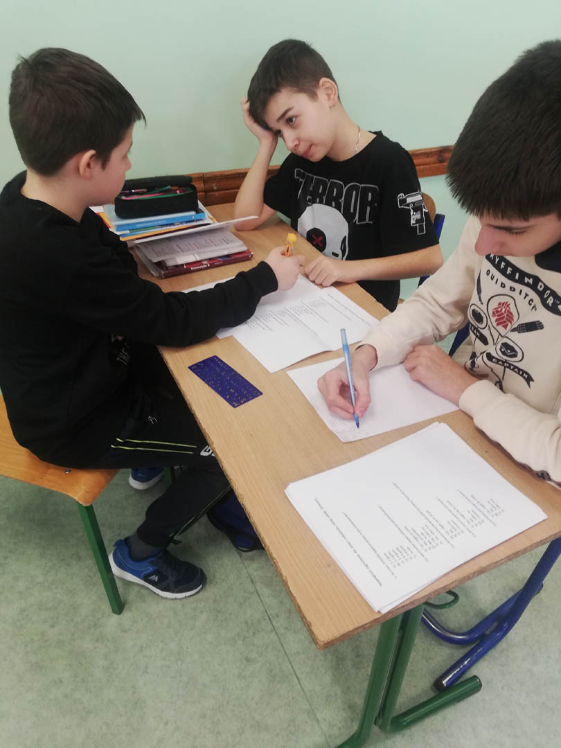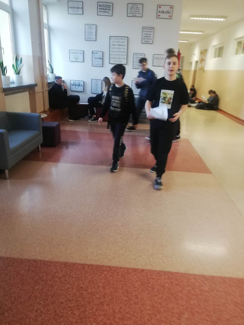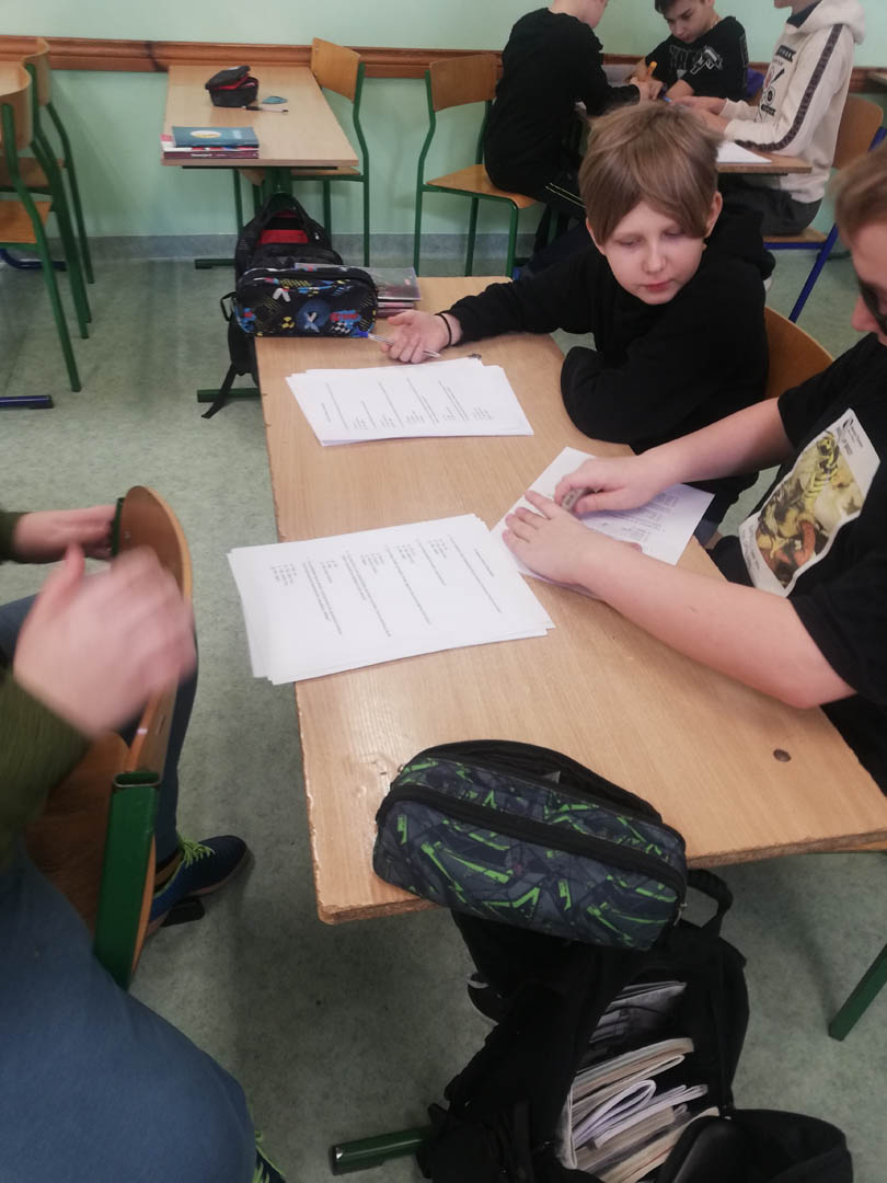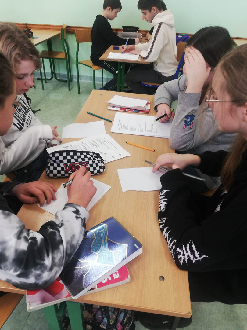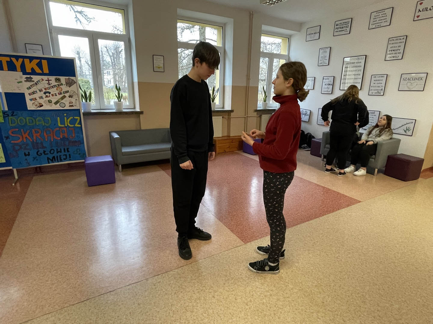 Także między lekcjami uczniowie bawiąc się, doskonalili umiejętność myślenia. Na przykład mierzyli się z tangramami, sudoku i dominami matematycznymi. Wykonywali proste działania matematyczne przygotowane przez dziewczęta z klasy VIII b w ramach happeningu pod hasłem: ,,Bądź zawsze na plusie” i „Matematyka jest piękna” oraz układali puzzle z zamianą jednostek pola, a także przeprowadzili na korytarzu quiz “prawda czy fałsz” z własnościami figur przestrzennych przygotowane przez uczniów klas VII i VIII a.
