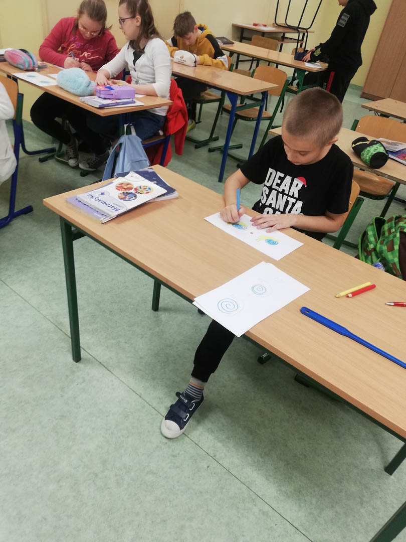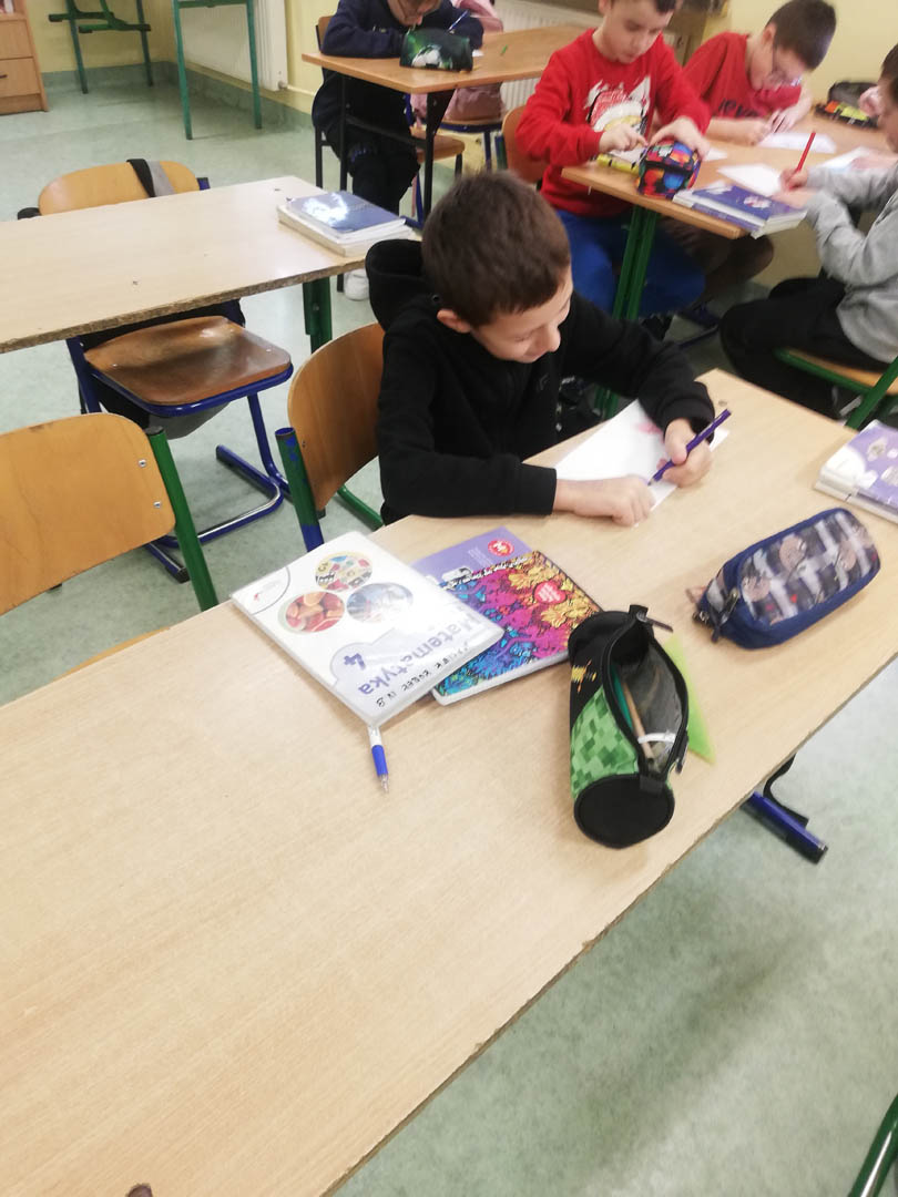 Podczas piętnastominutowej przerwy uczniowie klas pierwszej, drugiej oraz dwóch trzecich spędzali czas na matematycznych zabawach. Z dużym zaangażowaniem uczniowie porządkowali figury geometryczne płaskie: wycinali je, przyporządkowywali do odpowiedniej kategorii i wklejali wybrane obrazki. Była to doskonała zabawa utrwalająca znajomość figur płaskich, a przy okazji pokazująca, że geometria nie musi być nudna.