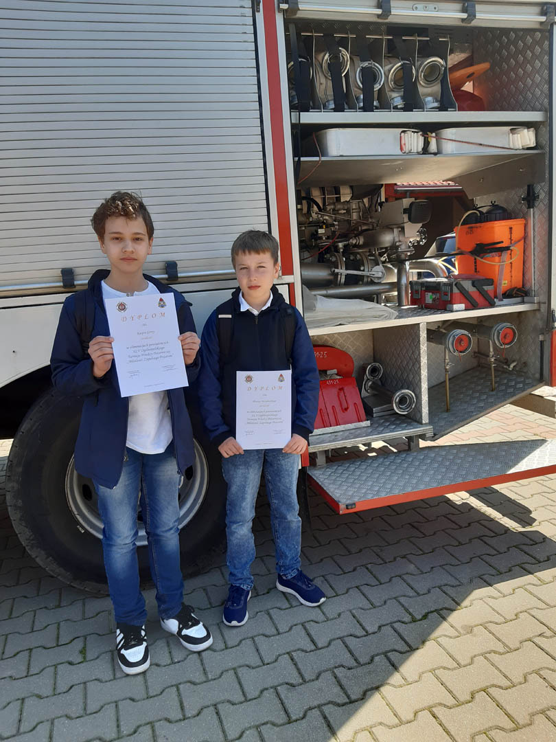 Pod takim hasłem 21 kwietnia br. w KP PSP w Krasnymstawie uczniowie  naszej szkoły (kl. IV a – B. Morylowski,  kl. VI a – K. Górny)  przystąpili do 45 edycji Ogólnopolskiego Turnieju Wiedzy Pożarniczej. Celem Turnieju jest odpowiednie kształtowanie świadomości młodzieży na płaszczyźnie bezpieczeństwa pożarowego. Dzięki udziałowi w przedsięwzięciu uczniowie  poszerzają i systematyzują swoją wiedzę na temat organizacji ochrony przeciwpożarowej. Błażej i Kacper dzielnie zmagali się z trudnymi pytaniami i wspaniale reprezentowali naszą szkołę. Oto fotorelacja z przebiegu Turnieju: