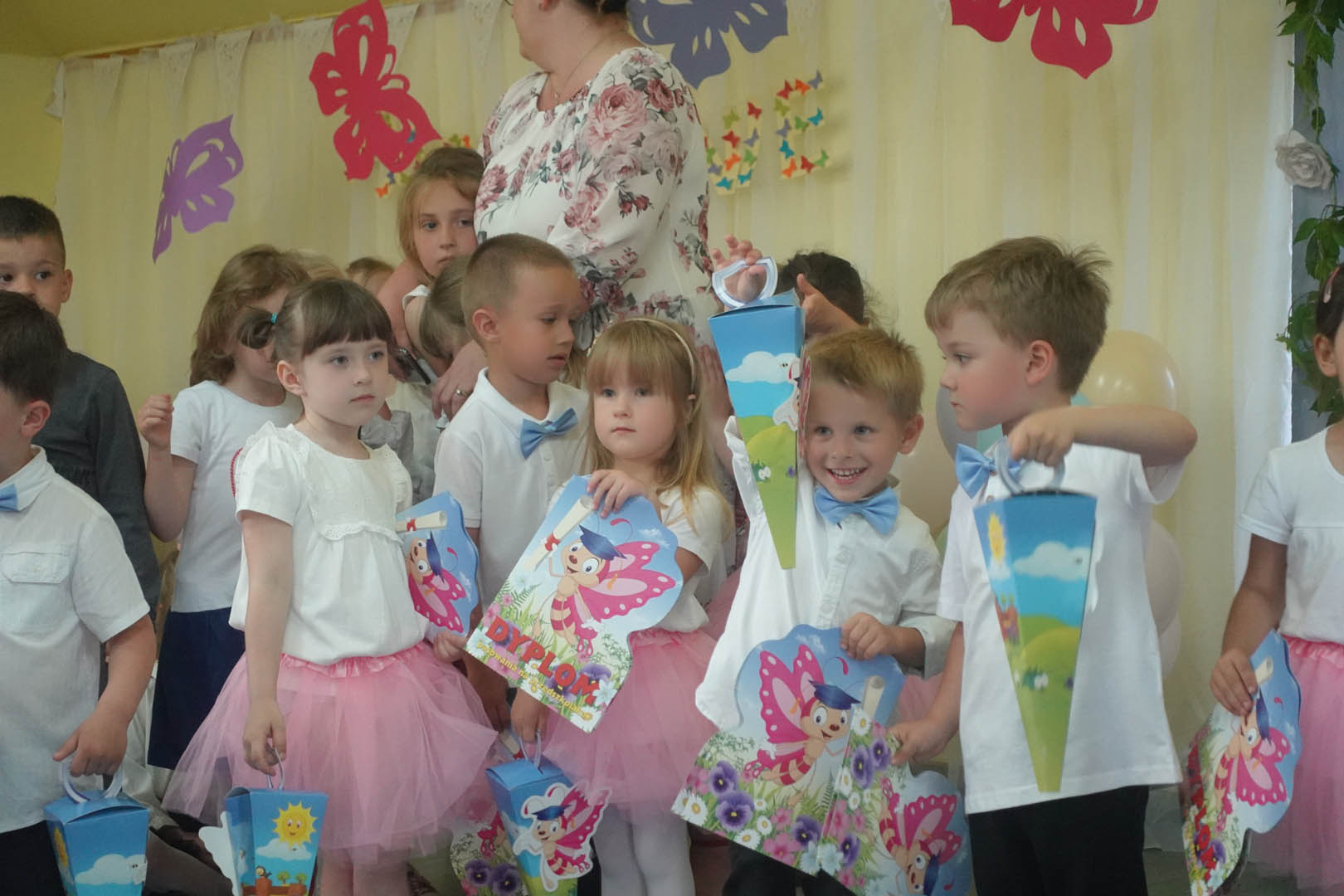 Dzieci z grupy Motylki na przedszkolaków pasowała pani Katarzyna Czajka, dyrektor Szkoły Podstawowej im. Synów Pułku w Siennicy Różanej.  Na zakończenie dzieci otrzymały dyplomy oraz upominki przygotowane przez rodziców, kolegów i koleżanki ze starszych grup.