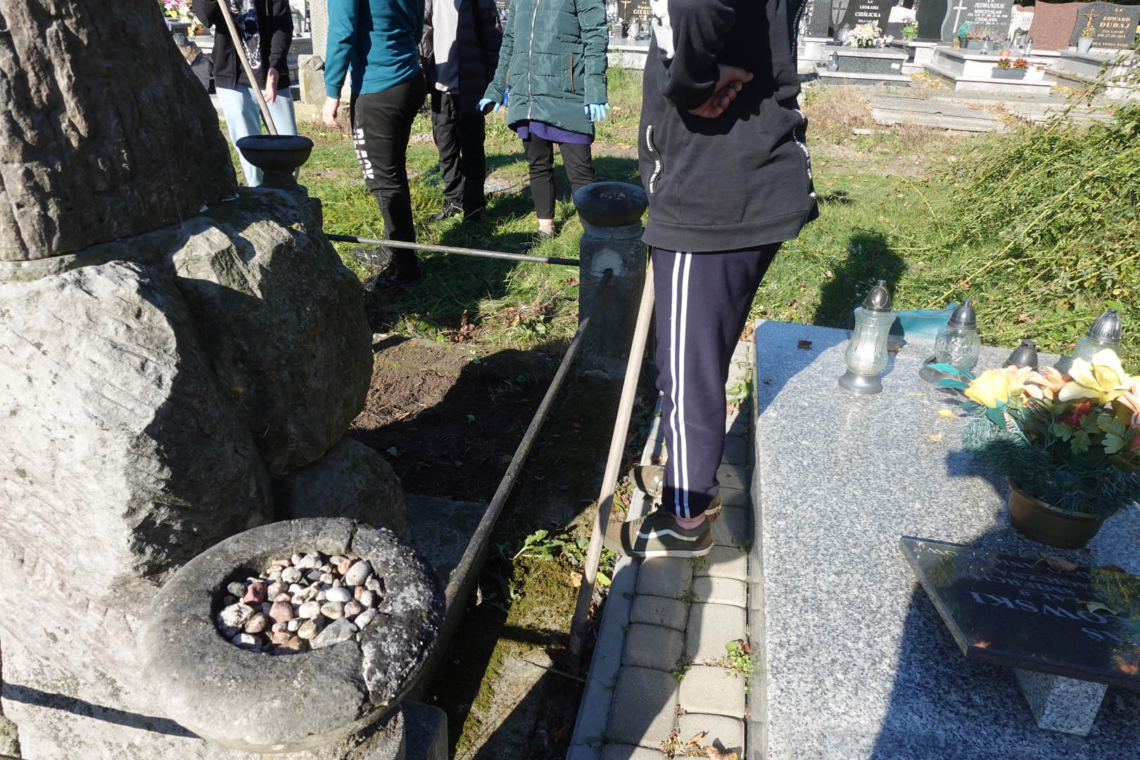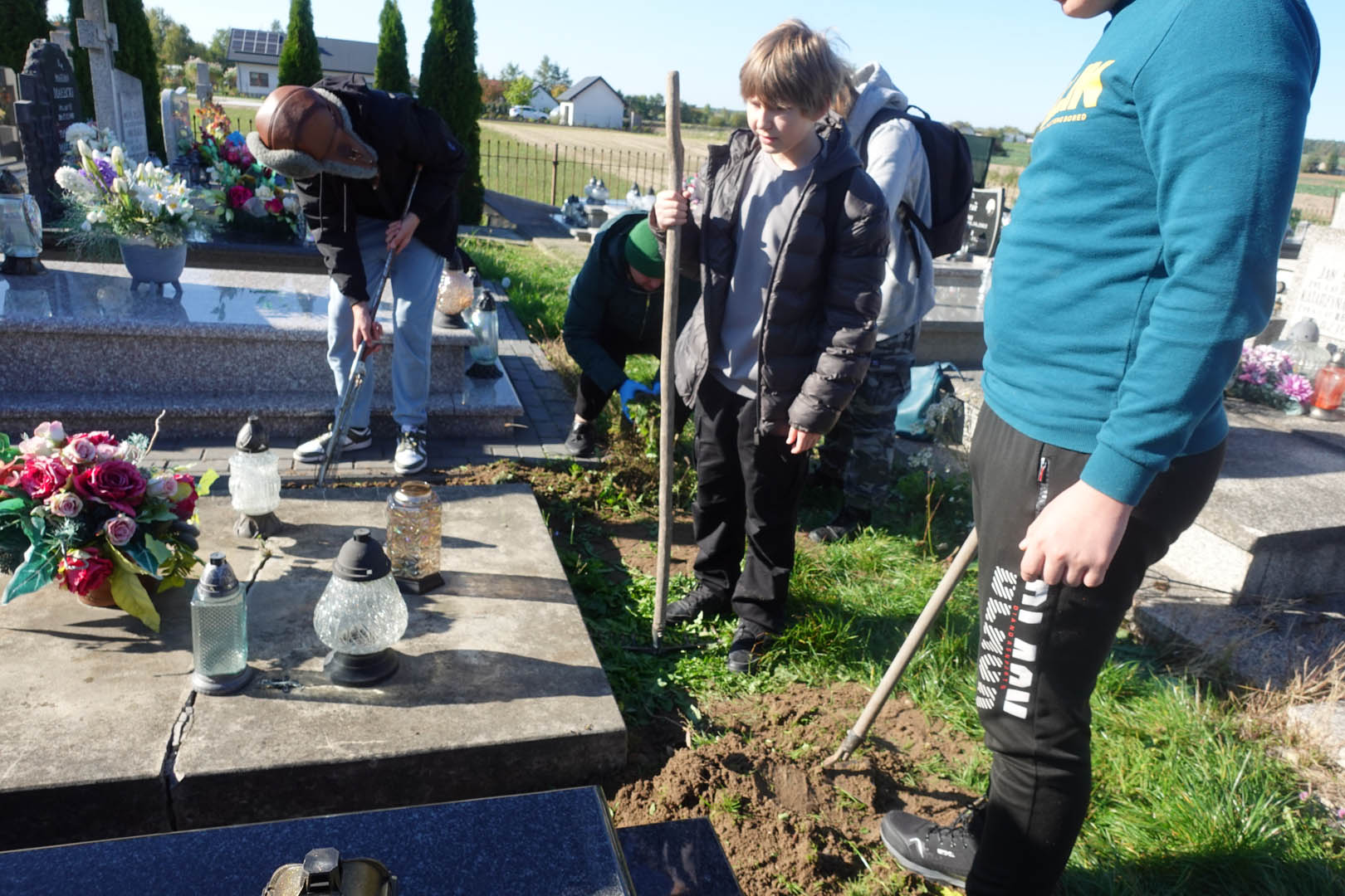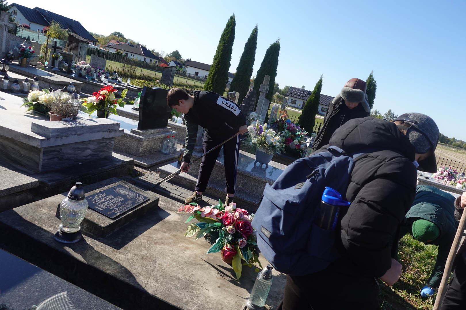 W dniu 18 października grupa uczniów ze Szkolnego Klubu Wolontariusza ,,Iskierki” i kl. VIII b wraz z opiekunem i p. katechetką M. Berbeć udała się na cmentarz parafialny