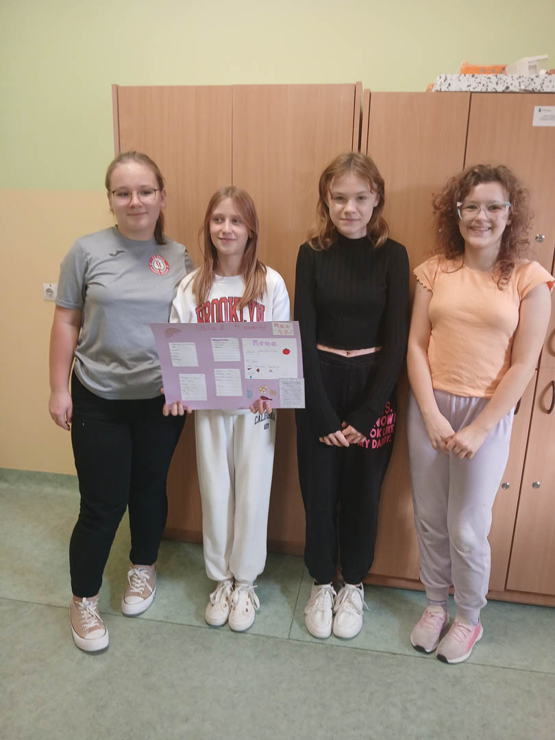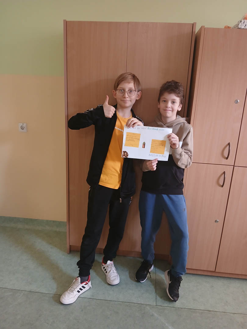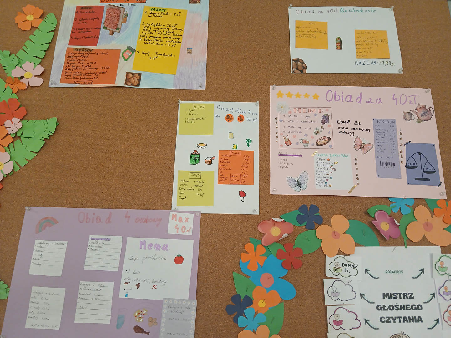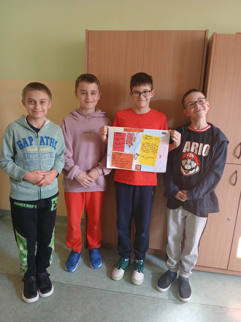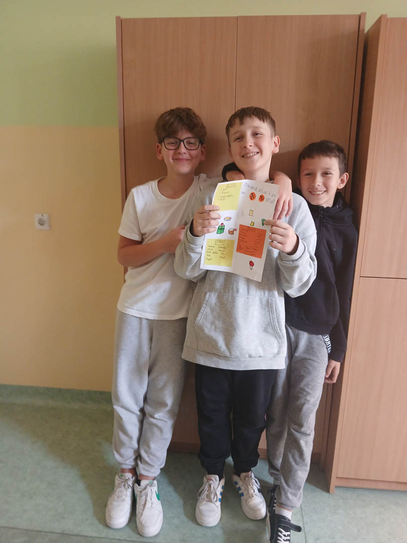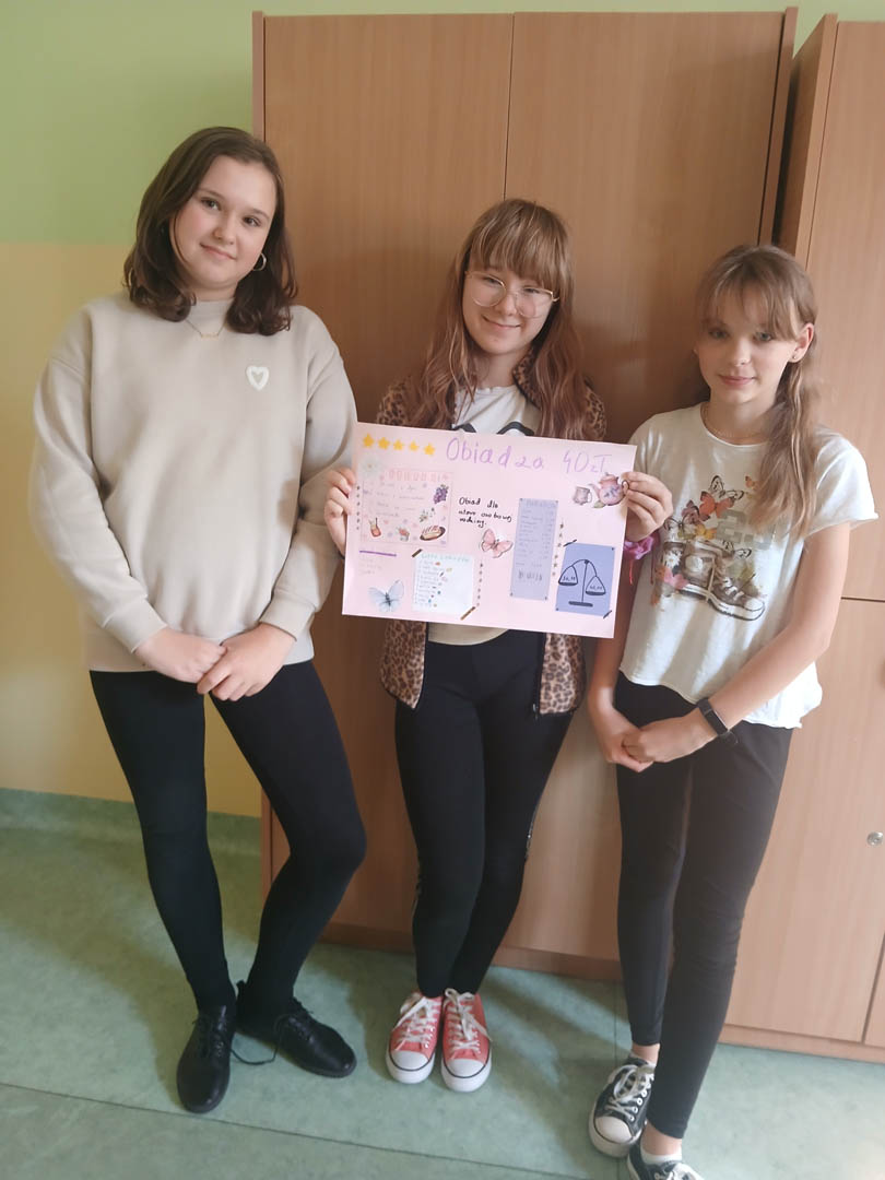 Uczniowie klasy VI a podczas zajęć innowacji matematycznej zmierzyli się z trudnym zadaniem ustalenia, czy można przygotować obiad dla czteroosobowej rodziny za 40 zł? Obiad musiał składać się z zupy, drugiego dania i deseru. Poza wiedzą kulinarną uczniowie musieli również wykazać się umiejętnością obliczania kosztów zakupów. Wielokrotnie byli zmuszeni do  weryfikowania swoich pomysłów, aby zmieścić się w określonej kwocie. Zadanie to wymagało od uczniów kreatywności, umiejętności szacowania oraz wykonywania działań na ułamkach dziesiętnych. Efektem końcowym są plakaty przedstawiające menu, listę zakupów oraz paragon za niezbędne zakupy.