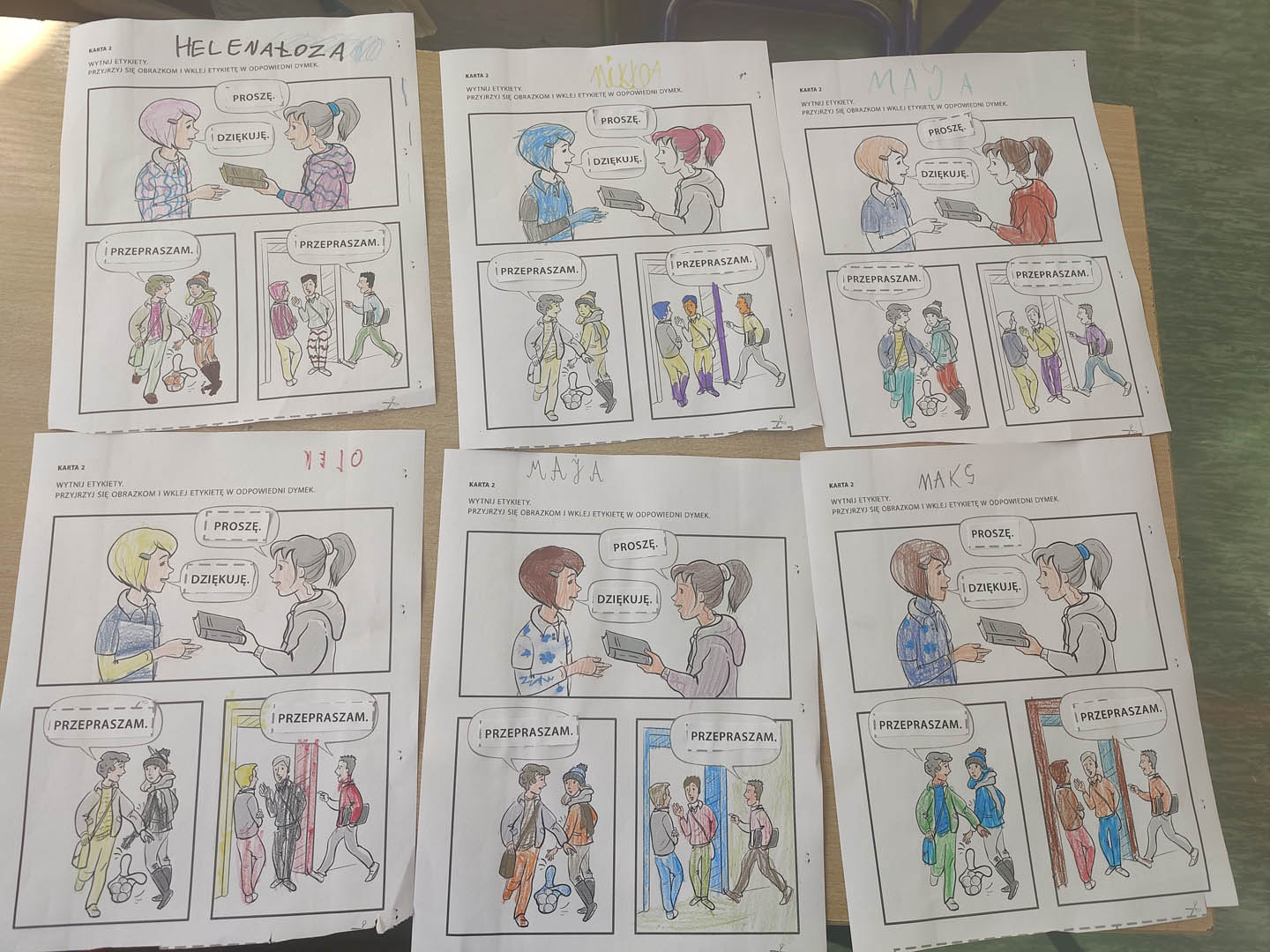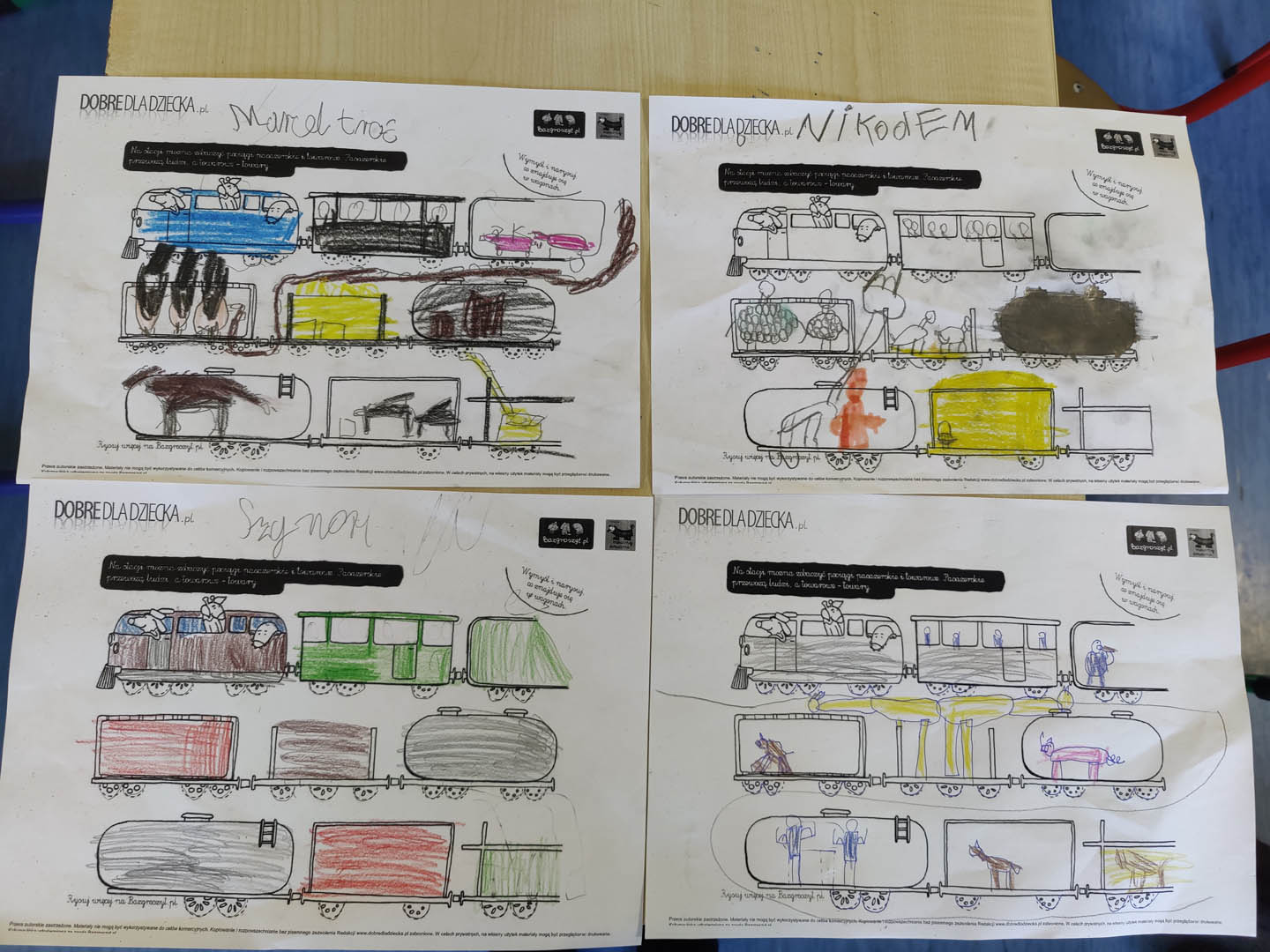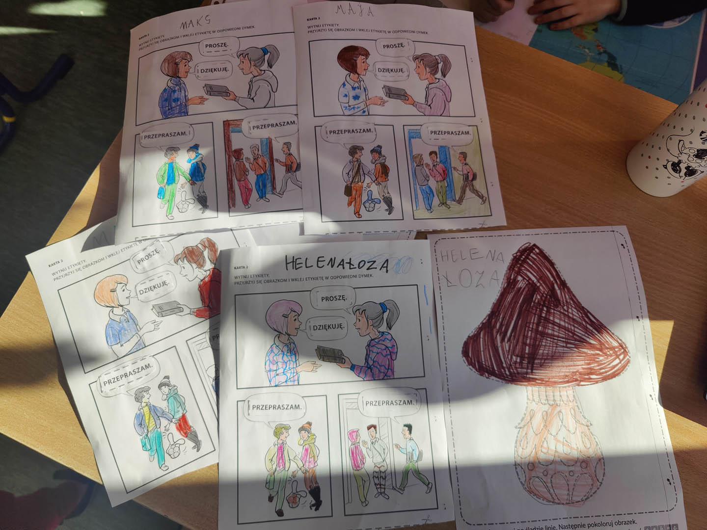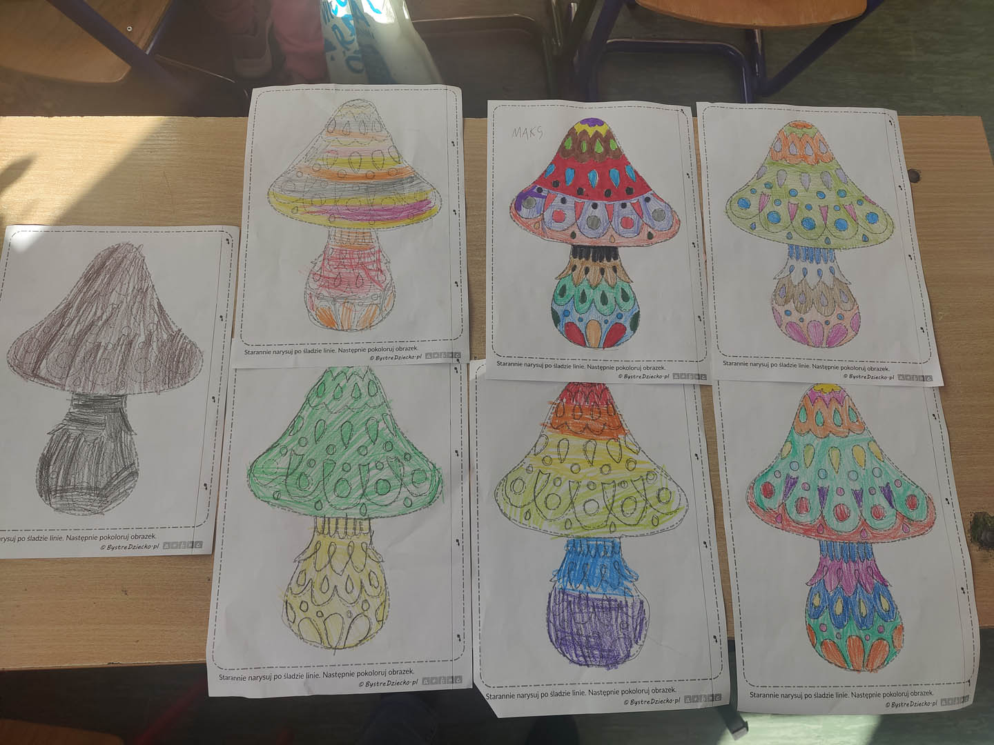 Październik obfitował w jesienne prace liści i grzybów naszych Świetliczaków. Wybraliśmy się również w podróż w kosmos z naszymi robotami i rakietami przygotowanymi na konkurs „Rakieta czy robot?”. Pierwszo i drugoklasiści wsiadając z uśmiechem do pociągu, gdzie wagonów było chyba ze czterdzieści, interpretowali plastycznie wiersz Juliana Tuwima „Lokomotywa”. Zasłuchani i zainteresowani polską poezją przez kolejny tydzień tworzyli niesamowite prace do konkursu „Ilustracja do mojego ulubionego wiersza polskiego poety”. Świetliczaki wybrały m.in. takie utwory jak: „Kaczka dziwaczka”, „Entliczek Pentliczek”, „Na straganie”, „Leń” Jana Brzechwy, „Niezapominajki” Marii Konopnickiej, „Chory kotek” Stanisława Jachowicza, czy „Przygoda autka” Doroty Skwark. Nie zapominajmy również o ciężkiej, mozolnej pracy naszych ambitnych Świetliczków każdego dnia, za co pragnę ich serdecznie pochwalić. Na co dzień trenują grafomotorykę małą nie tylko poprzez malowanie, ale także naukę pisania literek, wyrazów, poprawiania linii po śladzie. Nauka czytania, wyszukiwanie sylab, tworzenie nowych wyrazów dawały dzieciom również wiele zabawy i radości. Zasady właściwej postawy, a przede wszystkim przypomnienie o potrzebie używania magicznych słów przyniosły na zajęciach więcej uśmiechu i pogody ducha J Świetliczaki poznały także nowe słówka z angielskiego, a prace halloweenowe z pytaniem „Trick or treat?” zakończyły na słodko zajęcia w październiku.
