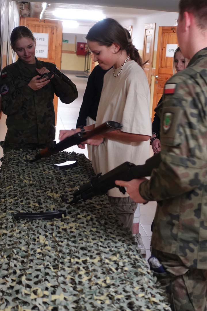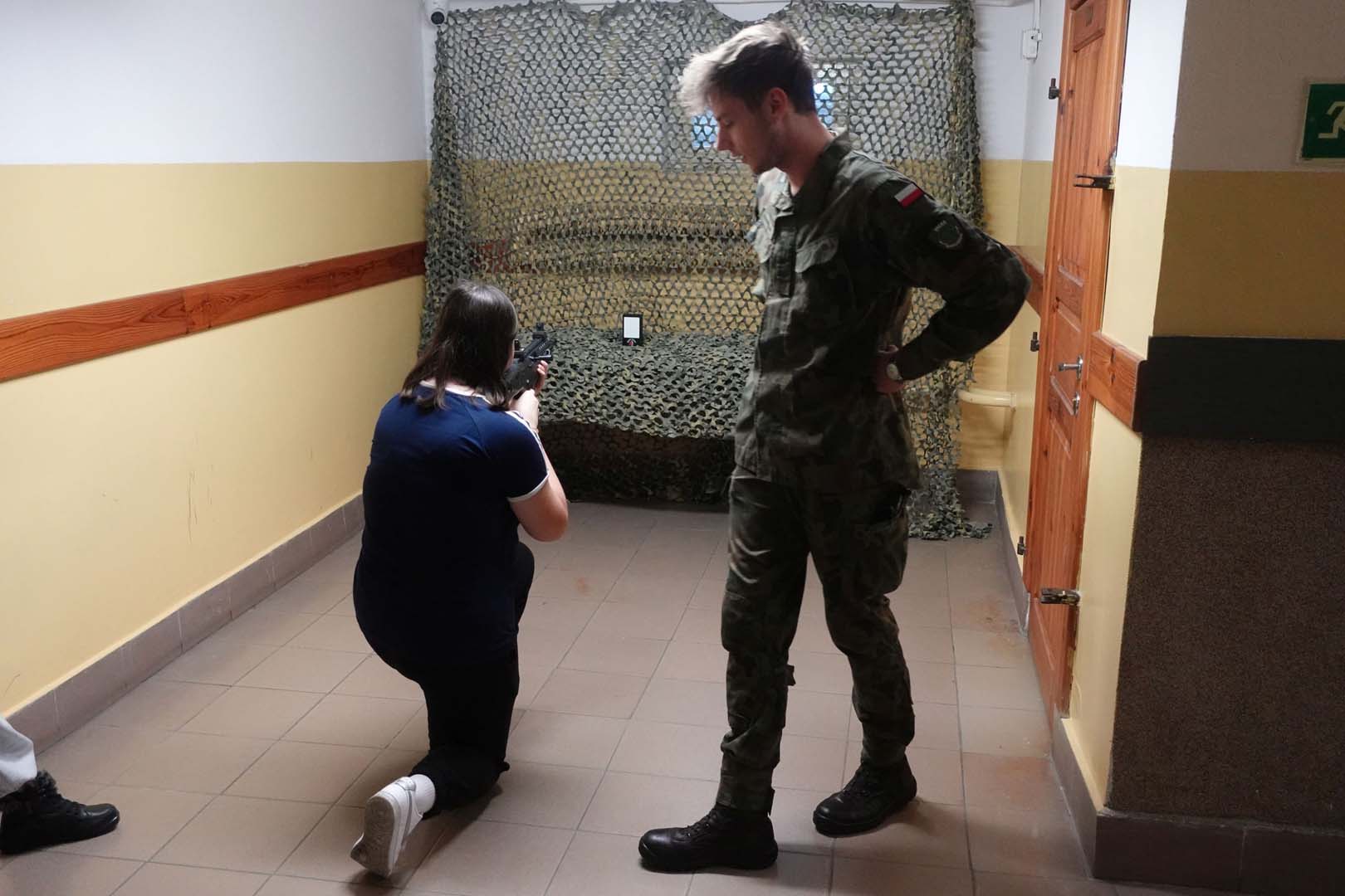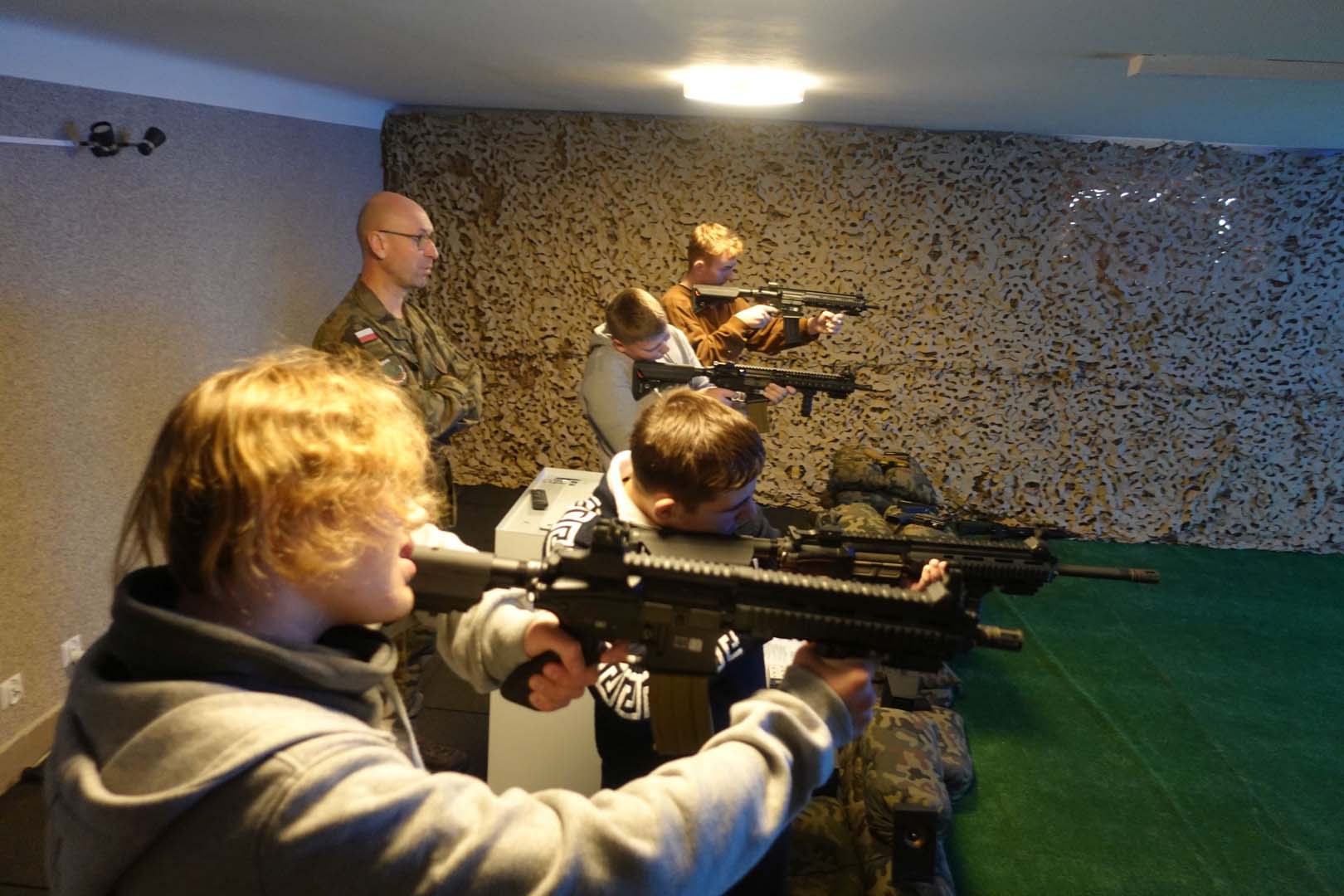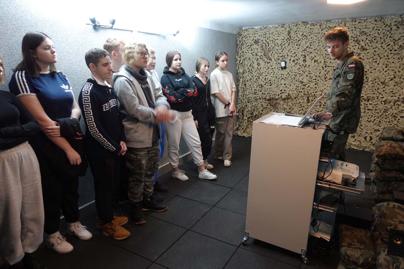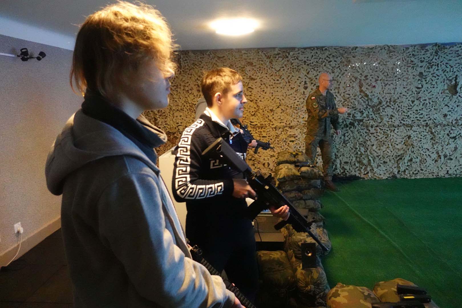 Druga część warsztatów prowadzona była przez pułkownika Sławomira Kułagę. Uczniowie mieli okazję nauczyć się podstaw obsługi broni palnej – rozbierania i składania broni. Dodatkowo każdy uczestnik sprawdzał swoje umiejętności na strzelnicy, strzelając z broni krótkiej i długiej. To niecodzienne doświadczenie wzbudziło ogromne zainteresowanie wśród młodzieży.