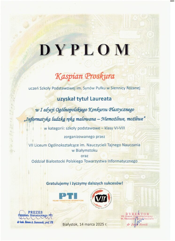 Z ogromną radością informujemy, że Kaspian Proskura, uczeń klasy 7, został laureatem ogólnopolskiego konkursu “Informatyka ludzką ręką malowana – Niemożliwe, możliwe” organizowanego przez VII Liceum Ogólnokształcące im. Nauczycieli Tajnego Nauczania w Białymstoku oraz Oddział Białostocki Polskiego Towarzystwa Informatycznego. Konkurs miał na celu promowanie kreatywnego spojrzenia na świat nowych technologii poprzez sztukę.