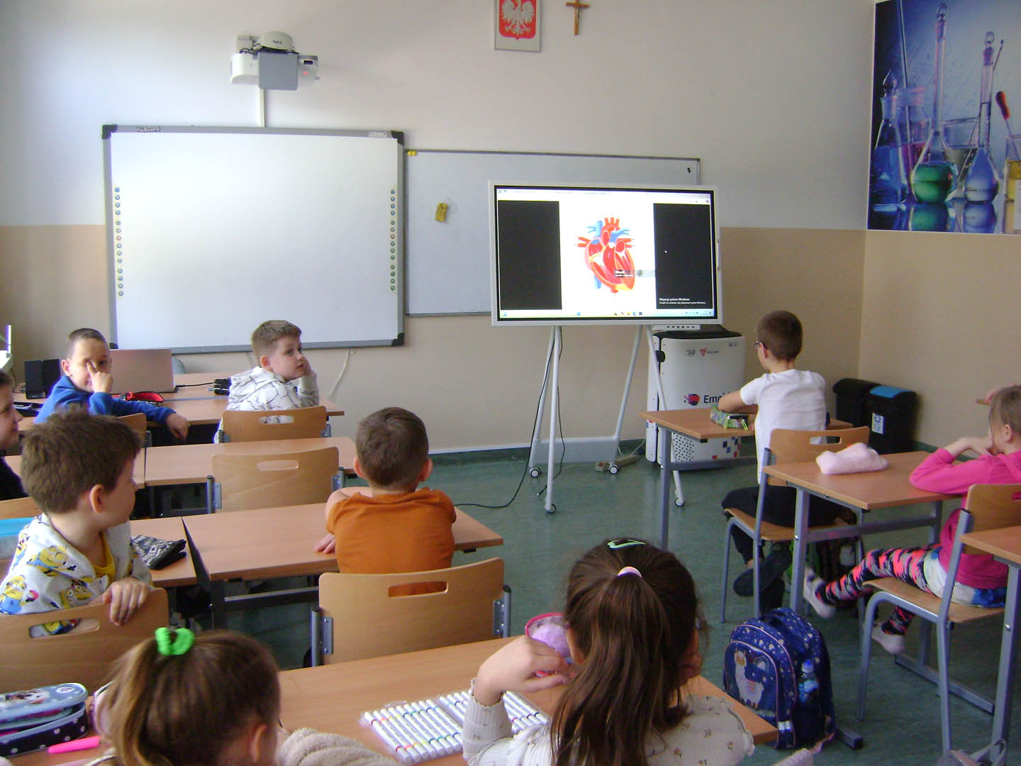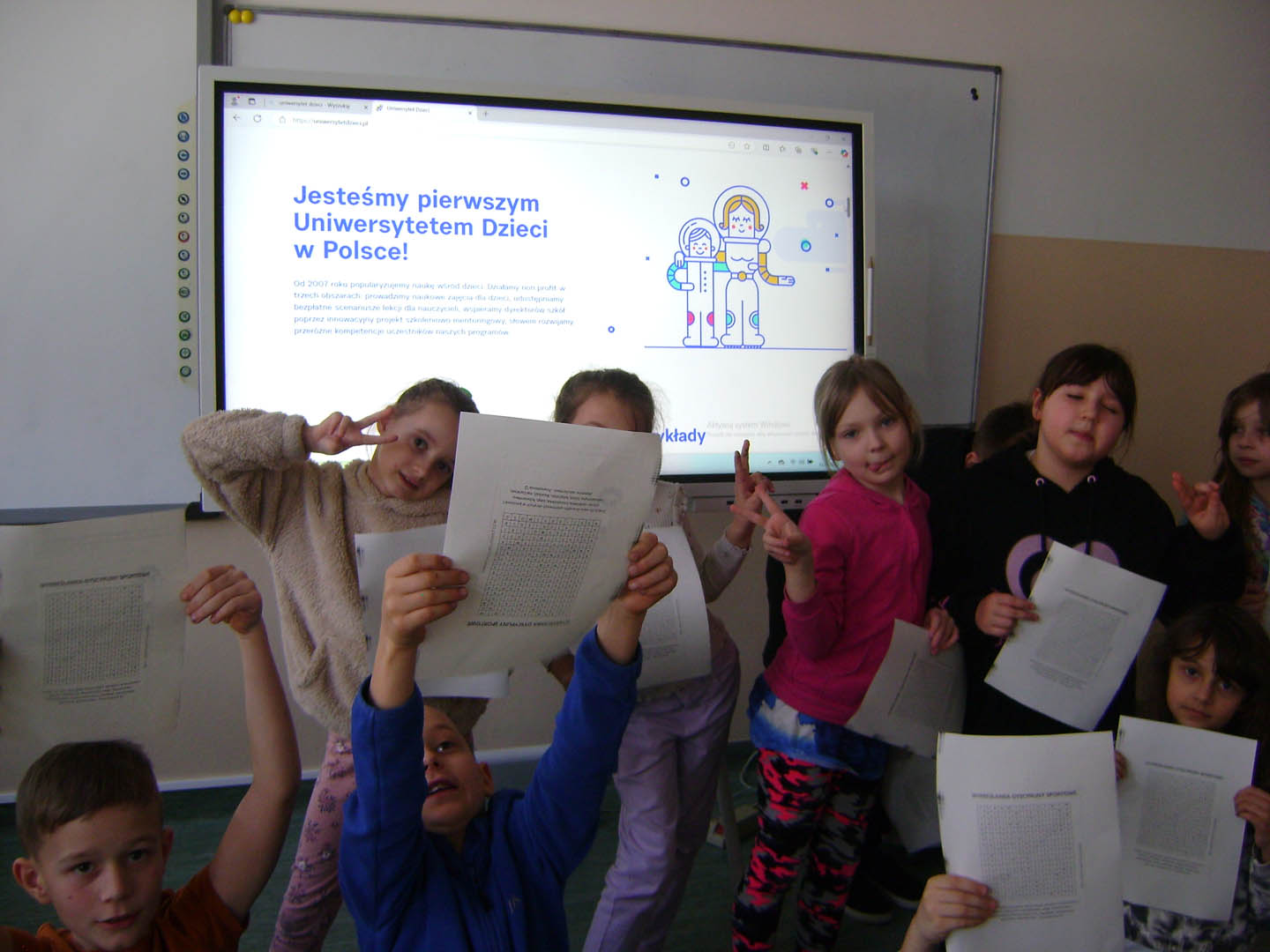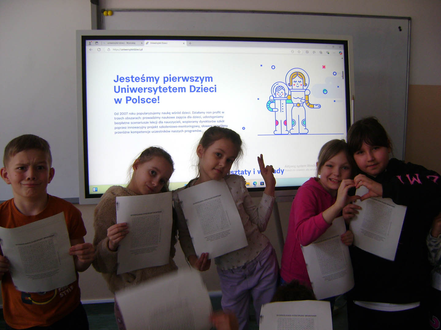 10 marca uczniowie klasy drugiej podczas zajęć świetlicowych uczestniczyli w kolejnej lekcji, przedostatniej już z cyklu zajęć projektu edukacyjnego Uniwersytetu Dzieci. Świetliczaki tym razem wybrały temat – “Po co sportowiec się rozgrzewa?”. Zajęcia ukazały dzieciom potrzebę rozgrzewki przed zajęciami sportowymi, dowiedziały się również jak zbudowane jest serce oraz jak pracuje, z radością wszyscy mierzyli swoje tętno i zastanawiali się, jakie mogą być ćwiczenia podczas rozgrzewki. Wszyscy chętnie uzupełnili kolejny wpis do swojego indeksu, a w nagrodę za ciężką pracę podczas zajęć mogli szukać dyscyplin sportowych, jakie zostały ukryte w wykreślance. Dzisiejsze zajęcia zostały zrealizowane z wykorzystaniem sprzętu zakupionego w ramach programu „Laboratoria przyszłości”.