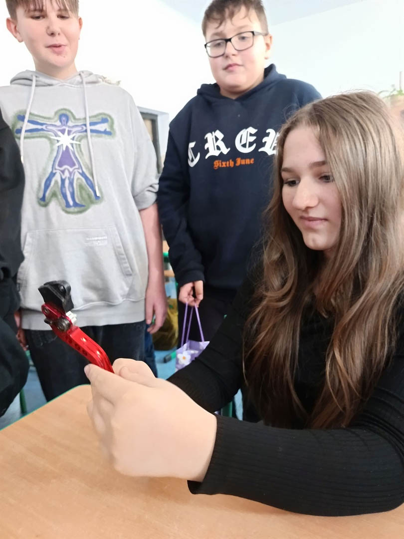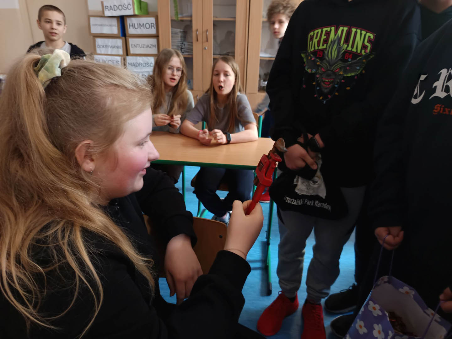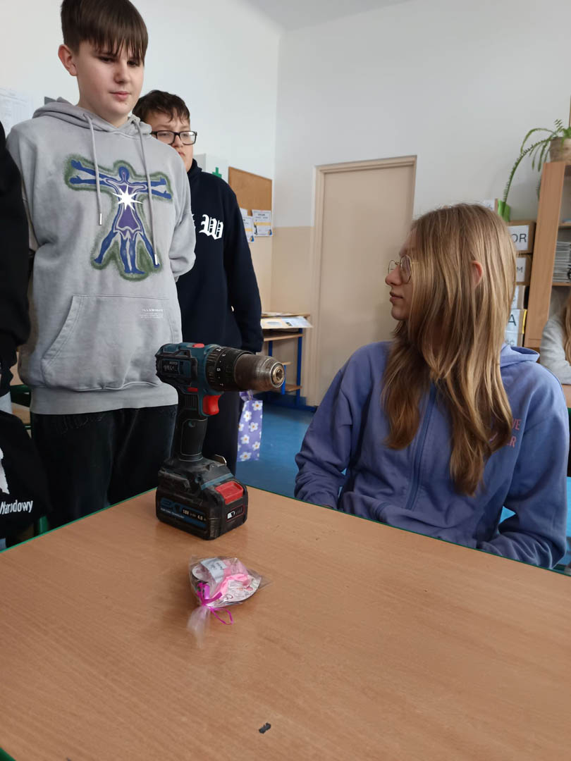 Pierwszym wyzwaniem dla dziewczyn było losowanie przedmiotów i określenie ich nazwy oraz zastosowania. Zadanie nie było łatwe, ponieważ chłopcy przygotowali narzędzia typowo „męskie” – można było zobaczyć kielnię, wkrętarkę, szpachlę, różnego rodzaju klucze, kątownik czy nawet mikrometr! Mimo trudności dziewczyny świetnie sobie poradziły, wykazując się kreatywnością i odwagą.