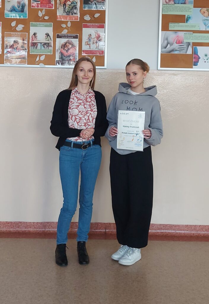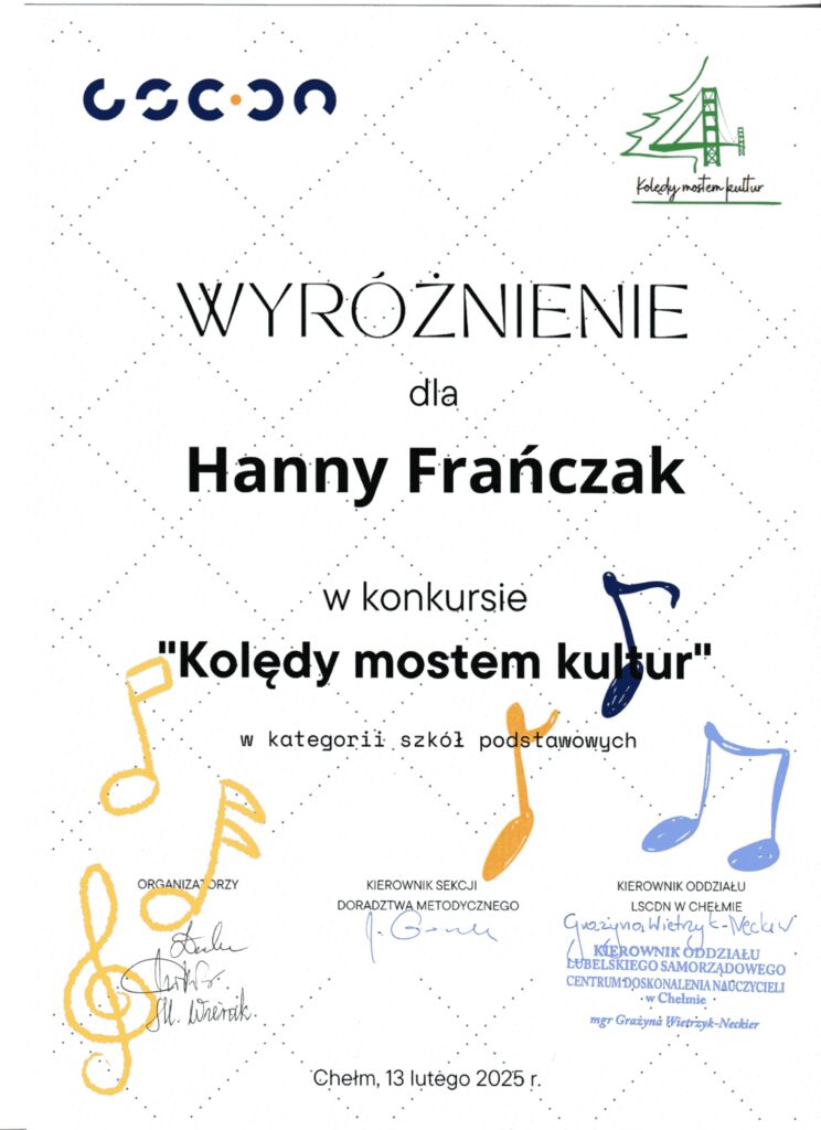Miło nam oznajmić, że uczennica Hanna Frańczak z klasy 8b otrzymała wyróżnienie w konkursie “Kolędy Mostem Kultur”, organizowanym przez LSCDN w Chełmie dla powiatu krasnostawskiego, chełmskiego i włodawskiego. Hania zaprezentowała swoje umiejętności wokalne, wykonując po niemiecku kolędę “Stille Nacht”.