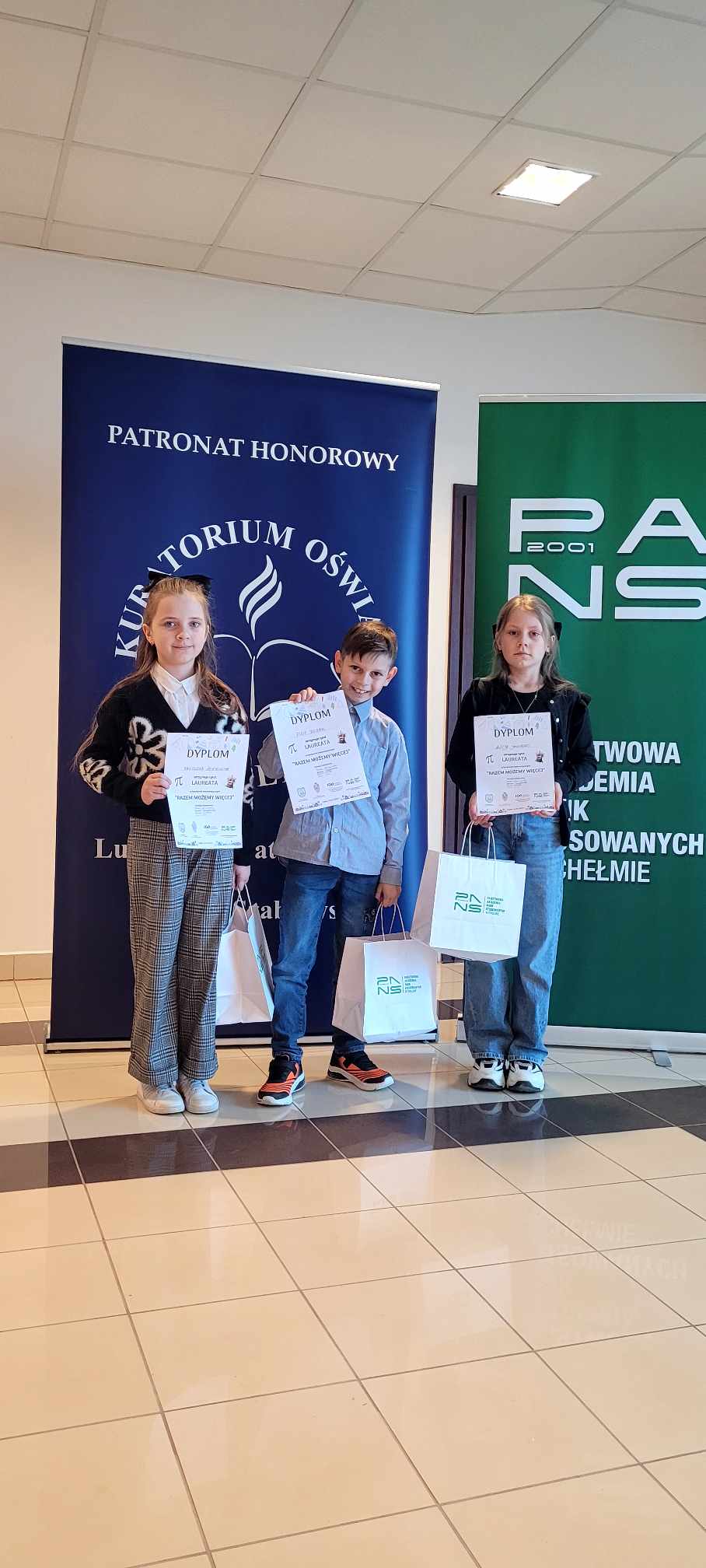 Z ogromną dumą informujemy, że Alicja Jakubiec, Filip Kozak i Marcelina Łontkowska, uczniowie klasy III, zajęli III miejsce i uzyskali tytuł laureata w pierwszej edycji konkursu matematycznego „Razem możemy więcej”, wykazując się wiedzą, logicznym myśleniem, zaangażowaniem i umiejętnością współpracy podczas zespołowego rozwiązywania matematycznych problemów. Organizatorem przedsięwzięcia była Państwowa Akademia Nauk Stosowanych w Chełmie. Wydarzenie objęli honorowym patronatem: Senator RP prof. PANS dr hab. Józef Zając, JM Rektor PANS prof. PANS dr Beata Fałda, Dyrektor Instytutu Matematyki i Informatyki dr Jarosław Kapeluszny oraz Lubelski Kurator Oświaty. Konkurs odbył się 14 marca 2025 roku w siedzibie uczelni. W rywalizacji wzięły udział 23 drużyny z klas trzecich szkół podstawowych z powiatów: chełmskiego, krasnostawskiego i włodawskiego. Celem konkursu było rozwijanie zainteresowań matematycznych, promowanie współpracy podczas rozwiązywania matematycznych problemów, zachęcanie uczniów do twórczego i krytycznego myślenia oraz kształtowanie umiejętności respektowania decyzji kolegów i koleżanek.