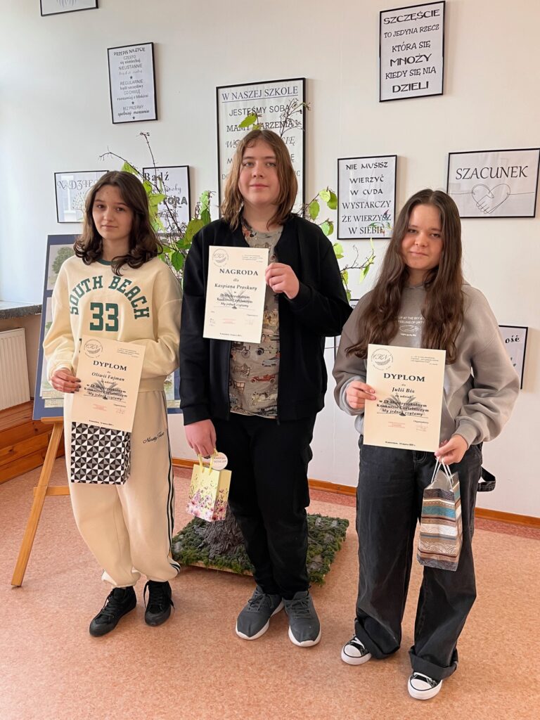 Naszą szkołę reprezentowali tym razem: Julia Bis, Oliwia Fajman i Kaspian Proskura. Wszyscy uczniowie wykazali się świetnym warsztatem pisarskim i pasją do literatury.