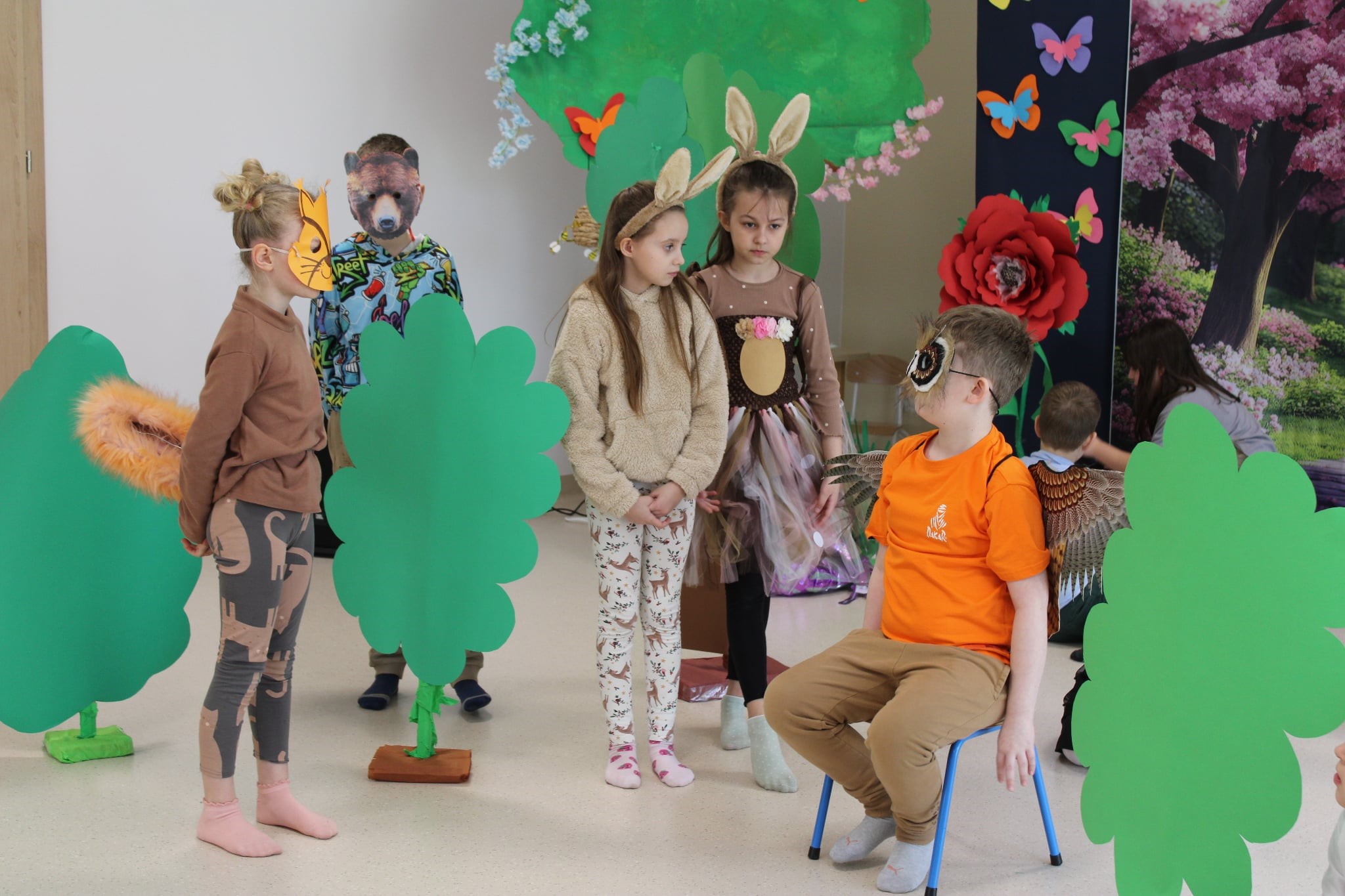 W ramach realizacji bloku tematycznego “Jesteśmy uczestnikami kultury” uczniowie klas drugich przygotowali i zaprezentowali przedstawienia teatralne, demonstrując swoje zaangażowanie oraz kreatywność. Klasa 2a przedstawiła spektakl pt. “Leśna opowieść”, koncentrujący się na tematyce ochrony lasów i zwierząt. Uczniowie nie tylko opanowali swoje role, ale również zadbali o odpowiednie stroje, co wzbogaciło wizualny aspekt przedstawienia. Klasa 2b zaprezentowała teatr cieni zatytułowany “Zaczarowana filiżanka”. Scenariusz tej sztuki został stworzony przez uczennicę Ninę Tajer. Uczniowie samodzielnie przygotowali kukiełki oraz podzielili między siebie role, co świadczy o ich inicjatywie i zdolnościach organizacyjnych. Obie klasy miały okazję 24 marca wystąpić przed publicznością składającą się z przedszkolaków z Przedszkola Gminnego a następnie przed uczniami klas pierwszych i trzeciej. Takie wydarzenia nie tylko rozwijają umiejętności artystyczne uczniów, ale również uczą ich współpracy, odpowiedzialności oraz pozwalają na aktywne uczestnictwo w życiu kulturalnym szkoły.