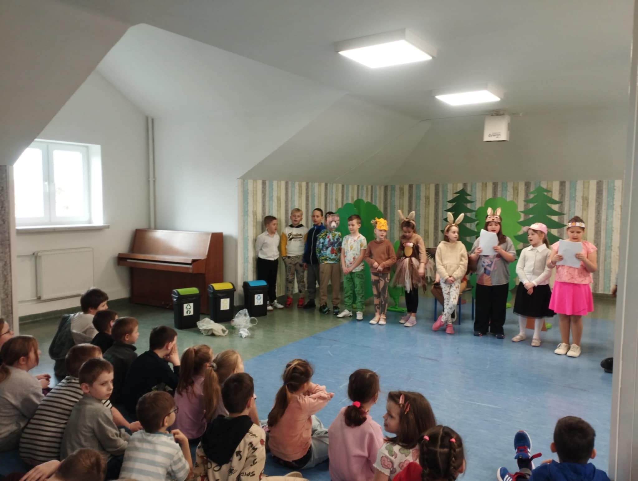 W ramach realizacji bloku tematycznego “Jesteśmy uczestnikami kultury” uczniowie klas drugich przygotowali i zaprezentowali przedstawienia teatralne, demonstrując swoje zaangażowanie oraz kreatywność. Klasa 2a przedstawiła spektakl pt. “Leśna opowieść”, koncentrujący się na tematyce ochrony lasów i zwierząt. Uczniowie nie tylko opanowali swoje role, ale również zadbali o odpowiednie stroje, co wzbogaciło wizualny aspekt przedstawienia. Klasa 2b zaprezentowała teatr cieni zatytułowany “Zaczarowana filiżanka”. Scenariusz tej sztuki został stworzony przez uczennicę Ninę Tajer. Uczniowie samodzielnie przygotowali kukiełki oraz podzielili między siebie role, co świadczy o ich inicjatywie i zdolnościach organizacyjnych. Obie klasy miały okazję 24 marca wystąpić przed publicznością składającą się z przedszkolaków z Przedszkola Gminnego a następnie przed uczniami klas pierwszych i trzeciej. Takie wydarzenia nie tylko rozwijają umiejętności artystyczne uczniów, ale również uczą ich współpracy, odpowiedzialności oraz pozwalają na aktywne uczestnictwo w życiu kulturalnym szkoły.