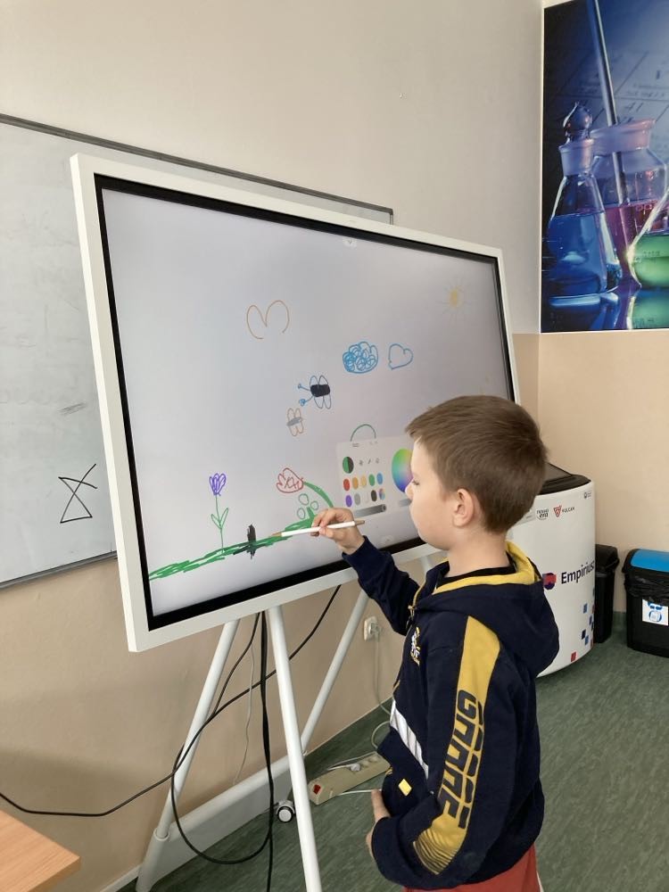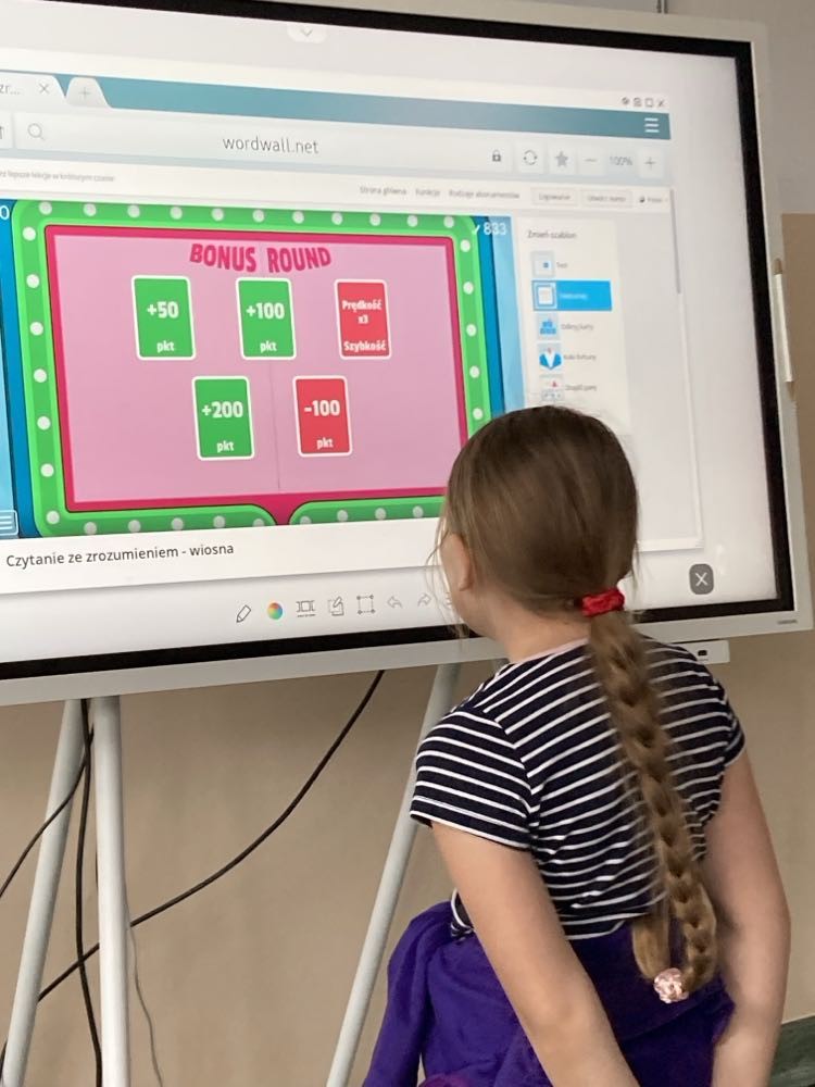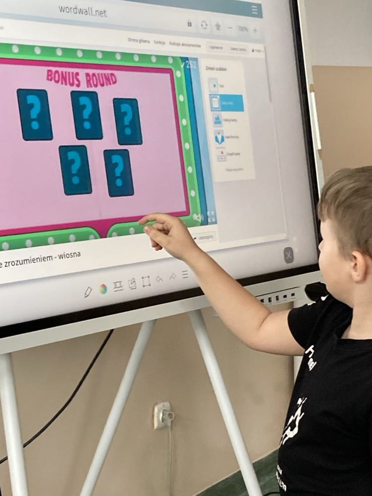 Podczas lekcji edukacji polonistycznej uczniowie klas drugich doskonalili umiejętność czytania ze zrozumieniem, pracując z tekstem o tematyce wiosennej. Zajęcia odbyły się w szkolnym Laboratorium Przyszłości, gdzie wykorzystano nowoczesne technologie edukacyjne, takie jak tablica interaktywna. Korzystając z platformy Wordwall uczniowie rozwiązywali quizy i zagadki związane z wiosną i wspólnie stworzyli rysunek przedstawiający zwiastuny wiosny. Wykorzystanie nowoczesnych technologii oraz interaktywnych narzędzi dydaktycznych podczas lekcji przyczyniło się do zwiększenia zaangażowania uczniów, ułatwiło im przyswajanie wiedzy oraz rozwinęło ich kompetencje cyfrowe.