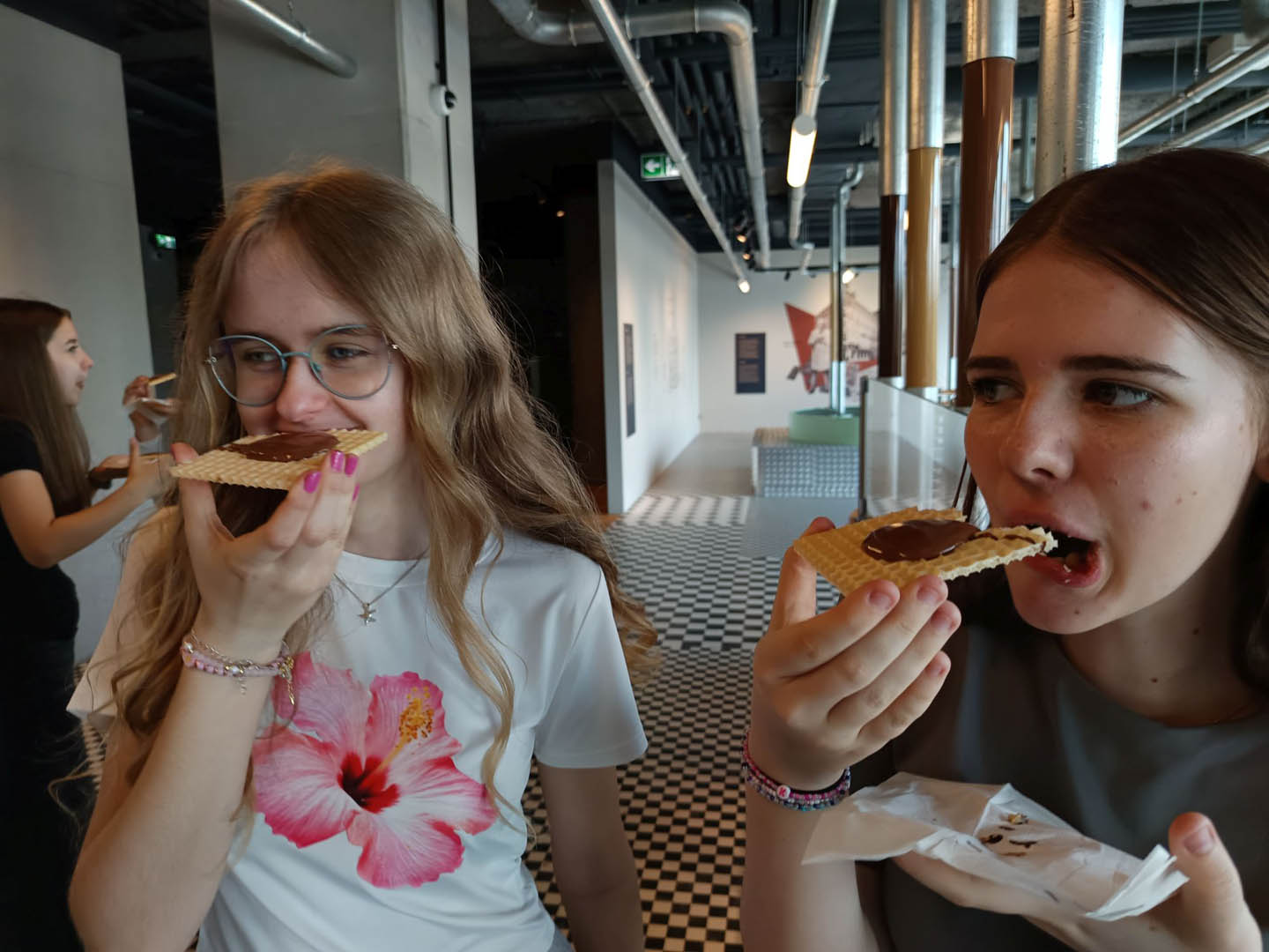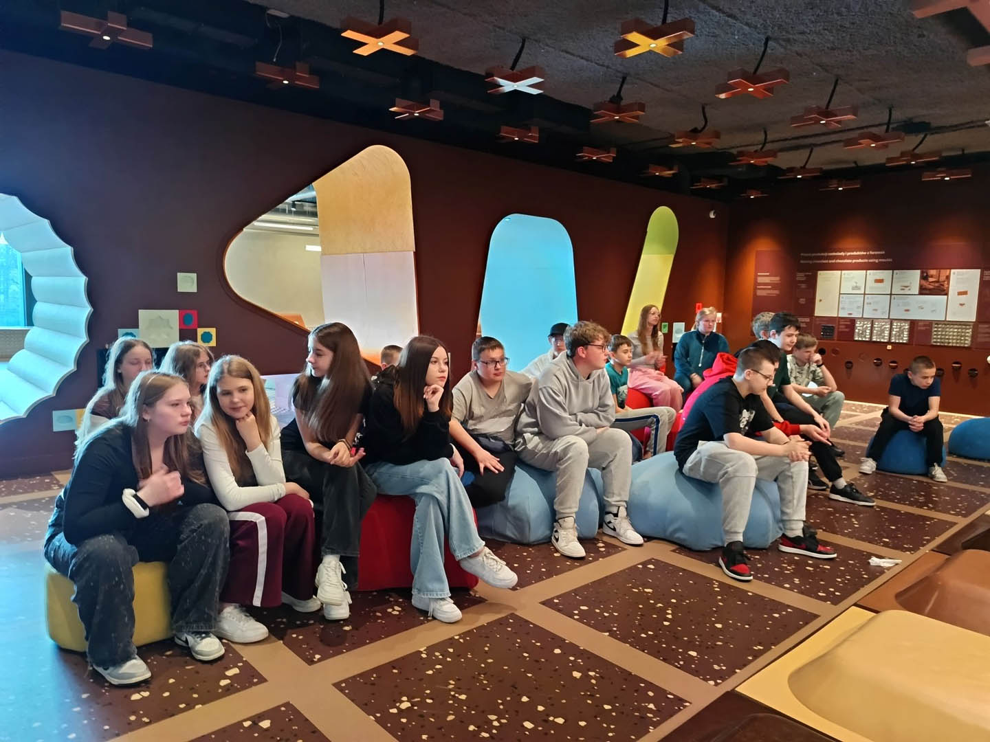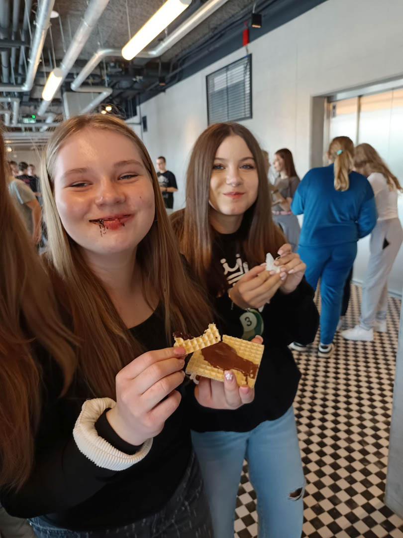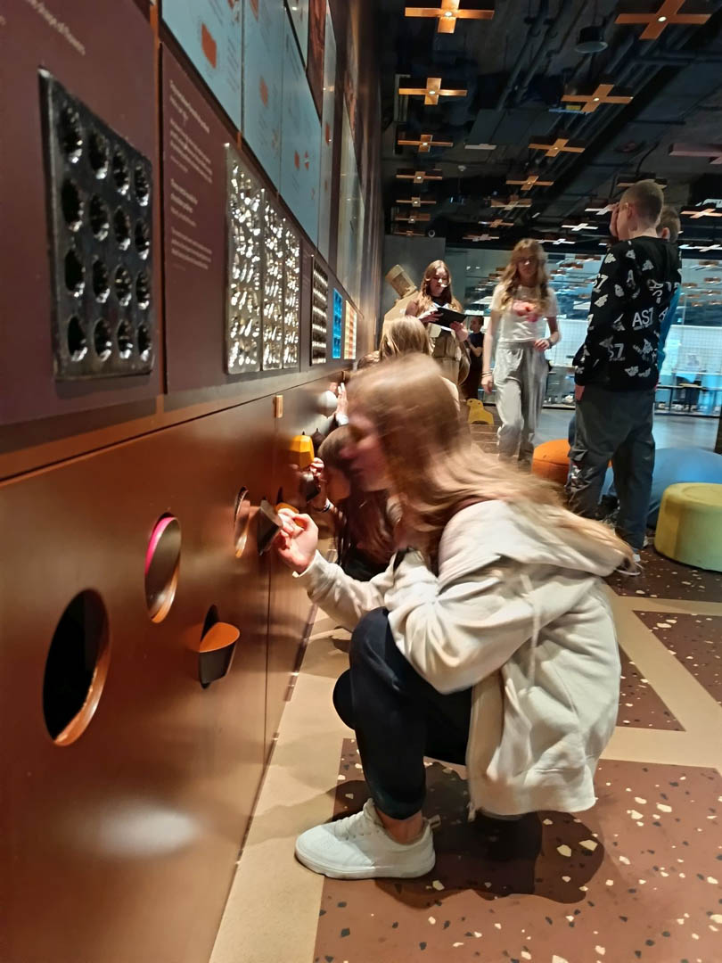 A po obiedzie przyszedł czas na deser. A jeśli deser, to tylko czekoladowy z Fabryki E. Wedla. Znajduje się tam Muzeum Czekolady, które było kolejnym punktem programu wycieczki. Uczniowie dowiedzieli się, jak krok po kroku produkuje się ten przysmak, sami mogli uruchomić wirtualną linię produkcyjną, posmakować zarówno surowych ziaren kakaowca, jak i różnych rodzajów wyrobów. Sprawdzili się nawet w roli projektantów opakowań słodyczy. Po wysiłku (Muzeum Czekolady daje możliwość odbierania wrażeń wszystkimi zmysłami) mogli odpocząć w sali relaksu na pufach w kształcie… ptasiego mleczka. Na zakończenie wycieczki podsumowali swoje wrażenia, podziwiając panoramę miasta z tarasu widokowego na dachu fabryki.