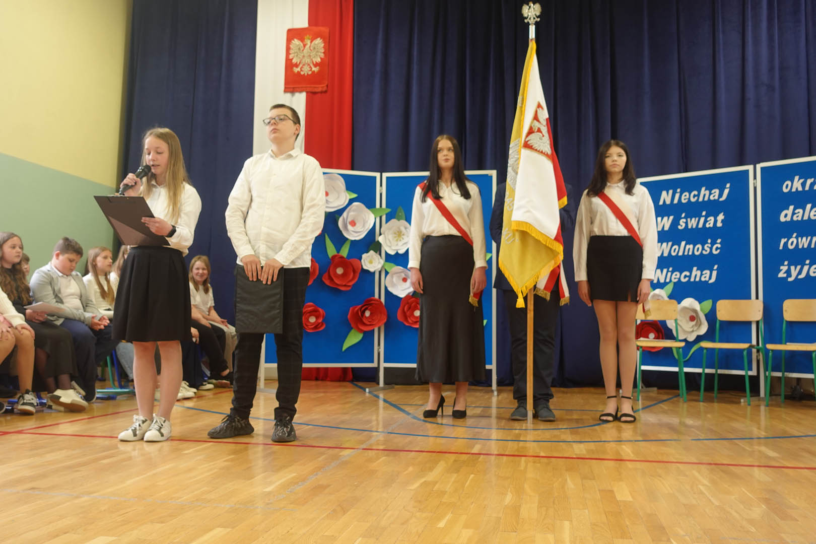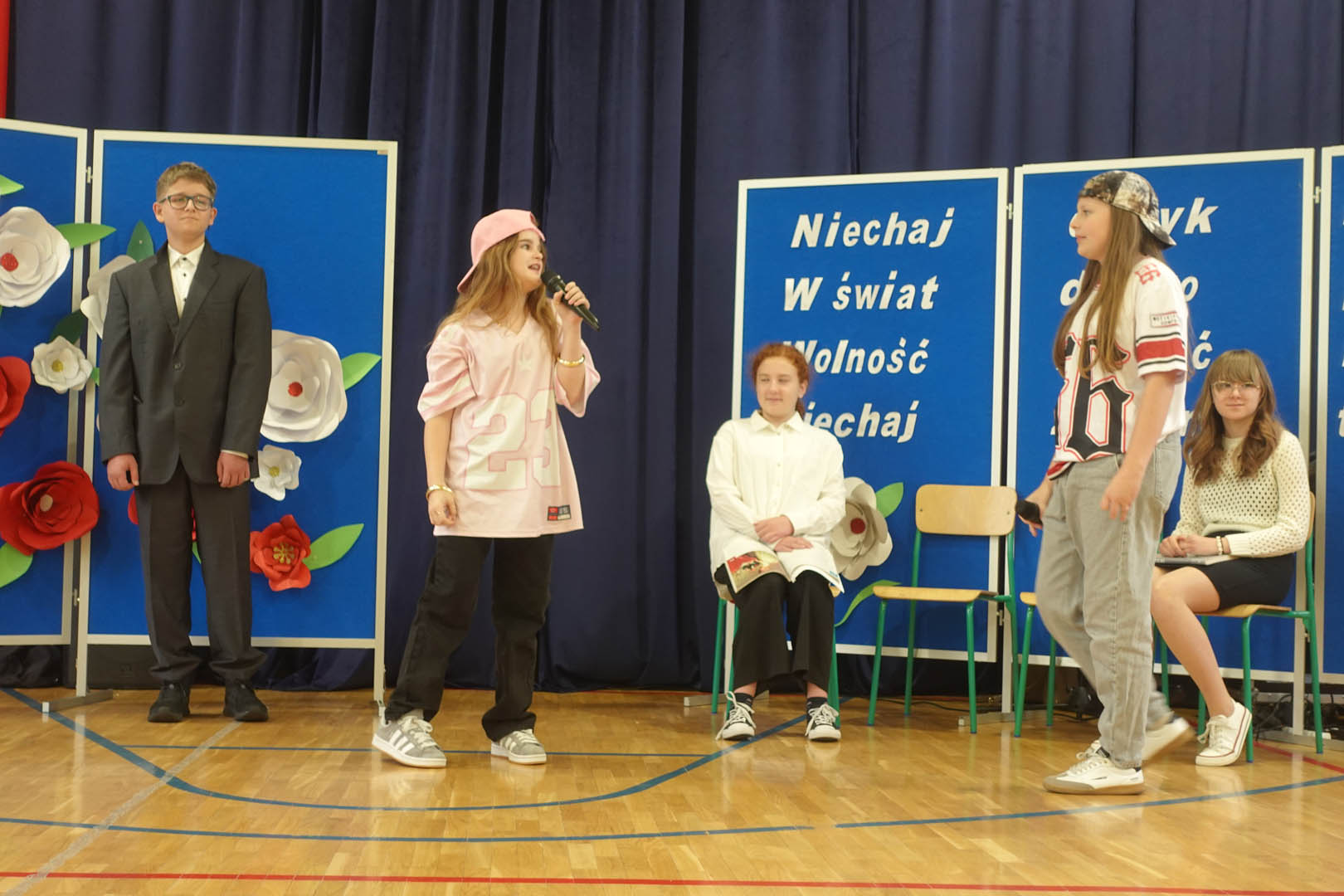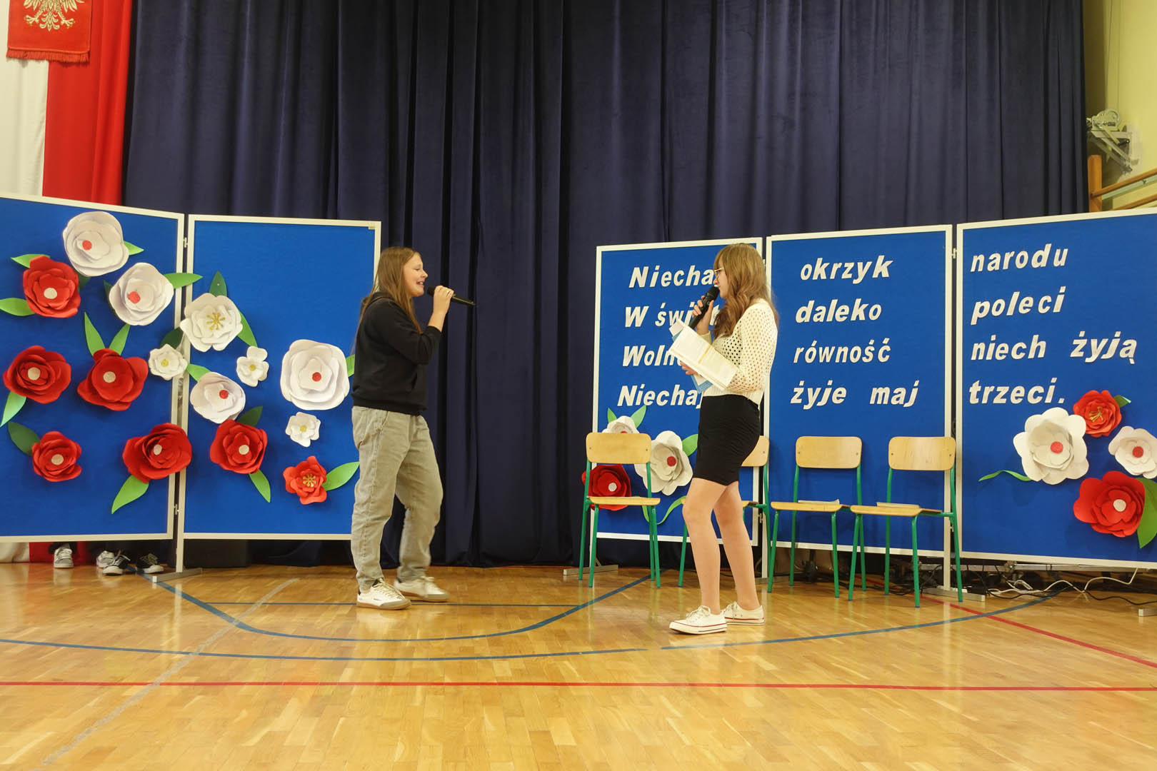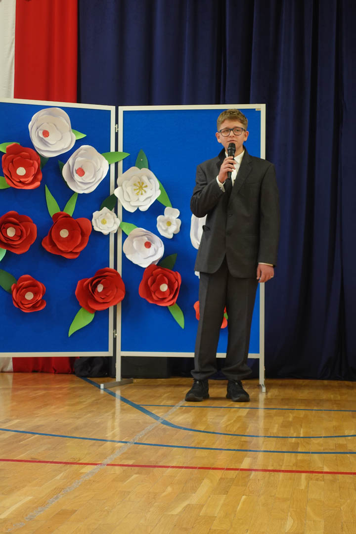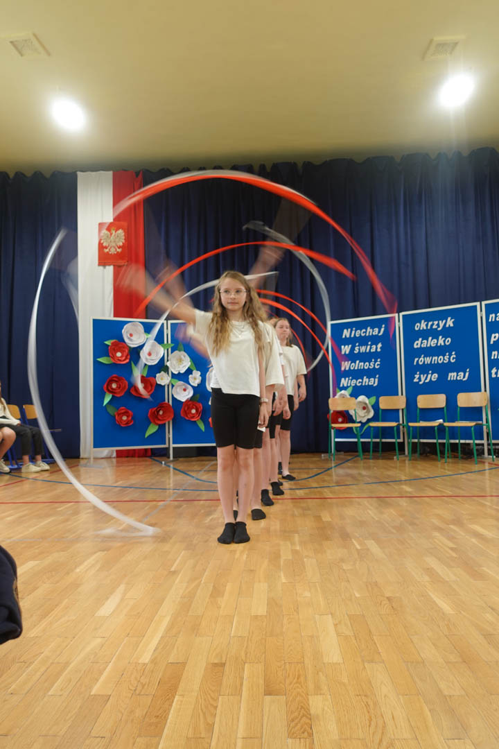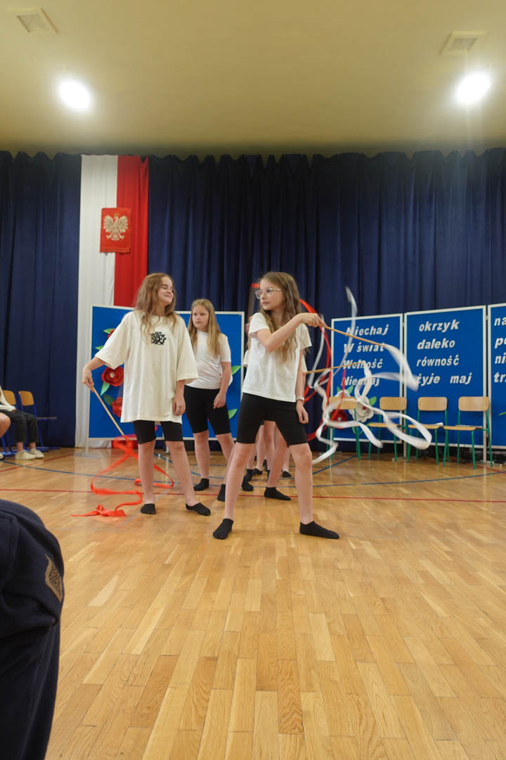 6 maja w naszej szkole uczciliśmy 234. rocznicę uchwalenia Konstytucji 3 Maja. Z tej okazji odbył się uroczysty apel, w którym wystąpili przedstawiciele prawie wszystkich klas. Bohaterami scenki byli uczniowie, którzy zastanawiali się, jak w krótkim czasie przygotować się do klasówki z historii. W zabawny sposób odnieśli się do niewielkiej wiedzy Polaków na temat tego święta. I w tym momencie pojawił się marszałek Stanisław Małachowski, który opowiedział o okolicznościach uchwalenia ustawy zasadniczej. Uczennice klasy V a przedstawiły rapową piosenkę nawiązującą do tych wydarzeń. O oprawę muzyczną zadbały uczennice klas ósmych wraz z czwartoklasistami. Dopełnieniem artystycznych wrażeń był taneczny występ uczennic piątych klas z biało – czerwonymi wstążkami.