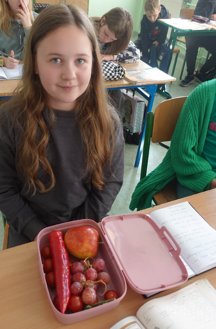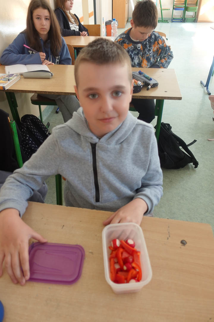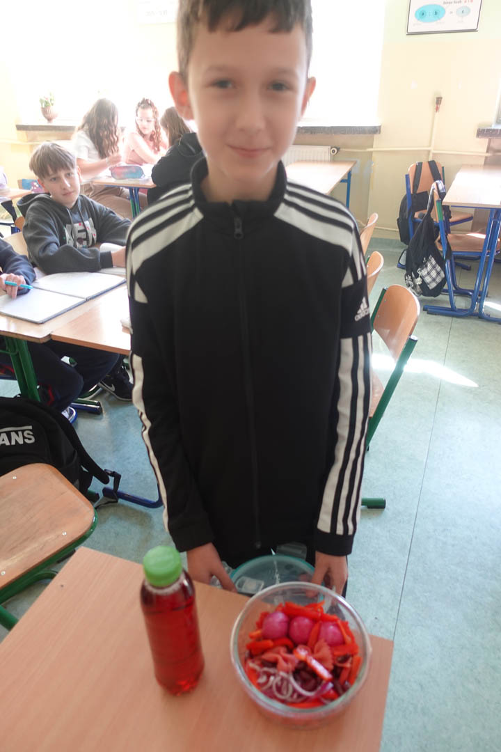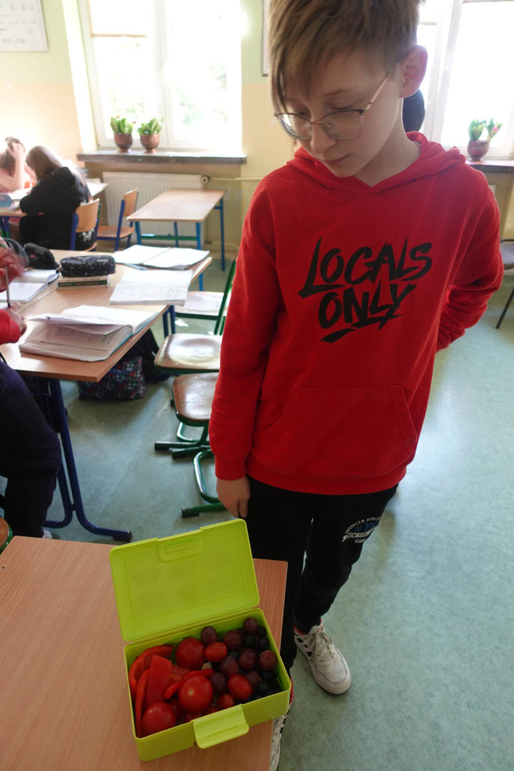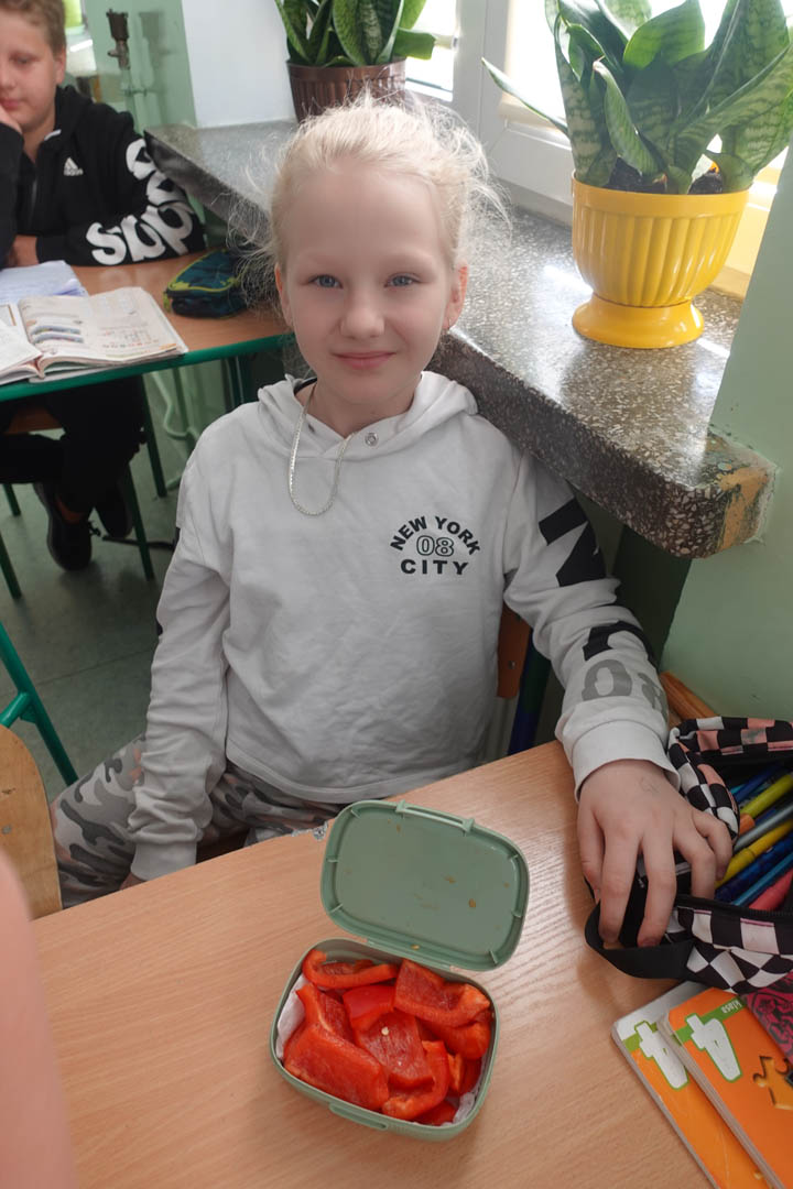 Za nami kolejna Kolorowa Środa, która tym razem rozświetliła szkolne sale soczystym kolorem czerwonym! Uczniowie przynieśli ze sobą zdrowe przekąski w odcieniach czerwieni – na talerzach pojawiły się m.in. truskawki, maliny, jabłka, pomidory, papryka, arbuzy oraz grejfruty.