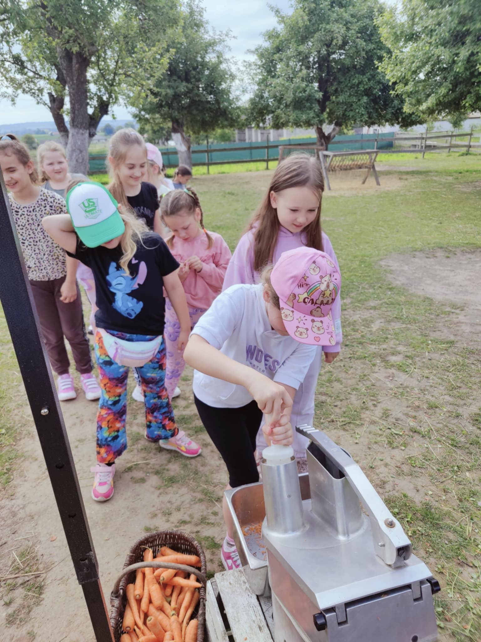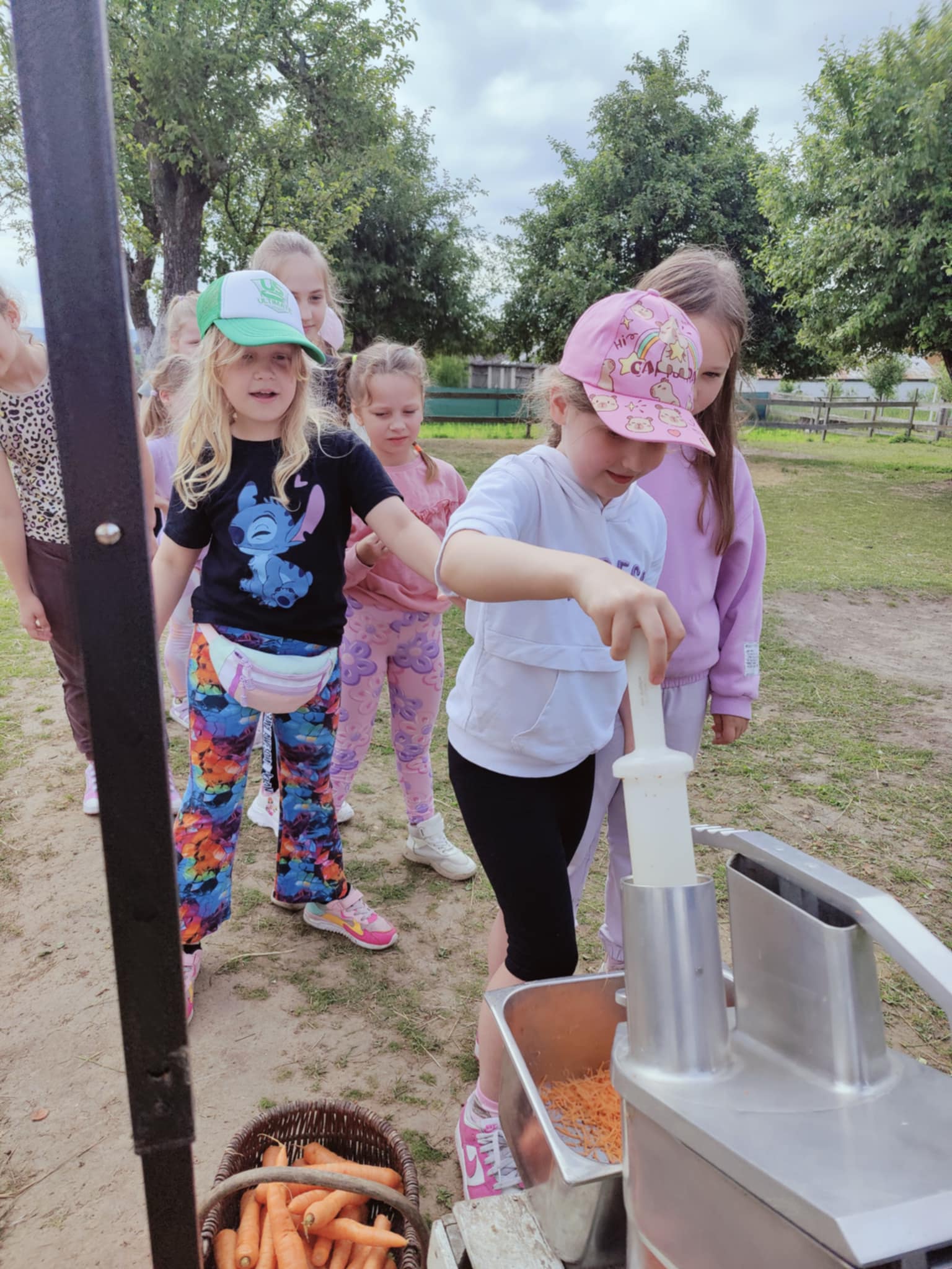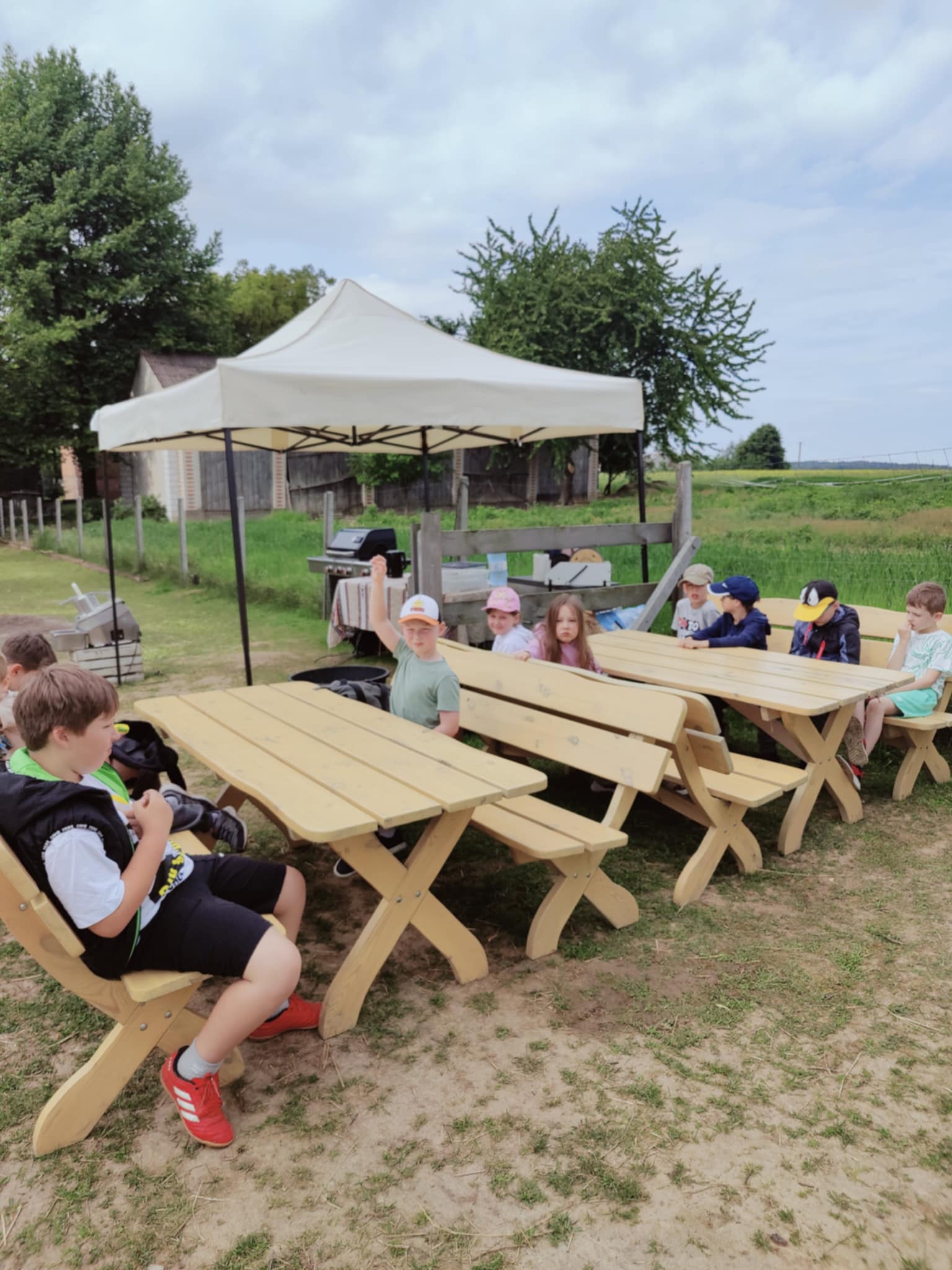 Po pełnym wrażeń poranku przyszedł czas na wspólny grill na świeżym powietrzu. Aromatyczne kiełbaski i domowe przysmaki smakowały wyśmienicie w otoczeniu zieleni i wesołego gwaru. Była to doskonała okazja do integracji i odpoczynku.