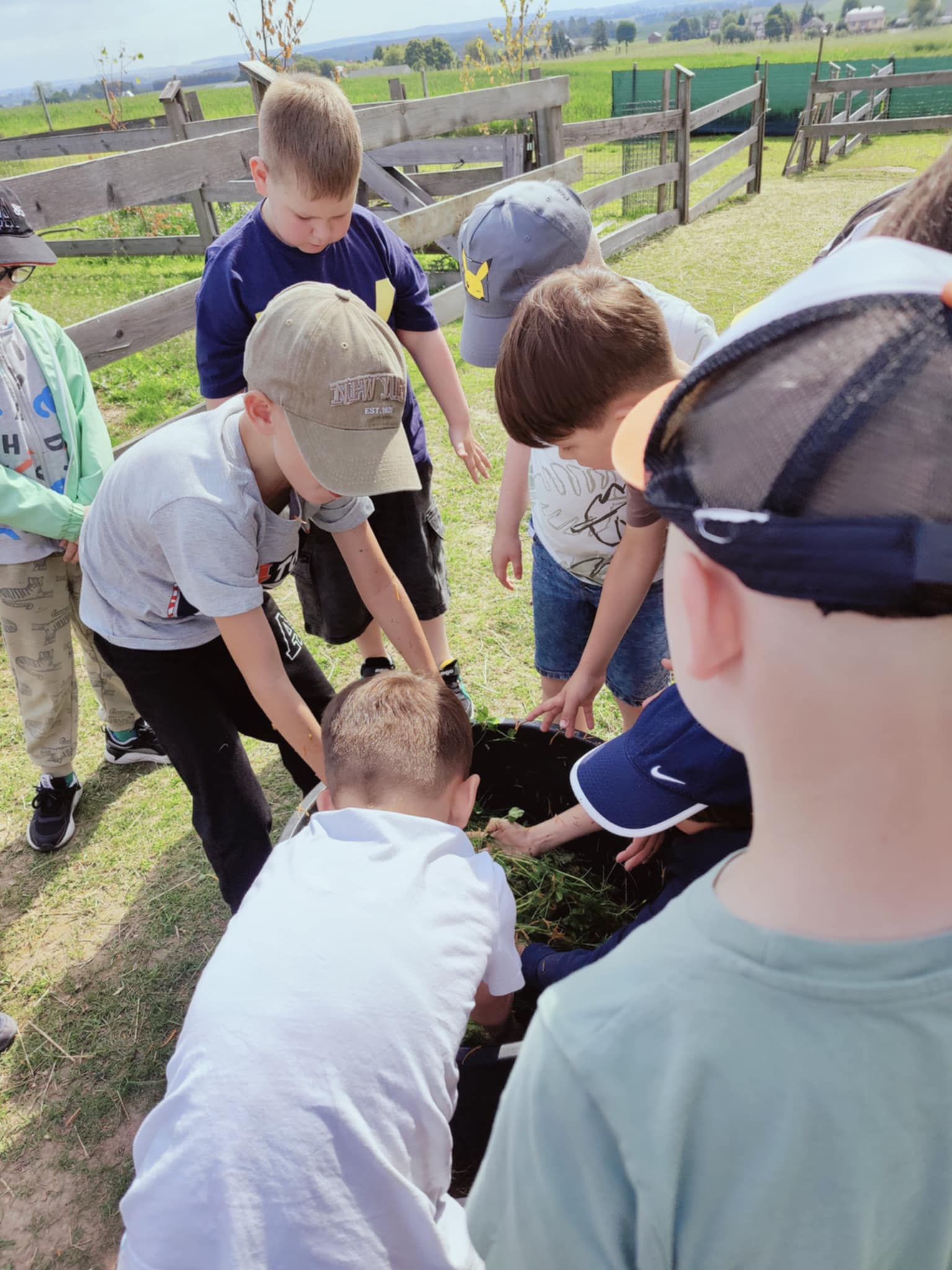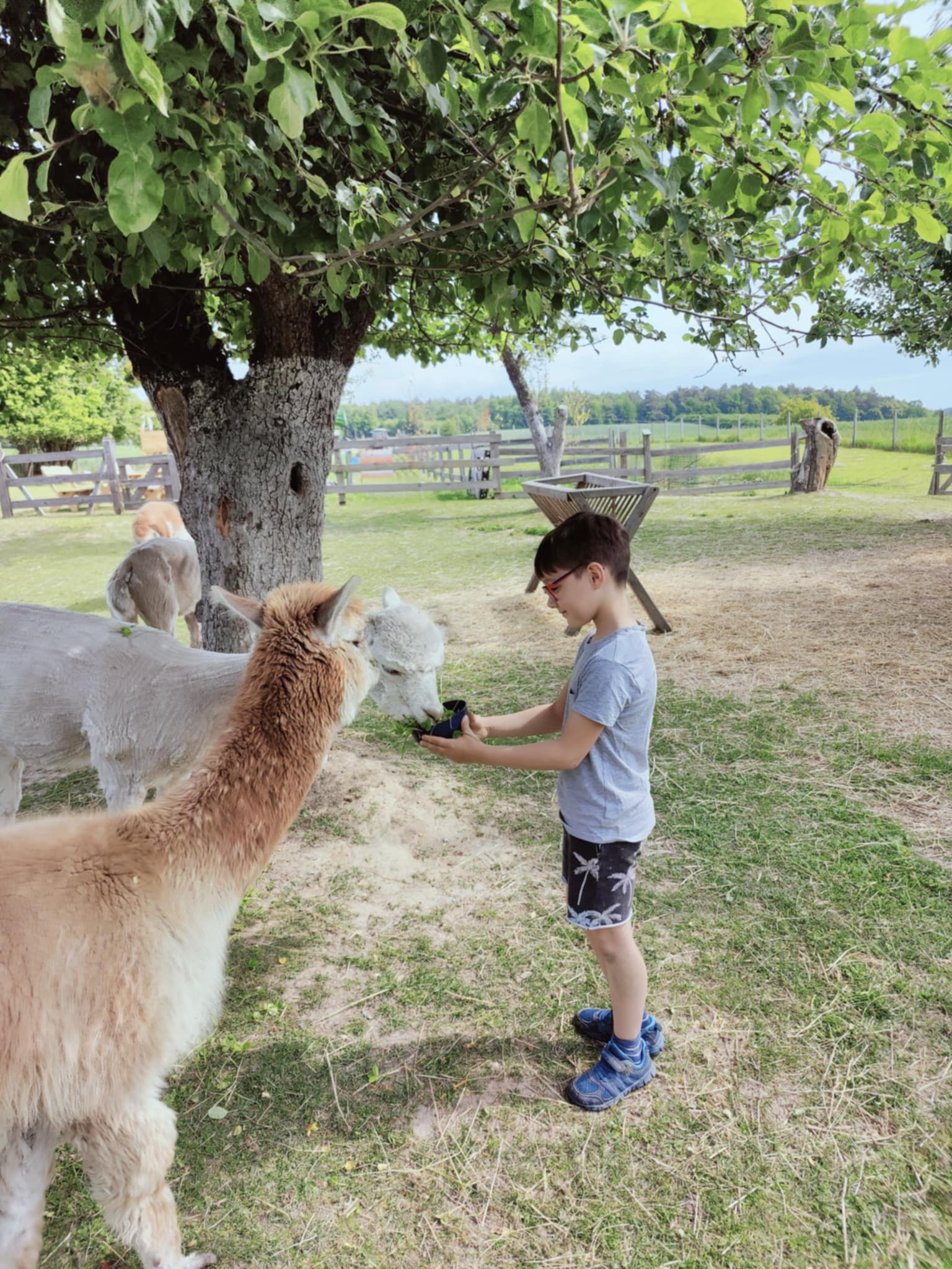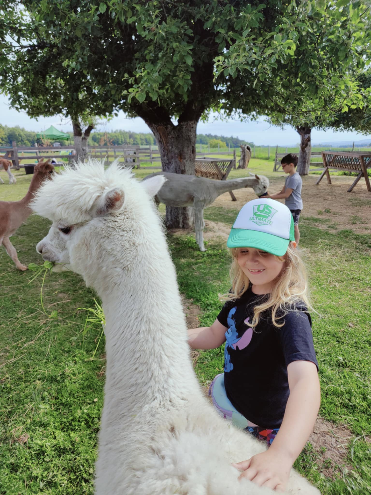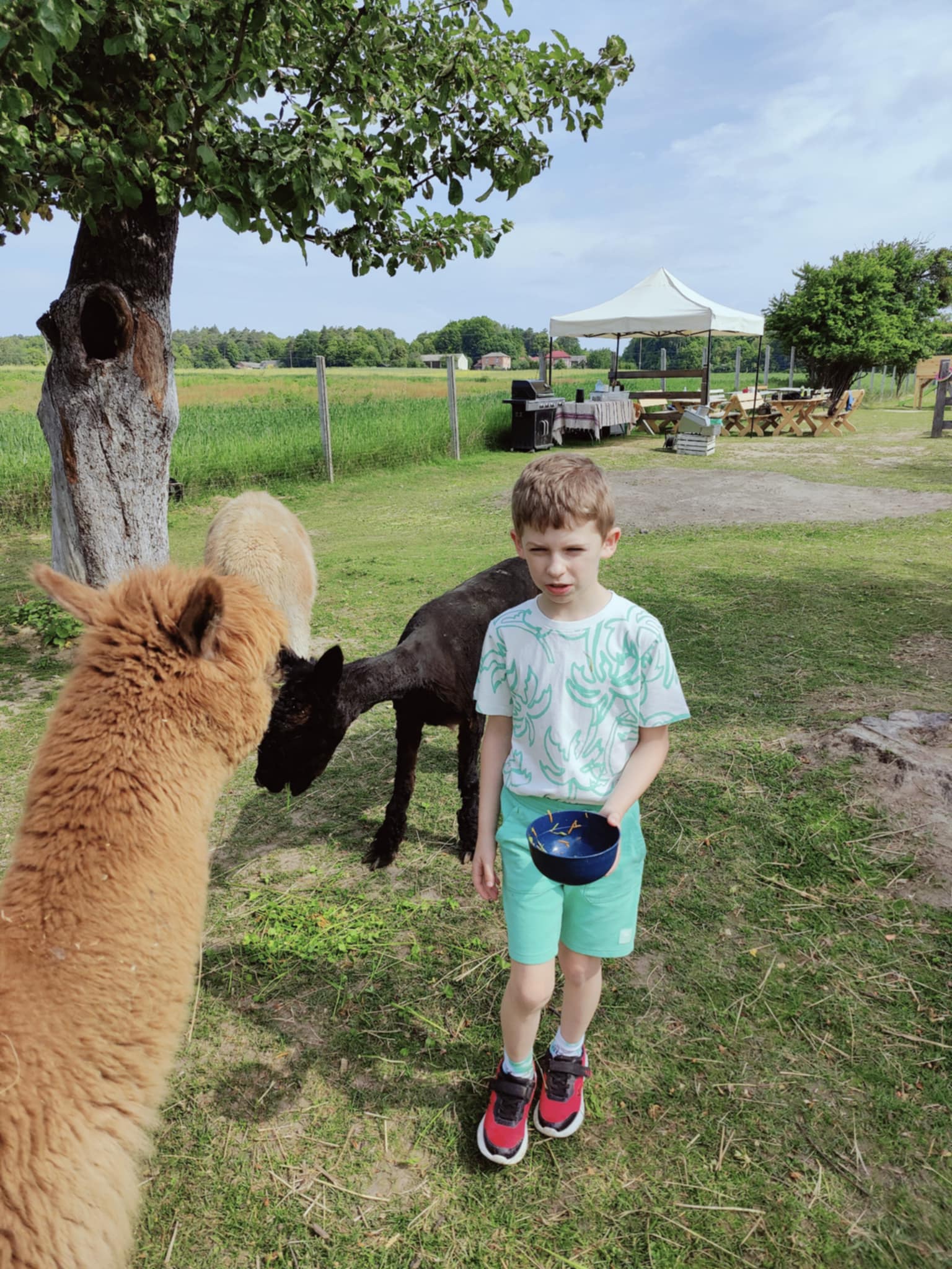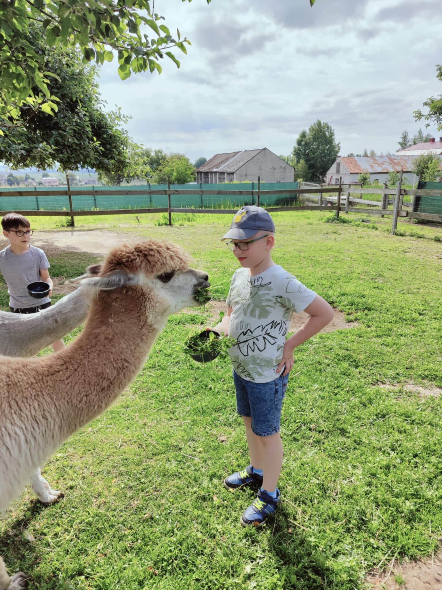 Dzieci miały również możliwość bezpośredniego kontaktu ze zwierzętami – mogły je karmić, głaskać, a nawet spacerować z nimi po terenie gospodarstwa. Dla wielu uczniów była to pierwsza taka bliska i bezpośrednia styczność z alpakami, która dostarczyła im mnóstwo radości i niezapomnianych wrażeń.