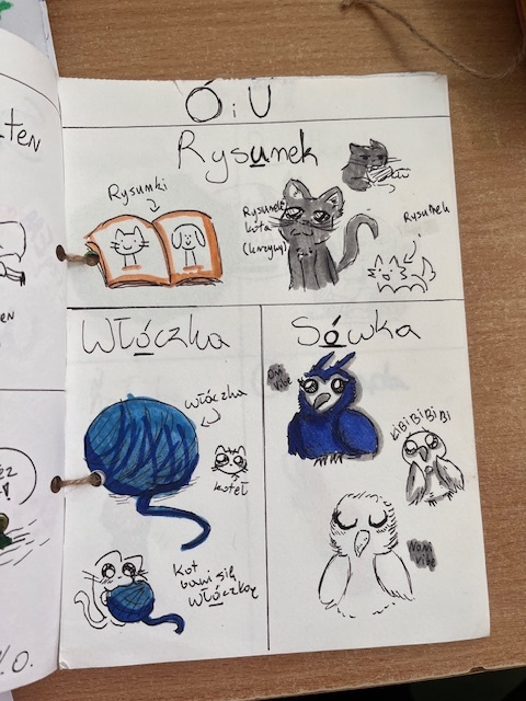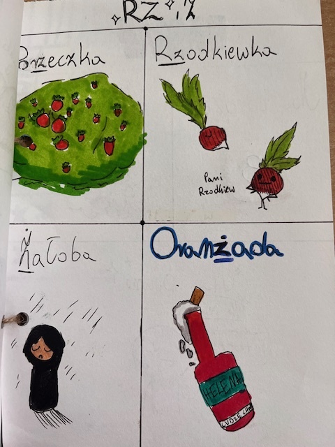 W drugim semestrze uczniowie kontynuowali pracę nad projektem, rozwijając swoje słowniczki o nowe hasła i wzbogacając je o dodatkowe elementy, takie jak rymowanki, zasady pisowni, kreatywne ilustracje. Efektem tej kontynuacji było nie tylko pogłębienie znajomości zasad ortograficznych, lecz także wzrost pewności siebie w posługiwaniu się poprawną polszczyzną. Rozbudowane słowniczki posłużą teraz jako nietypowa pomoc dydaktyczna.