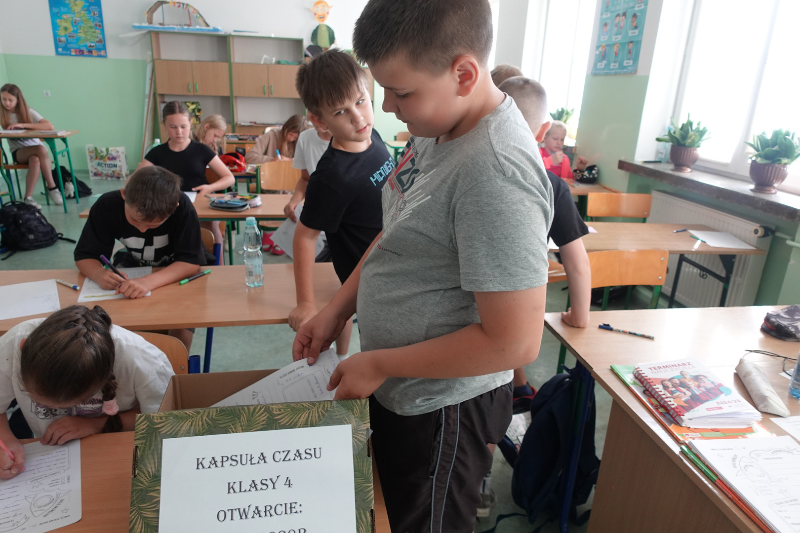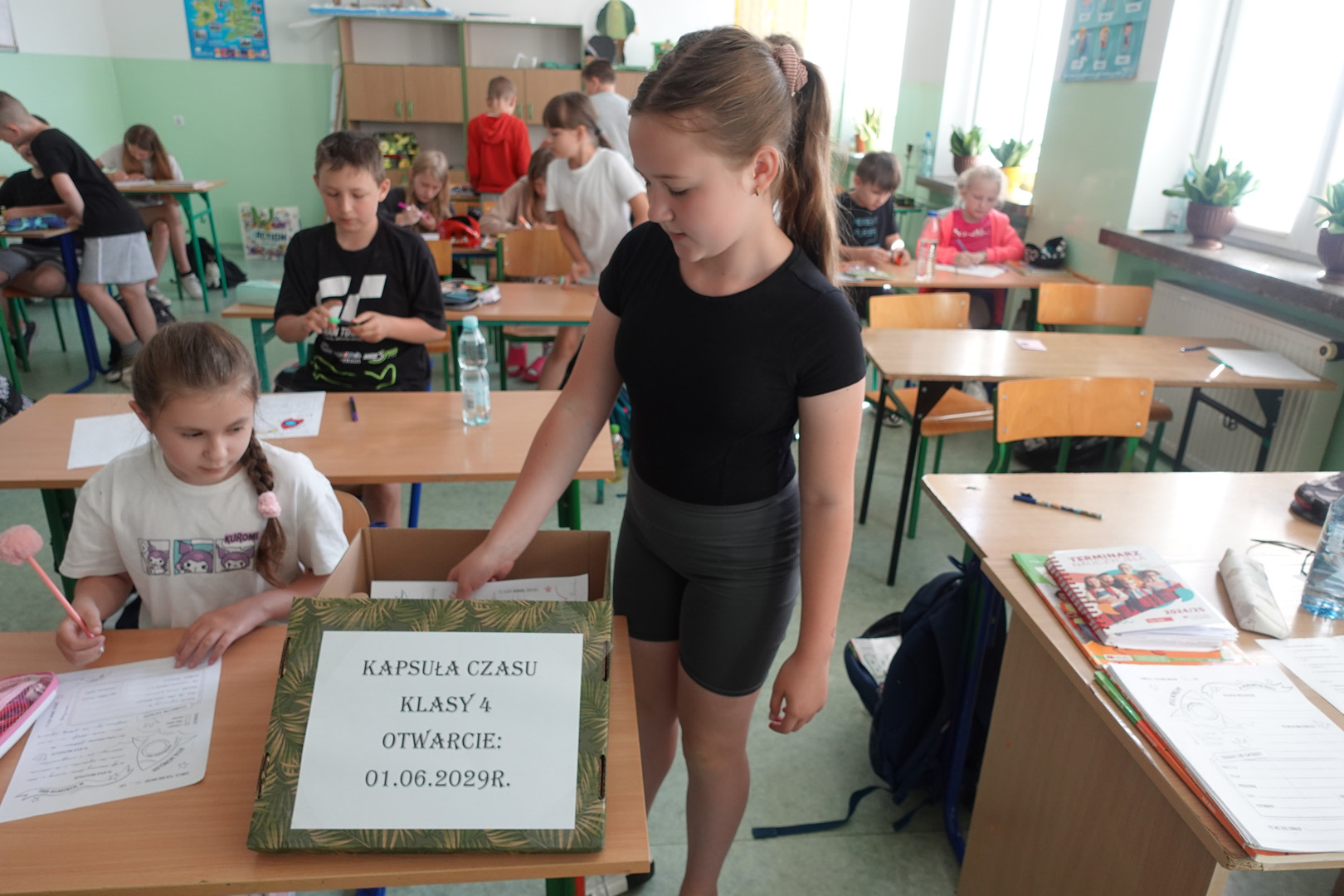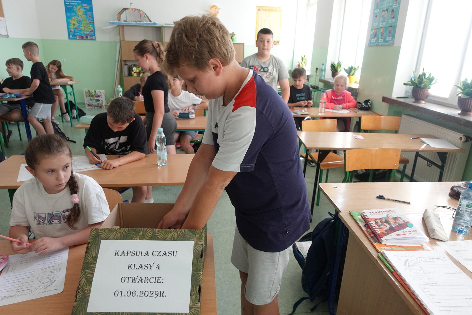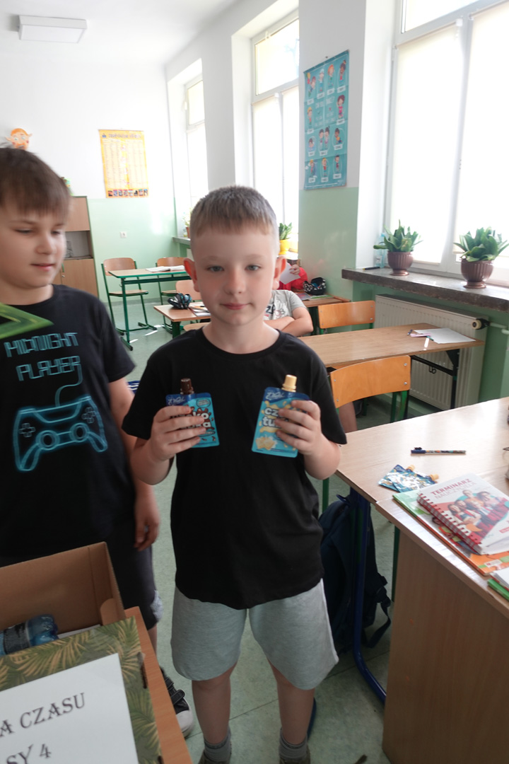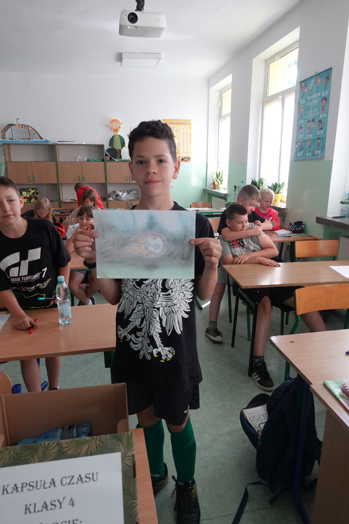 Kapsuła czasu to specjalny pojemnik, do którego wkłada się różne przedmioty i informacje, by po wielu latach móc je odnaleźć i porównać z rzeczywistością. Uczniowie klasy 4 postanowili przygotować własną kapsułę, którą planują otworzyć dopiero w roku 2029- a więc, gdy będą w klasie 8. Każdy uczeń włożył do kapsuły coś osobistego. Były to m.in.: listy do przyszłych siebie, w których dzieci opisały swoje marzenia, ulubione zajęcia i aktualne zainteresowania, portrety uczniów, ulubione rysunki i prace plastyczne, wycinki z gazet, pokazujące, co działo się w świecie w 2025 roku, a także drobne pamiątki codzienności, jak opakowania po ulubionych przekąskach czy własnoręcznie wykonane przedmioty. Prace nad kapsułą trwały kilka dni – uczniowie samodzielnie spisywali swoje wspomnienia i wybierali najcenniejsze pamiątki. Z pomocą wychowawcy wszystko zostało bezpiecznie zapakowane i zapieczętowane. Następnie kapsuła została uroczyście umieszczona w specjalnie przygotowanym miejscu w sali, oznaczonym tabliczką z datą otwarcia.