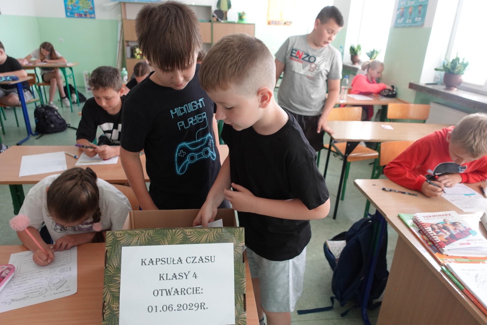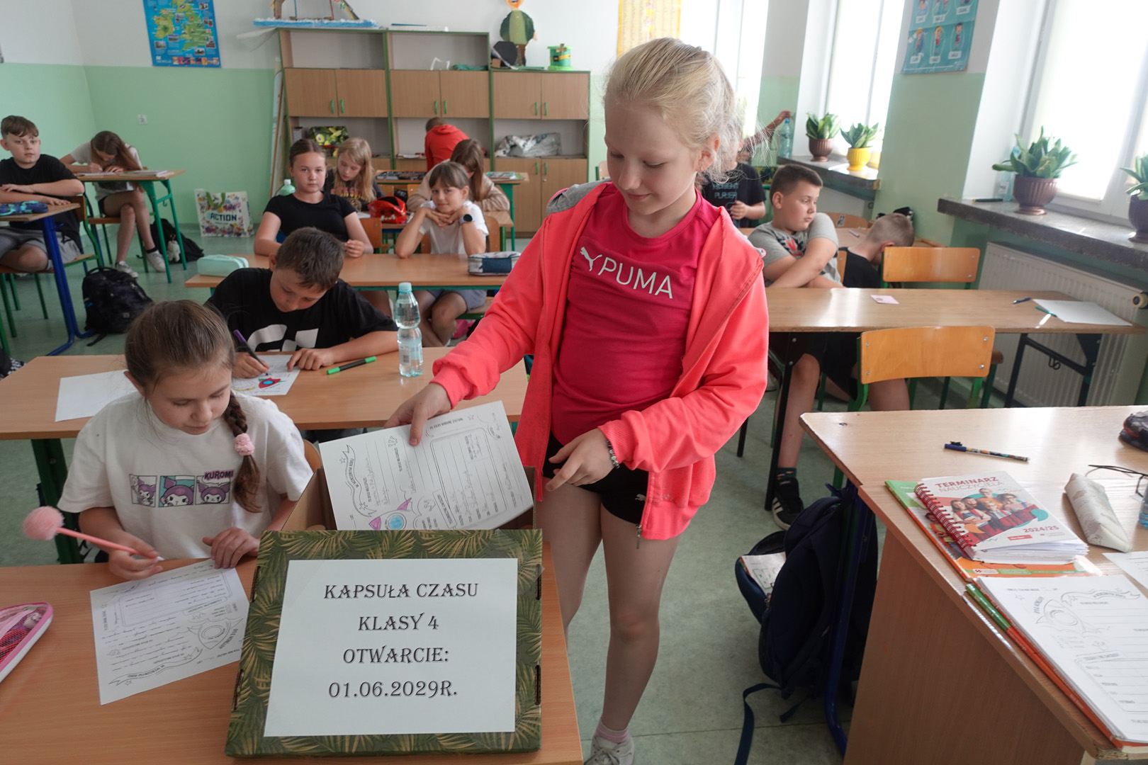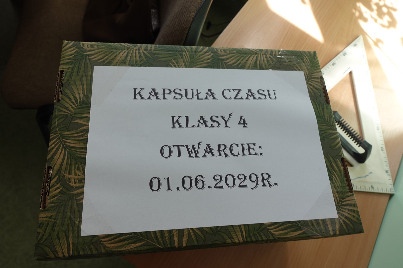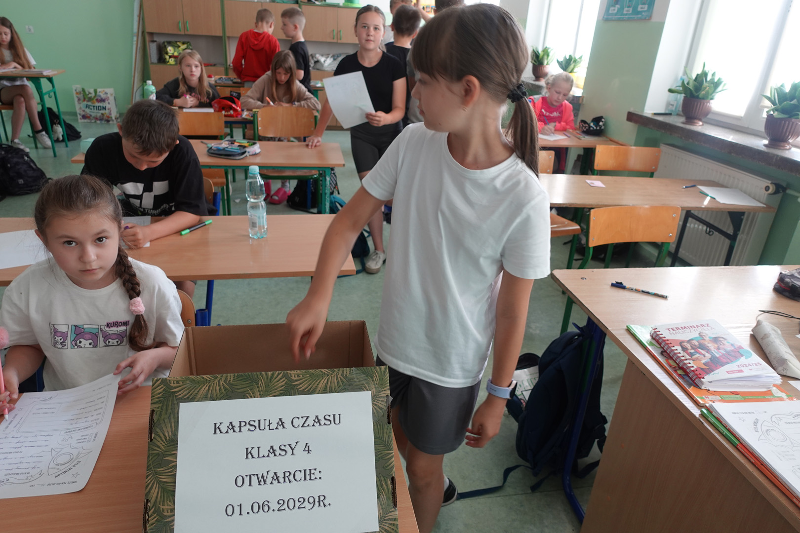Kapsuła czasu to specjalny pojemnik, do którego wkłada się różne przedmioty i informacje, by po wielu latach móc je odnaleźć i porównać z rzeczywistością. Uczniowie klasy 4 postanowili przygotować własną kapsułę, którą planują otworzyć dopiero w roku 2029- a więc, gdy będą w klasie 8. Każdy uczeń włożył do kapsuły coś osobistego. Były to m.in.: listy do przyszłych siebie, w których dzieci opisały swoje marzenia, ulubione zajęcia i aktualne zainteresowania, portrety uczniów, ulubione rysunki i prace plastyczne, wycinki z gazet, pokazujące, co działo się w świecie w 2025 roku, a także drobne pamiątki codzienności, jak opakowania po ulubionych przekąskach czy własnoręcznie wykonane przedmioty. Prace nad kapsułą trwały kilka dni – uczniowie samodzielnie spisywali swoje wspomnienia i wybierali najcenniejsze pamiątki. Z pomocą wychowawcy wszystko zostało bezpiecznie zapakowane i zapieczętowane. Następnie kapsuła została uroczyście umieszczona w specjalnie przygotowanym miejscu w sali, oznaczonym tabliczką z datą otwarcia.